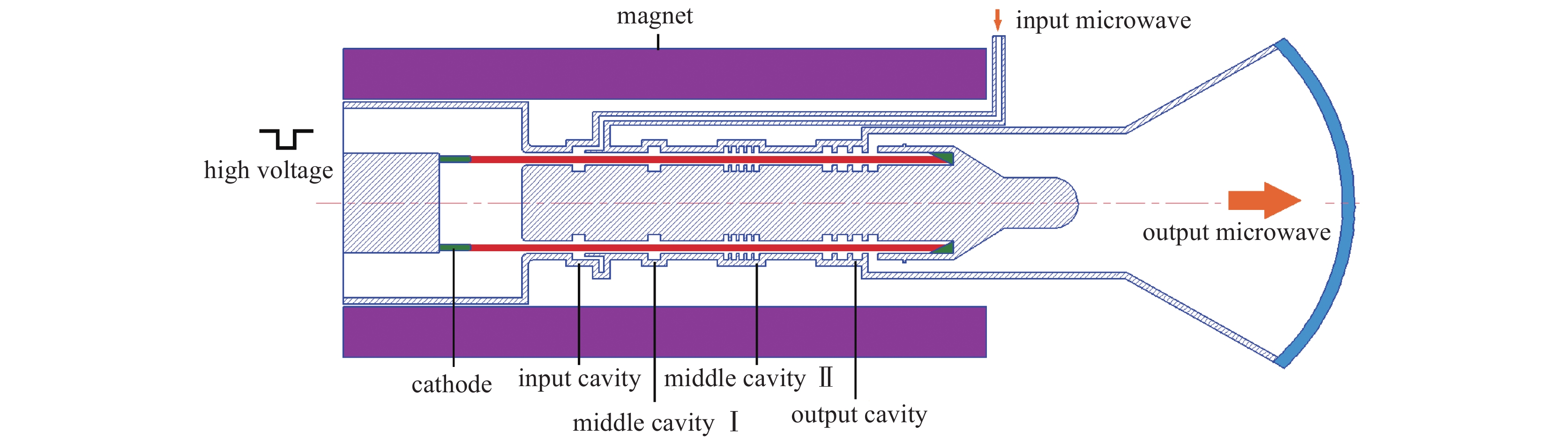 High-frequency relativistic klystron amplifier is one of the research hotspots in the field of high power microwave in recent years, and its development is mainly limited by mode competition, phase jitter and low efficiency. This paper presents the design of a novel Ku-band radial-line klystron amplifier, which consists of an input cavity, two groups of double-gap bunching cavities and a three-gap extraction cavity. By comparing the coupling coefficient of single-gap bunching cavity with that of non-uniform double-gap bunching cavities, it is proved that non-uniform double-gap bunching cavity has stronger modulation ability to the electron beam. The working mode of non-uniform double-gap bunching cavity with a TEM reflector is TM01-π mode, which has a large Q value and benefit from energy isolation between resonant cavities. When the injection power is only 10 kW, the modulation depth of fundamental current is about 110% by cascading two groups of double-gap cavities. PIC simulationshows that this device has high efficiency. When electron beam voltage is 400 kV, beam current is 5 kA and magnetic field is only 0.4 T, high power microwaves with frequency of 14.25 GHz and output power of 825 MW are obtained.