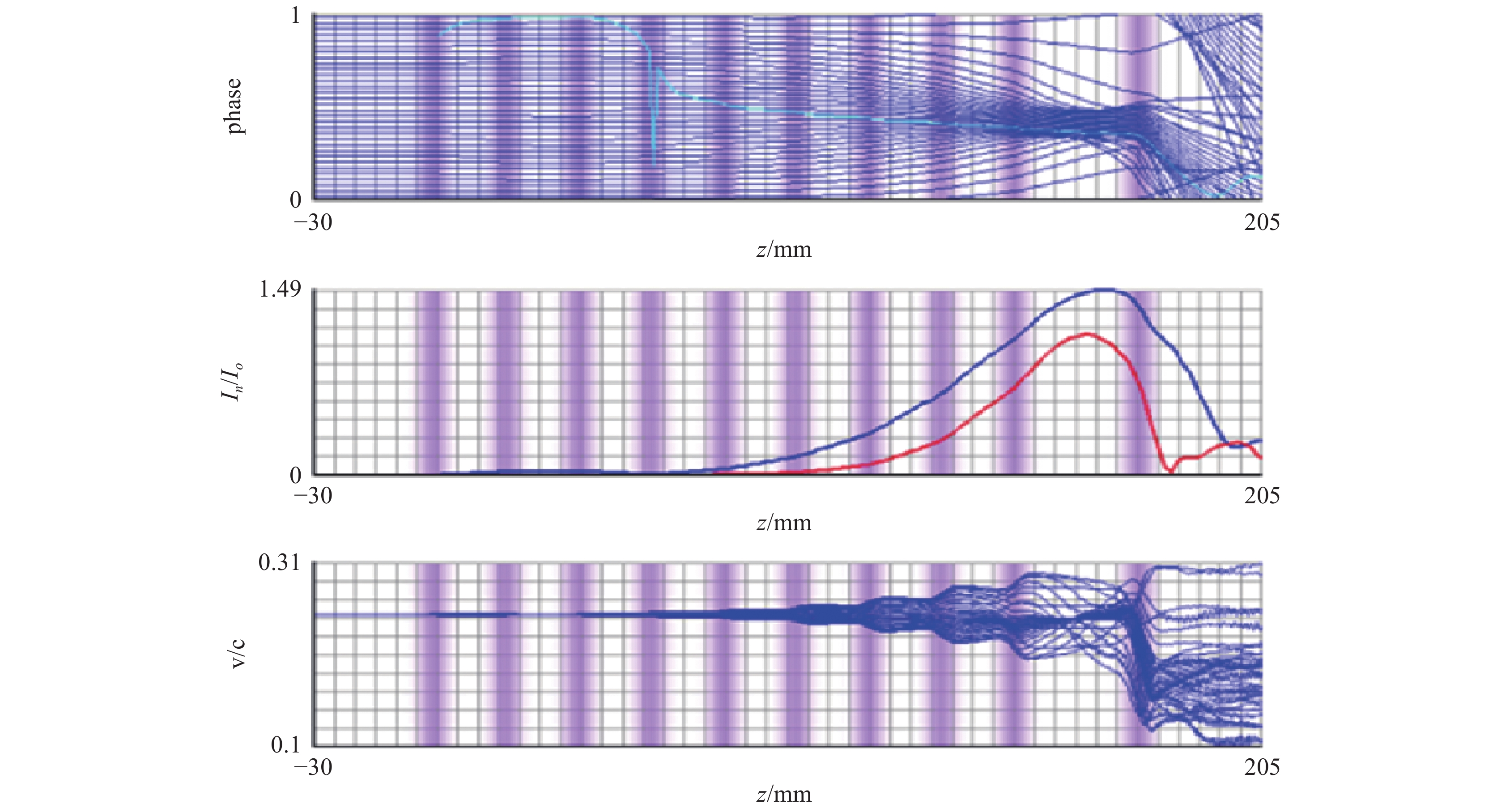 This paper applies the theory of kinematics and space charge wave to conclude an experiential formula for calculating the phase of the modulated current at the entrance of the gap of the middle cavity. It also applies a nonlinear theory of cavity excitation by modulated electron beam to calculate the amplitude and the phase of the gap voltage of the middle cavity and the output cavity, and presents an experimential formula for calculating the phase of the modulated current at the entrance of the gap of the output cavity. With these theories and 2D PIC, it estimates the phase of the modulated current at the entrance of the gap of the middle cavity and the output cavity as well as the amplitude and the phase of gap voltage in the middle cavity and the output cavity. The errors of the phase of the modulated current at the entrance of the gap of the middle cavity and the output cavity are 2.627° (model 1) and 3.857° (model 2); the relativistic errors of the amplitude of gap voltage in the middle cavity and the output cavity are 1.47% and 5.42%, the error of the phase of gap voltage in the middle cavity are 4.017° (model 2) and 5.427° (model 3), and the error of the phase of gap voltage in the output cavity is 12.32°. Finally, the paper analyzes the phase of the modulated current versus the propagation distance in three models by 2D PIC simulation.