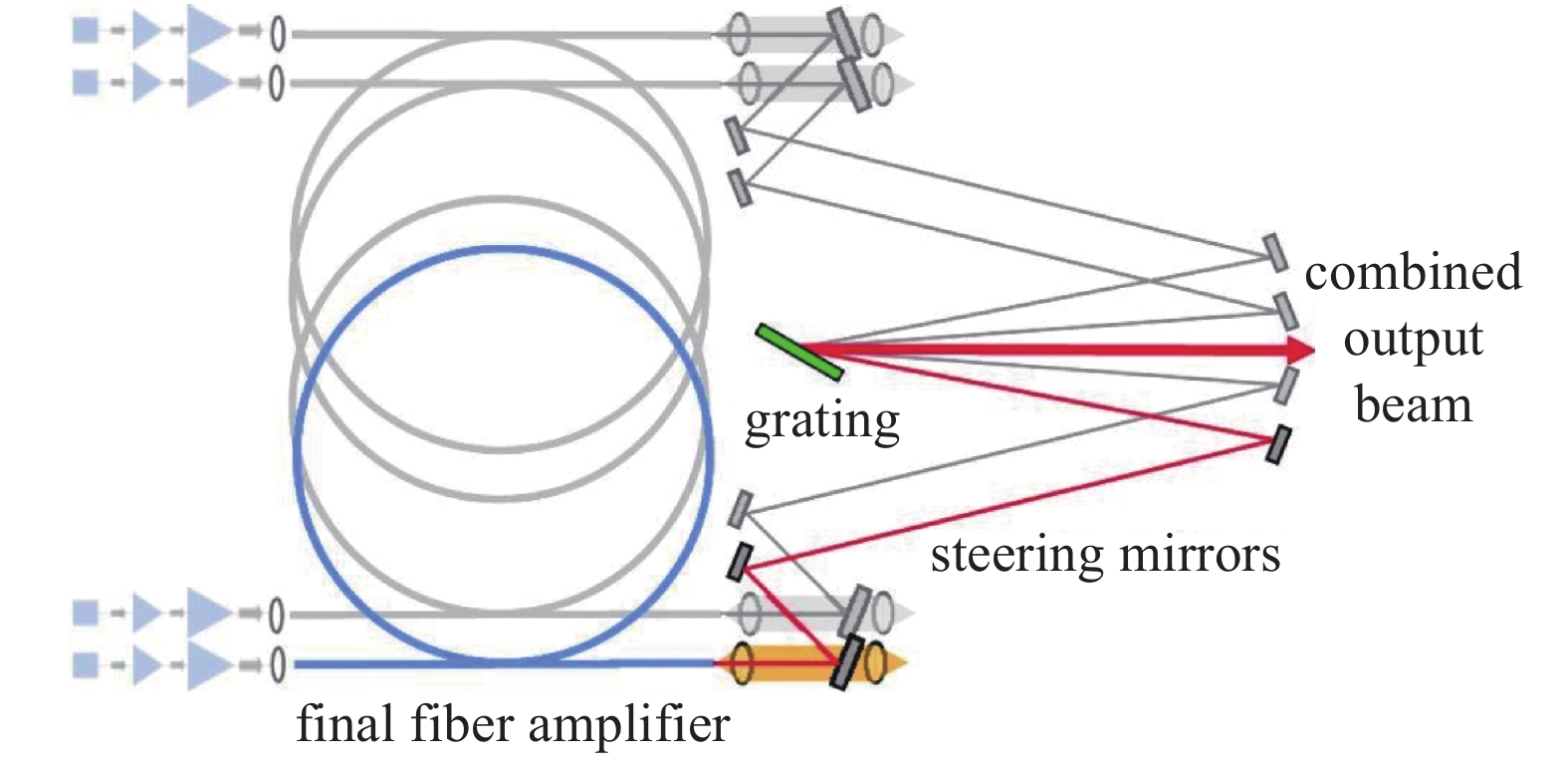 =6°. The combining efficiency of the output beam which was composited by two unit beams (wavelength equals to 1050.24 nm and 1064.33 nm respectively) with incident polar angle θ of 43.99° was 92.9%, 8.8% higher than that of approach based on non-conical diffraction. The beam quality factor after combining were Mx2=1.204 and My2=1.467, which were almost equivalent to that of approach based on non-conical diffraction.