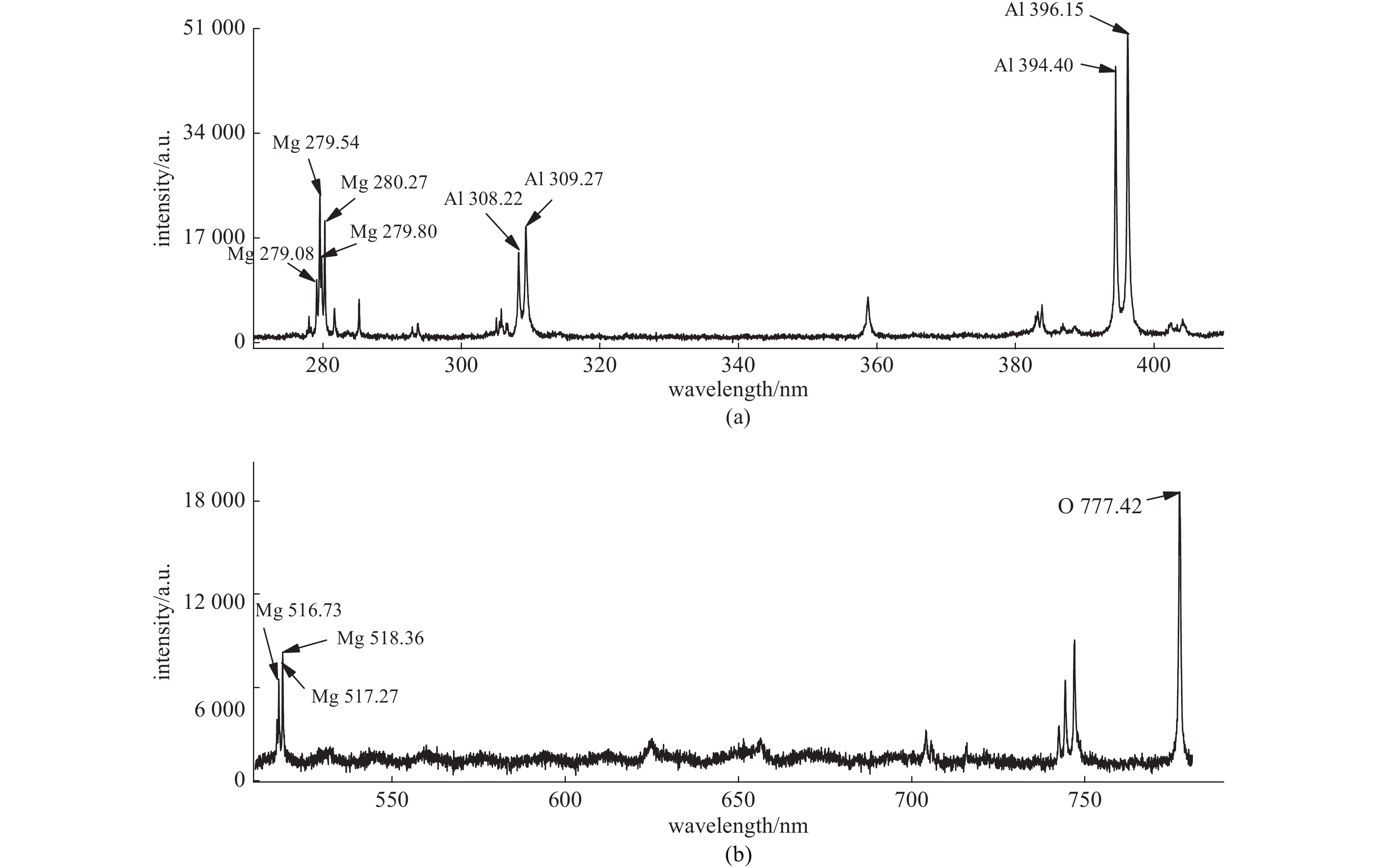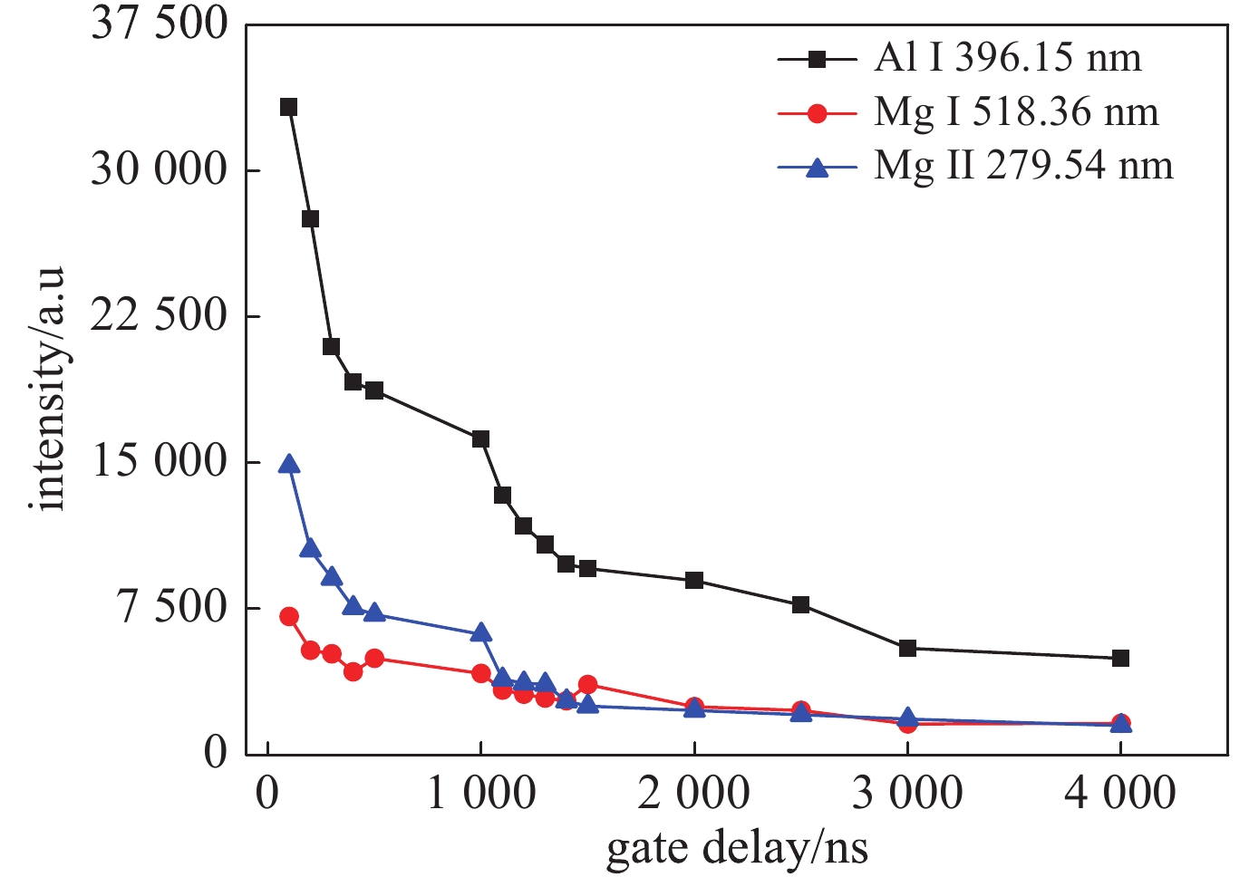 Under normal pressure and temperature, aluminum alloy in air can be excited by Nd:YAG nanosecond laser with wavelength 532 nm, the collection and photoelectric conversion of the plasma emission spectrum are executed by a high-resolution spectrometer and an ICCD. This paper studies the influences of laser energy, ICCD gate delay and lens-to-sample distance (LTSD) on the spectral intensity and plasma electron temperature as well as the physical mechanism. It is demonstrated that the spectral intensity and electron temperature increase with the increase of laser energy at the fixed ICCD gate delay and LTSD. The calculated results show that when the laser energy increases from 20 mJ to 160 mJ, the line intensities of the atomic spectral lines Al I 396.15 nm, Mg I 518.36 nm, and the Mg II 279.54 nm ion spectral line are 12.83, 6.45 and 10.56 times higher than that of 20 mJ, respectively. At the fixed laser energy and LTSD, when the ICCD gate delay changes within 100−4 000 ns, the spectral intensity and plasma electron temperature decay exponential with the increase of ICCD gate delay. With the same ICCD gate delay and laser energy, the influence mechanism of LTSD on plasma parameters was studied by using a focusing lens with focal length of 75 mm. It is demonstrated that the lens-to-sample distance has a considerable impact on the spectral intensity and plasma electron temperature. The results indicate that the change of the spectral intensity is consistent with that of the plasma electron temperature. The curves have two peaks at the distances of 73 mm and 79 mm from sample surface, and the values reach their maximum at 73 mm.