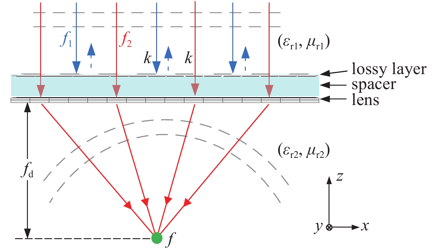 Based on the integration of a transmissive metasurface lens with the circuit analog absorber, the design of a microwave composite material with characteristics of both transmissive wavefront conversion and out-of-band radar cross-section reduction is proposed and examined. With the refraction tuned by gradient phase compensation, the lens consisting of sub-wavelength spaced layers of periodic inclusions exhibits a reciprocal conversion between planar and spherical wavefronts. Moreover, the responses of the lens at the lower side of the wavefront conversion band are used to construct a circuit analog absorption profile containing one lossy layer. By using an aperture-coupled microstrip patch antenna element as the primary feeding antenna, main lobe gain enhancement over a wide band is observed as a result of the wavefront conversion of the composite material. In comparison with the lens, the introduction of the circuit analog absorption profile produces radar cross-section reduction over the bandwidths of 130.68% and 155.11% for TE and TM polarizations, respectively. The full-wave simulation and experimental measurement demonstrate the enhanced radiation gain and reduced radar cross-section and illustrate the validity of the composite material design with integrated absorption and focusing.