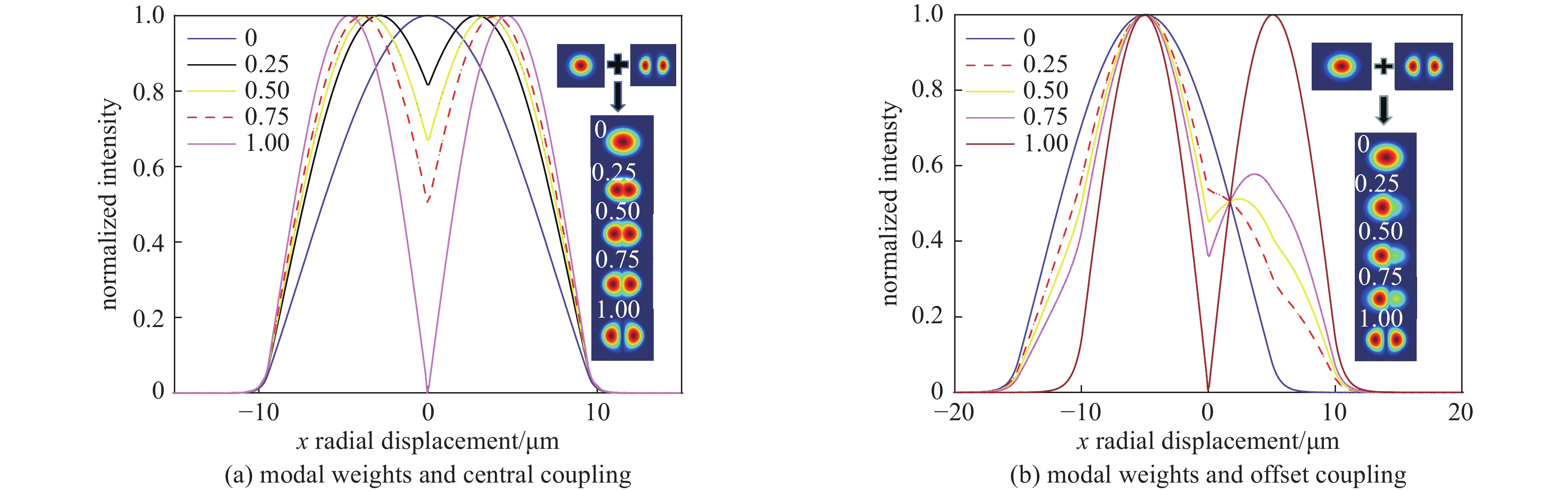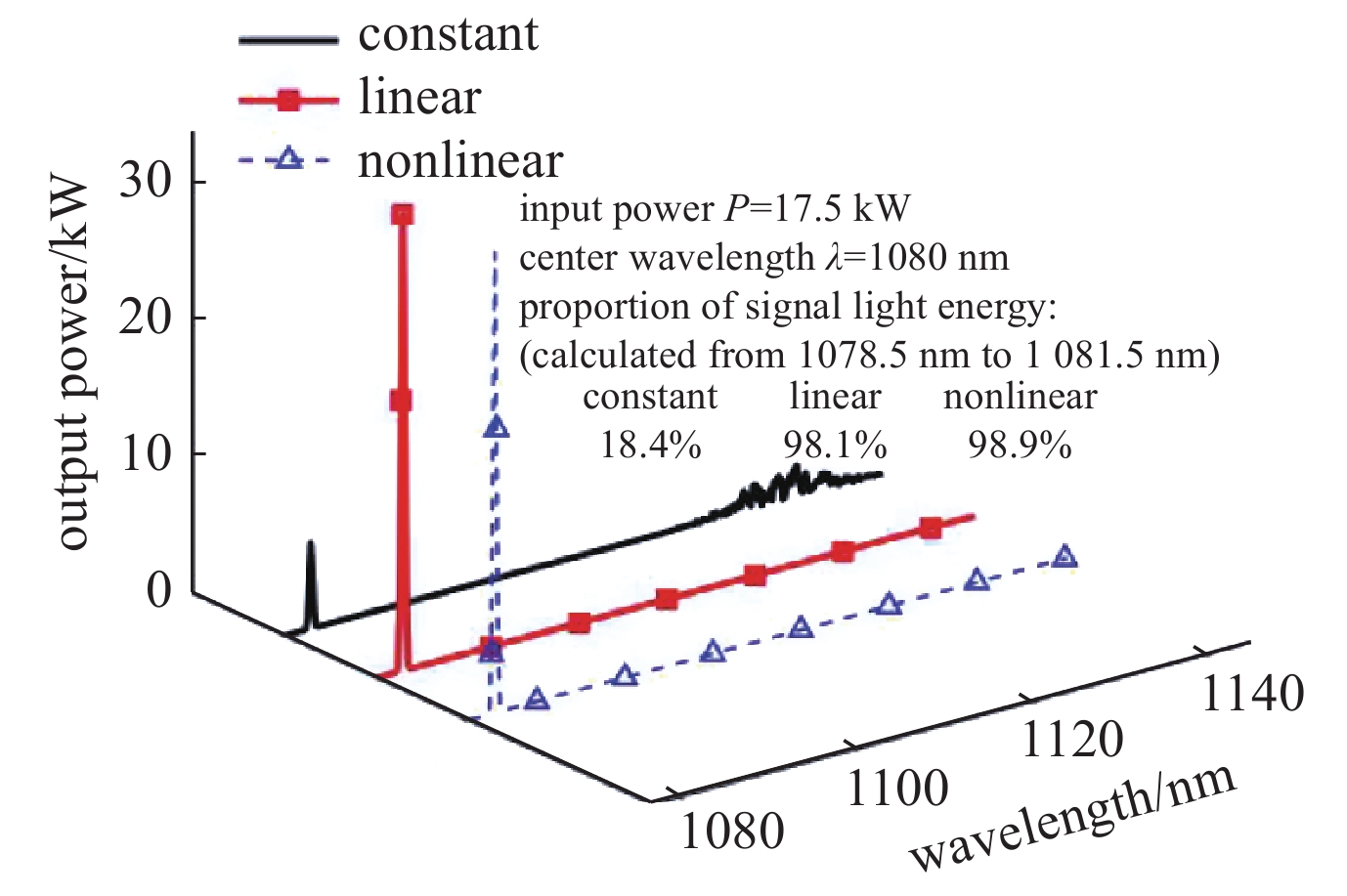 Tapered fiber has unique advantages in suppressing nonlinear effects because its core radius increases uniformly along the length of the fiber. In this paper, the output spectrum evolution and Raman performance of three different types of passive fibers are simulated and analyzed under the input of single transverse mode Gaussian beam: the passive fibers with constant core radius, linearly increasing radius and nonlinearly increasing core radius, all have the same input core diameter of 50 μm. Under the same conditions, when the input power is 10 kW, the Raman suppression ratio (defined as the difference between the intensity of the signal peak and the Raman peak in the spectrum) of constant type passive fiber is 33.1 dB, while those of the linear type and nonlinear type are 47.0 dB and 48.6 dB, respectively, which are better than that of constant type by 13.9 dB and 15.5 dB; When the input power reaches 17.5 kW, 81.6% of the input energy of the constant type is dissipated or transferred to other wavelengths, while that of linear and nonlinear types is less than 2%, and the output signal optical band energy accounts for 98.1% and 98.9% of the total input energy. The results show that the threshold of stimulated Raman scattering can be effectively improved by using linear or nonlinear passive fiber instead of constant type, and the study can provide a useful reference for the design of high-power fiber combiner and fiber end cap.