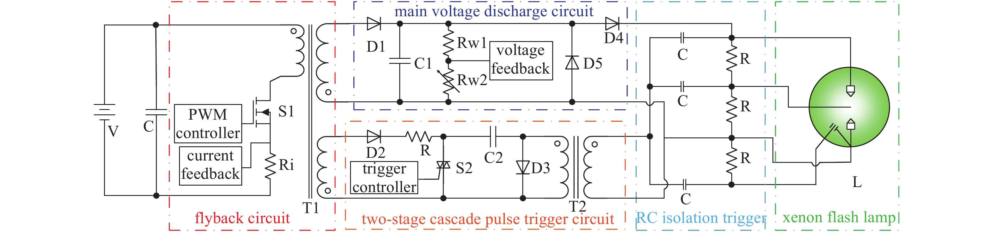 To reduce damped oscillation in the existing short-arc pulsed xenon lamp power supply, this paper proposes a short-arc xenon flash lamp driving power supply design based on the flyback topology method and RC isolation trigger network. The driving power supply adopts 24 V input, the main voltage generates 700−1000 V continuously adjustable output through the flyback topology. The pulse trigger voltage circuit adopts a two-stage cascade boost circuit to produce 5−7 kV pulse output. The main voltage and the pulse trigger voltage pass through the RC isolation trigger network to drive the pulse xenon lamp. This paper designs and implements various modules of the drive power supply, compares the RC isolation trigger network simulation with the actual trigger waveform, and analyzes the charge and discharge waveforms of the main voltage at different voltages. The experimental results show that the driving power supply designed has a 100% success rate for lighting the short-arc pulsed xenon lamp, which verifies the feasibility of the designed driving power supply. The driving power supply has a longest total charge and discharge time of 5.63 ms, which can provide a high flashing frequency for short-arc xenon flash lamps. In addition, the driving power supply can reduce the damping oscillation range from 32.24% to 4.7%, effectively suppressing the damping oscillation caused by discharge, avoid recharging the energy storage capacitor, and effectively improve the discharge times and life of the energy storage capacitor and the short-arc xenon flash lamp.