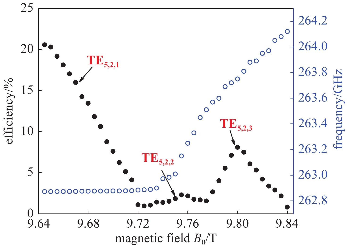 Terahertz gyrotron can achieve high output power and has a certain frequency tuning range, thus it is an ideal high power terahertz radiation source for NMR spectroscopy system. A 263 GHz, TE5,2 fundamental harmonic frequency continuously tunable gyrotron is designed, the corresponding frequency tuning range can reach 1.4 GHz through adjusting the magnetic field. The unstable oscillation state of the designed gyrotron is studied by using the time domain multi-mode multi frequency self-consistent nonlinear theory. The results show that in the magnetic field range of low order axial mode, when the operating current is greater than the starting current, the continuously tuned gyrotron enters the stable state, where the high order axial mode is suppressed, and the output power of TE5,2 remains unchanged with time. When the current increases, the competition between axial modes causes the gyrotron to enter the unstable oscillation state from the stable state, the output power of TE5,2 oscillates with time and the interaction efficiency decreases greatly. With the further increase of current, the gyrotron returns to another stable state different from that of low current. It is also found that the initial current increases with the increase of magnetic field. The research of this paper has a certain guiding significance for the development of continuously tuned THz gyrotron for DNP-NMR applications.