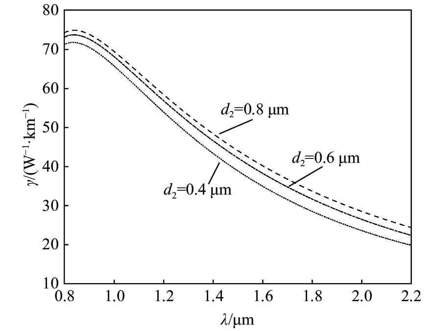 A photonic crystal fiber (PCF) structure with low loss, broadband near-zero dispersion and high nonlinearity is proposed. The diameter of the air hole in the cladding increases gradually from the core to the cladding. The dispersion, loss and nonlinear characteristics of the PCF are analyzed by the multipole method through changing the air hole spacing, diameter and the number of air hole layers. Finally, the variation law of each characteristic is obtained and the optimal structure parameters of PCF are designed. The results show that the fiber has three zero dispersion points, the dispersion and dispersion slope is less than 0.27 ps·nm−1·km−1 and 0.008 ps·km−1·nm−2 respectively between 1.25 μm and 1.55 μm, and the loss is 0.021 dB/km at 1.55 μm. The nonlinear coefficients are 78.6 W−1·km−1, 60.4 W−1·km−1, and 38.2 W−1·km−1 at the femtosecond laser pumping wavelength 0.8 μm, 1.06 μm and 1.55 μm respectively.