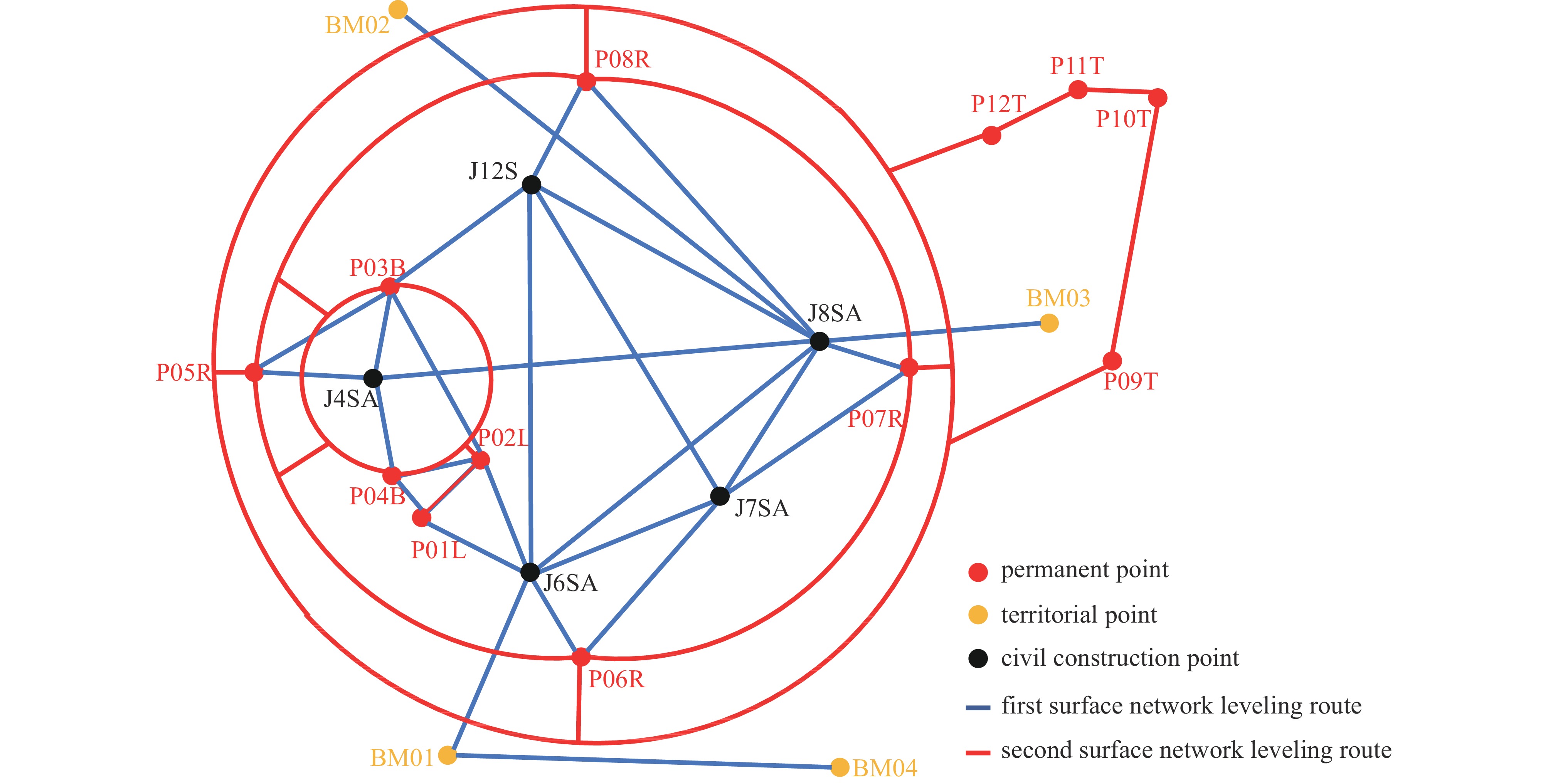 With the increasing demand on higher precision control of beams in modern particle accelerators, higher requirements are raised for the design and survey of engineering control network. In this paper, the layout and survey scheme of the first-level surface control network for the engineering survey of High Energy Photon Source (HEPS) are introduced in detail. The permanent points of the surface control network are arranged in the tunnel of the particle accelerator building, and the vertical view hole is aligned with the instrument plumb on the top surface of the online station hall, and the observation condition of plane mutual view is formed, the transmission and contact of plane coordinates are realized. In the elevation direction, the communication between the leveling station and the elevation coordinates is realized by means of horizontal viewing holes and doors and windows. Therefore, the three-dimensional view and observation structure is formed, which is unique in the construction of synchrotron radiation light source in China, and effectively ensures the accurate control of accelerator orbit. The scheme that the plane control network adopts the GNSS control network and the corner network of the total station respectively is proposed. The elevation control network adopts the scheme of indoor tunnel ground and outdoor ground level survey scheme. Before the installation of the accelerator tunnel equipment, two surface control network surveys were carried out. The data processing was adjusted in plane + elevation mode, and the accuracy of the measurement process is verified by comparing different survey schemes, and the reliability is verified by comparing the measurement results of two control networks. The average point position standard deviation is 2 mm, which indicates that the survey results are reliable and meet the requirements of subsequent control network survey and equipment installation collimation. The stability of the point is improved by optimizing the design of permanent point marker structure. As HEPS requires high stability of permanent control points, through optimal design and special construction, the ultra-high fine and stable bedrock spacer pile was successfully built in the narrow tunnel space, forming a stable three-dimensional permanent control point for the storage ring. It provides a benchmark for long-term monitoring of beam orbit stability, and provides a reference for the subsequent construction of synchrotron radiation light source.