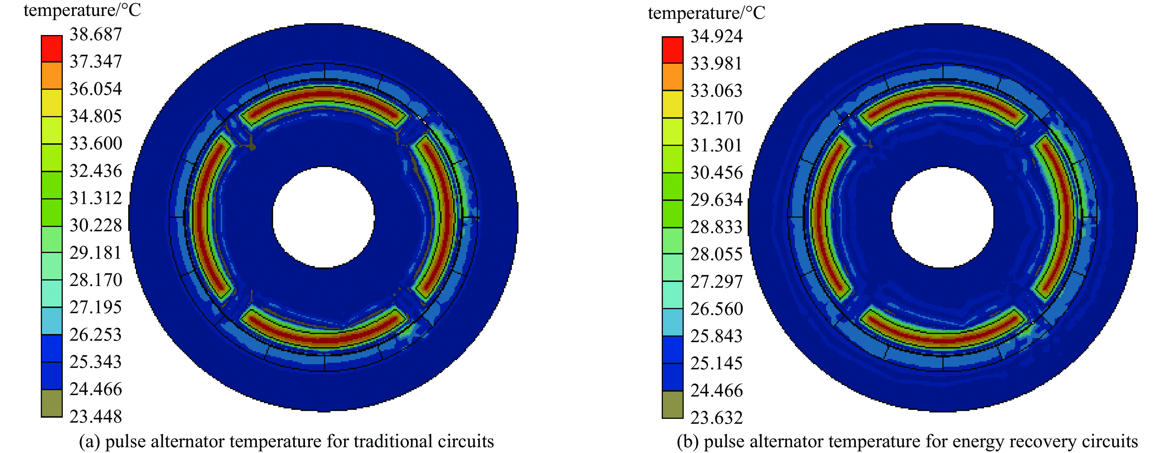 To reduce the energy loss of the air-core pulse alternator and the heating of the field winding, a field circuit topology with the function of recovering residual magnetic energy is proposed. By setting the adjustable inductance in the capacitor branch, the capacitor after the discharge has a reverse voltage, forcing the thyristor and the diode to turn off, and switching the current flow path to realize the transfer of the remaining excitation energy to the capacitor. The circuit uses the thyristor as the main switch, and its high current turn-off capability gives it an advantage in the application of high-power pulse alternator. The working process of the proposed excitation energy recovery circuit is introduced, the influence of residual energy recovery on the energy loss and heat generation of the field winding is simulated and analyzed, and the working principle of the circuit topology is verified experimentally. The results show that the circuit can quickly recover the residual energy in the field winding, shorten the freewheeling time of the excitation current, and reduce the excitation loss and energy loss. The law reflected by the simulation and experimental results is consistent with the circuit principle, which shows the validity of the circuit method.