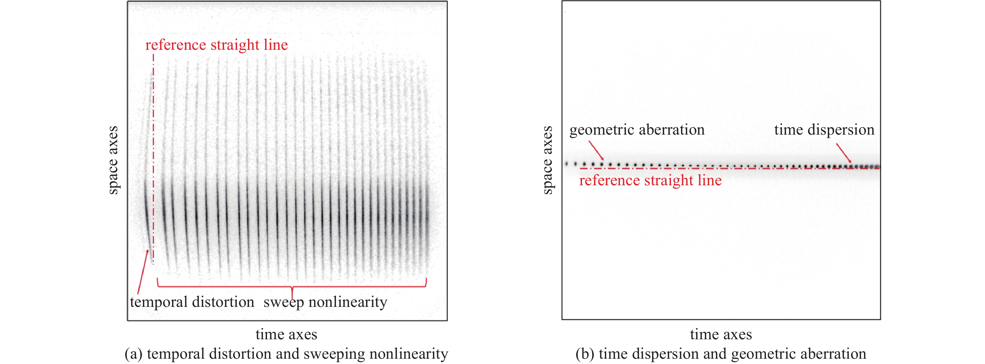 To resolve the calibration of temporal and spatial nonlinearity of an optical streak camera in 100-nanosecond level, an idea of rapid calibration of two-dimensional nonlinearity of optical streak camera has been proposed with the method of constructing an equidistant standard light field in the temporal and spatial dimension. The reference points with equal spacing of temporal dimensions have been obtained by the technique of sequential pulsed light construction. In addition, the reference points with equal spacing of spatial dimensions have been obtained by the spatial modulation technique of light field. The design criteria of sequential pulsed light and optical system have been analyzed. Based on the criteria, a high-performance system to calibrate two-dimensional nonlinearity of optical streak camera has been developed. The temporal resolution of the system is 0.1 ns and the spatial resolution is less than 90 μm. Based on the system, the sweeping nonlinearity, time dispersion, temporal distortion and geometric aberration of a domestic streak camera have been calibrated quickly via a single sweeping image. In addition, the sweeping nonlinearity of different circuits has been analyzed and verified by the system. The calibration system quickly verified that the double-sided scanning circuit was conducive to optimizing the scanning nonlinearity. The analysis and verification results show that the calibration technology could calibrate the nonlinear parameters of a streak camera via a single sweeping image.