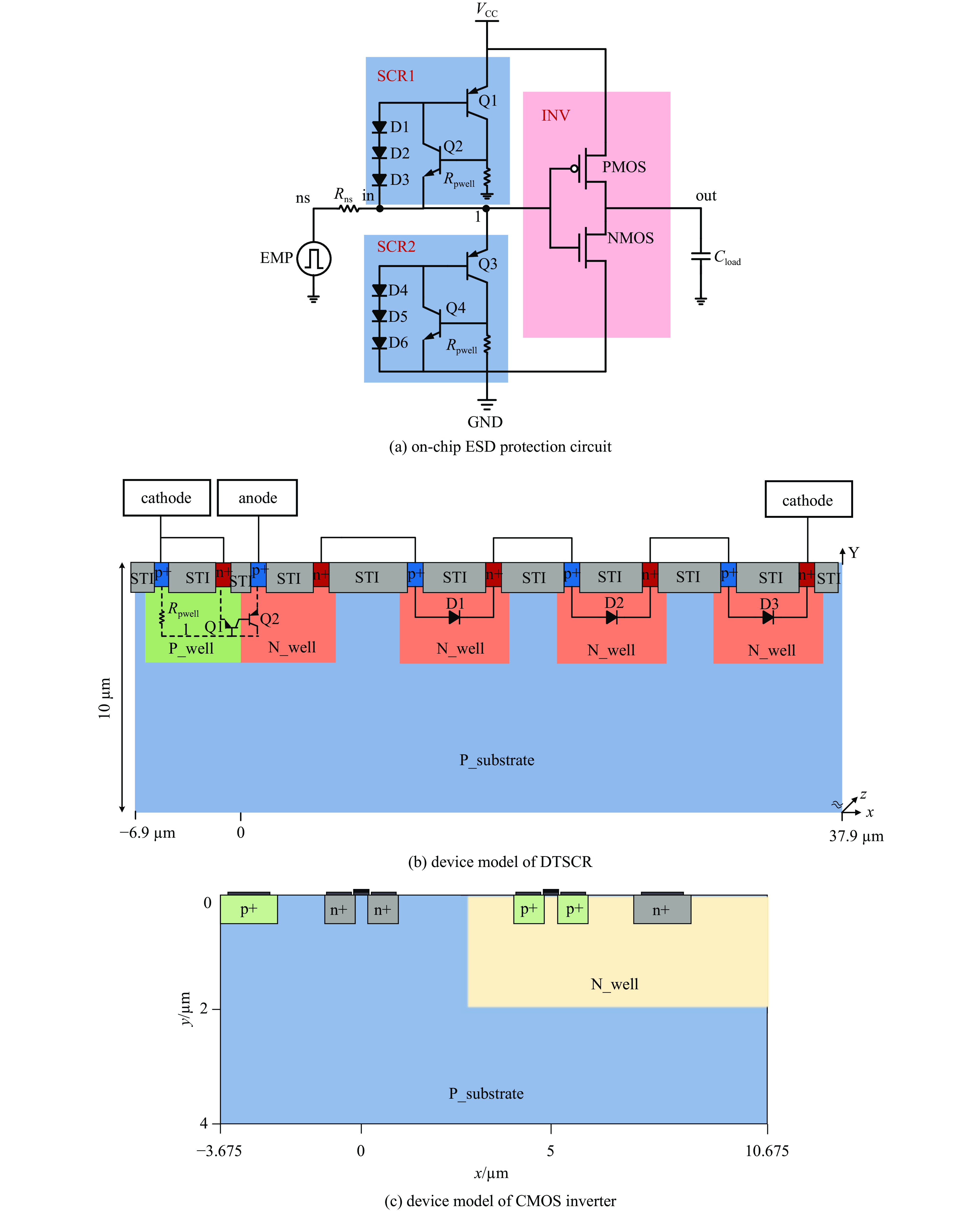 The electrostatic discharge (ESD) protection circuit widely exists in the input and output ports of CMOS digital circuits, and fast rising time electromagnetic pulse (FREMP) coupled into the device not only interacts with the CMOS circuit, but also acts on the protection circuit. This paper establishes a model of on-chip CMOS electrostatic discharge protection circuit and selects square pulse as the FREMP signals. Based on multiple physical parameter models, it depicts the distribution of the lattice temperature, current density, and electric field intensity inside the device. At the same time, this paper explores the changes of the internal devices in the circuit under the injection of fast rising time electromagnetic pulse and describes the relationship between the damage amplitude threshold and the pulse width. The results show that the ESD protection circuit has potential damage risk, and the injection of FREMP leads to irreversible heat loss inside the circuit. In addition, pulse signals with different attributes will change the damage threshold of the circuit. These results provide an important reference for further evaluation of the influence of electromagnetic environment on the chip, which is helpful to carry out the reliability enhancement research of ESD protection circuit.