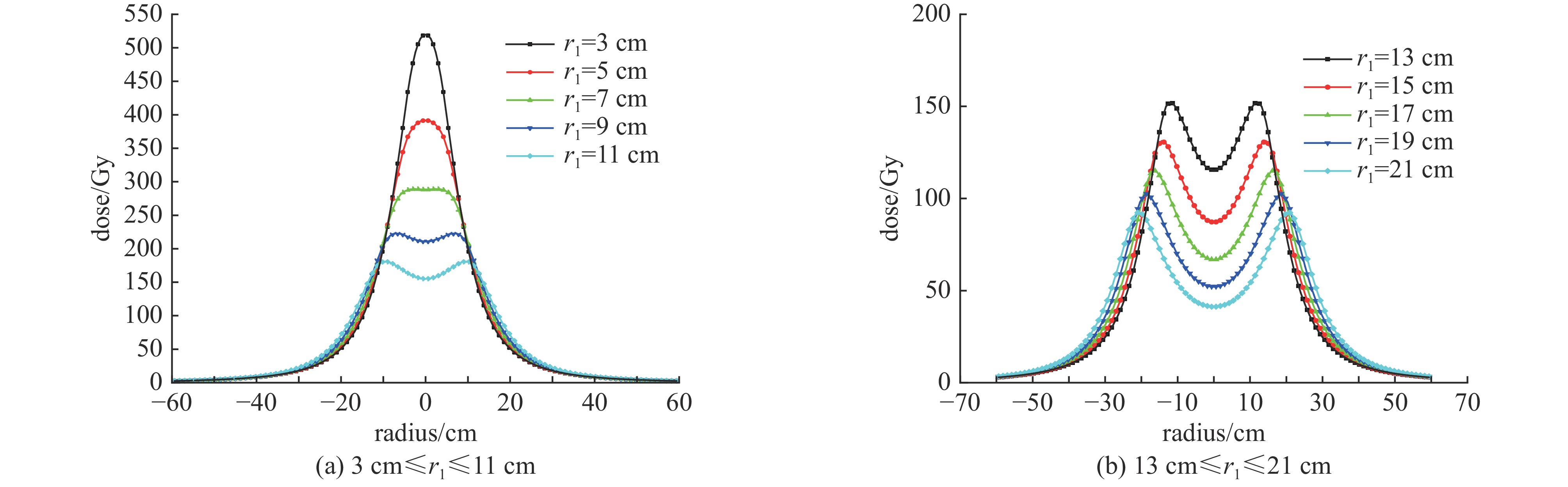 Bremsstrahlung diode is an important device for obtaining large area uniform bremsstrahlung field in laboratory. In this paper, based on Monte Carlo method, a model of single and double ring parallel electron beam bombarding tantalum target is established to simulate the process of bremsstrahlung field generated by ring diode. The electron beam energy is 1.5 MeV, the tantalum target thickness is 200 μm, and the dose of bremsstrahlung field generated by a single ring electron beam 10 cm behind the target is simulated by detector counting method. For single-ring diode structure, the inner diameter of the ring is the main factor affecting the bremsstrahlung field uniformity behind the target, and the larger the inner diameter, the worse the central dose uniformity. Compared with the inner diameter of the ring, the ring width mainly affects the dose of the radiation field, but has little influence on the uniformity. When the inner diameter of a single ring is 19 cm and the outer diameter is 20 cm, a uniform radiation field with a maximum area of