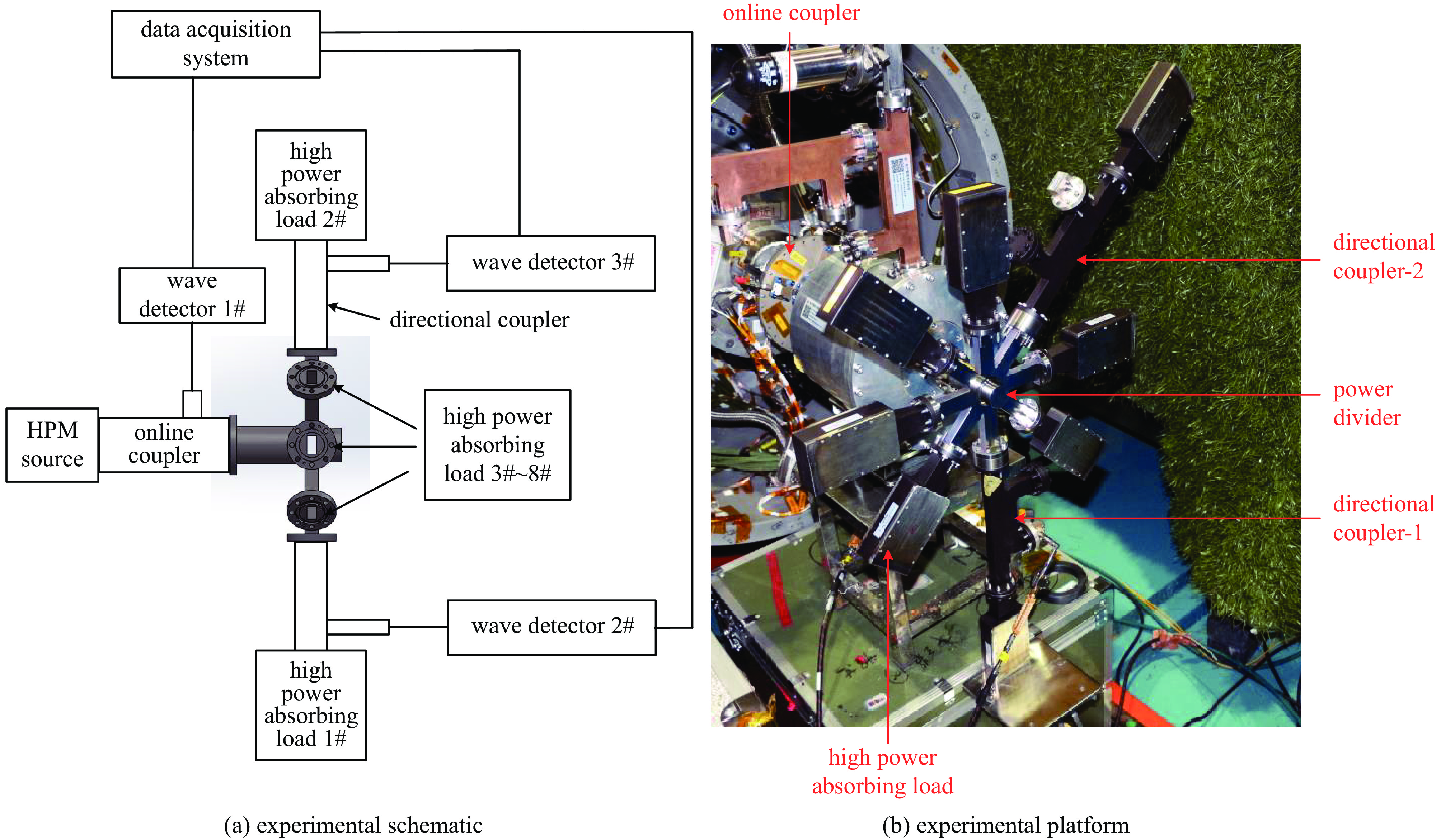 The power division network is one of the key components of high power microwave (HPM) phased array antenna. It is used to divide HPM into several paths and feed them into phase shifter and element antenna. In such a network, the over-mode circular waveguide to multi-channel rectangular waveguide power divider has the function of mode conversion and power distribution. It is the front end of the power division network and requires high power handling capability, high transmission efficiency and low reflection. In this paper, the design, simulation, fabrication, and small signal test of the power divider from Ku-band GW-level over-mode circular waveguide to 8-channel rectangular waveguide were carried out. Subsequently, the power handling capacity of the power divider was evaluated utilizing the established power capacity testing facility. The experimental outcomes demonstrated that within the frequency band of 14.7 GHz±200 MHz, the reflection coefficient was consistently below −20 dB, the transmission coefficient exceeded −9.1 dB, the port imbalance was maintained at less the 0.4 dB, and the power handling capacity exceeded 900 MW.