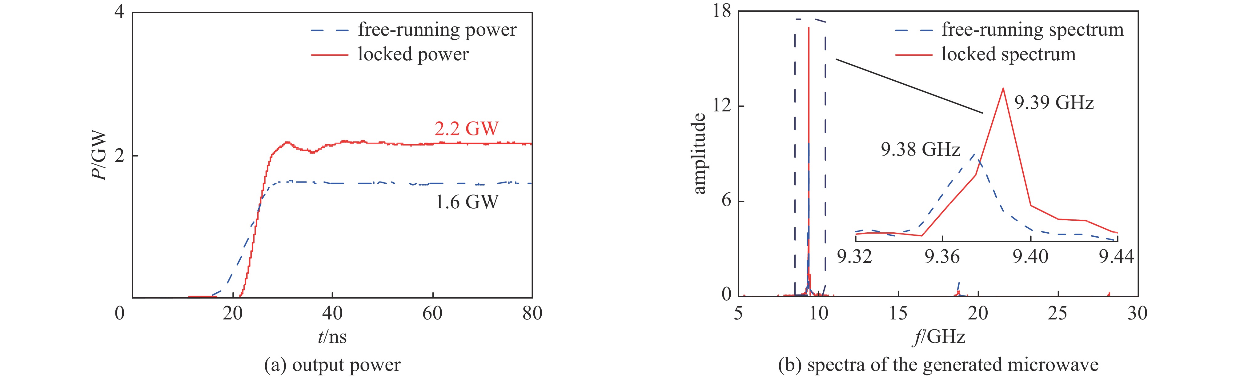 The power capacity of high-power microwave generating devices is improved by increasing the overmode ratio of the slow wave structure. The nested structure allows the use of the hollow or inner conductor structure of the overmode device, while the low impedance of the nested structure device makes it a good match for low-impedance pulsed power sources. A high-power microwave oscillator with locked frequency and phase is proposed based on the nested structure. Compared with the traditional method to lock phase and frequency, a method based on coupling waveguide is proposed to realize the locked frequency and phase. The microwave generated by the outer relativistic klystron oscillator (RKO) or inner RKO leaks into the other RKO through the coupling waveguide to premodulate the electron beam to lock phase and frequency. In addition, a dual-way power combiner is designed at the operating frequency of the oscillator to realize the combination of the inner and outer high-power microwave. The power combiner can make up for the phase difference between the two output ways, increasing the power combination efficiency to 98.3%. When the diode voltage is 575 kV and the magnetic field is 0.6 T, the output power of inner and outer RKOs are 2.2 GW and 3.2 GW, respectively, with the frequency difference fluctuating less than 20 MHz and the phase difference stabilized near 10°; loading the designed power combiner, high power microwave with power of 5.31 GW and efficiency of 32.2% is obtained. The results show that the oscillator saturation time is shortened and the output power is increased when the nested device is in the locked state.
