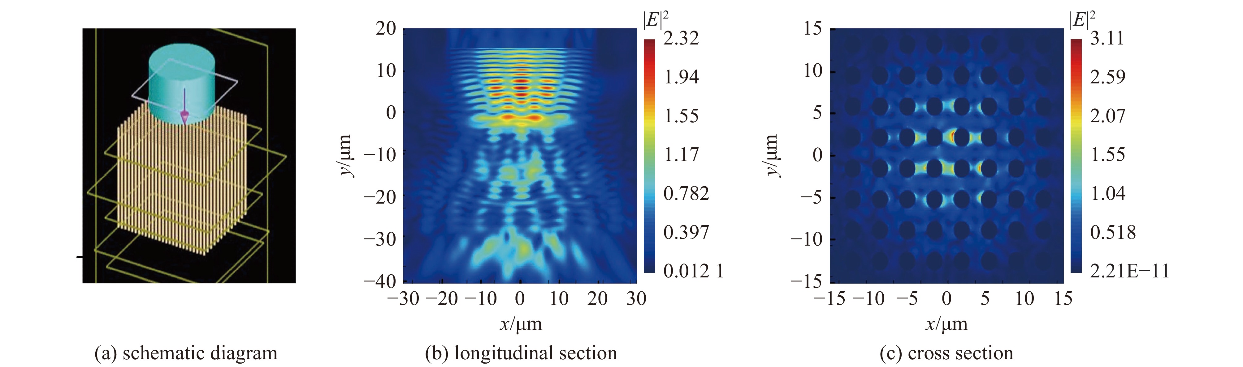 The finite-difference time-domain algorithm (FDTD) was used to simulate the optical field distribution of the micro-nano structure target, explore the optical transmission mechanism in the micro-nano structure target, and analyze the influence of material properties and structural parameters on the optical transmission characteristics and optical field distribution. Based on the simulation results of optical field distribution and evolution, the laser transmission characteristics in the nano-wire and nano-pore array targets of semiconductor alumina, insulator silicon dioxide and metal copper with different electrical conductivity are compared, and the modifications of optical field distribution during optical transmission are analyzed. The results show that the optical transmission characteristics and optical field distribution in the target can be modulated by changing the diameter and spacing of the holes (nanowires) in the target structure, and the optical field can be periodically oscillated between the dielectric material and the vacuum region, or transmitted in a stable state. When the laser is transmitted in the copper nanopore array, the light transmittance increases with the increase of the hole radius. Based on the simulation results of light field distribution and evolution, the laser transmission properties of different materials and micro-nano structure targets are compared, the physical images and corresponding phenomena are given, and the micro-nano structure target design is given according to the requirements of light field regulation.
