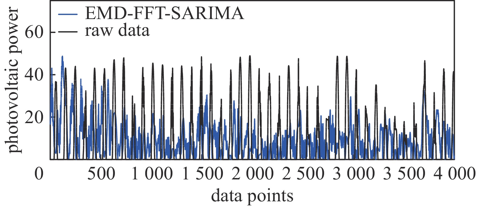 In this paper, the photovoltaic (PV) power prediction model is optimized according to the characteristics of PV output units in distributed energy industrial parks to provide data support for the subsequent dispatching strategy. The EMD-SARIMA forecasting model is a combination of Empirical Mode Decomposition (EMD) and Seasonal Autoregressive Integrated Moving Average (SARIMA). In the model, the problem of determining the period of each IMF component of the signal component is proposed, the period T calculation method incorporating fast Fourier transform (FFT) is proposed, and the obtained period is fed into SARIMA as an input parameter together with the IMF sequence for prediction, which constitutes the EMD-FFT-SARIMA prediction model. Then, the prediction results corresponding to each IMF are superimposed and reconstructed to obtain the final prediction results. The error calculation of the prediction results reveals that the root mean square error (RMSE) decreases from 120.6 MW to 19.3 MW, and the mean absolute error (MAE) decreases from 52.87 MW to 12.3 MW.
