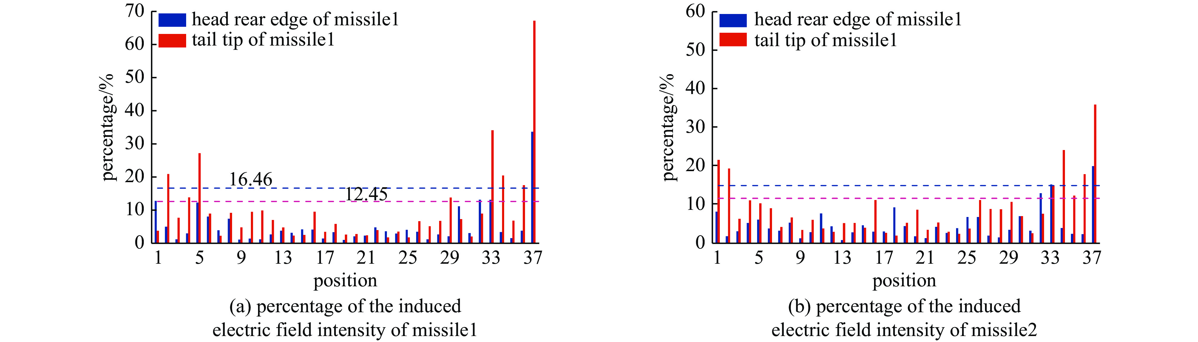 As a suspension for military aircraft, missile has potential for being struck by lightning in special thunderstorm environments. To improve the lightning protection of airborne missiles, a simulation environment of military aircraft with missiles is built in CST software according to the testing methods in SAE ARP5416 standard. The lightning 1A zones are classified through electrostatic field simulation, and the indirect effects of lightning striking on this model are simulated under injection current method. Simulation results show that the head rear edge of missile (metal parts) and tail wing tip of missile are susceptible to initial attachment from lightning. When the head rear edge of the missile is attached by lightning, extremely harsh electromagnetic environment occurs at the radome, and the equipment in the cabin of carbon fiber reinforced plastic (CFRP) can be damaged owing to the strong electric field and the high voltage induced on cables. However, the electric field strength and induced voltage amplitudes on cables can be dropped in two orders of magnitude separately in the condition of aluminum plating inside the CFRP cabin.