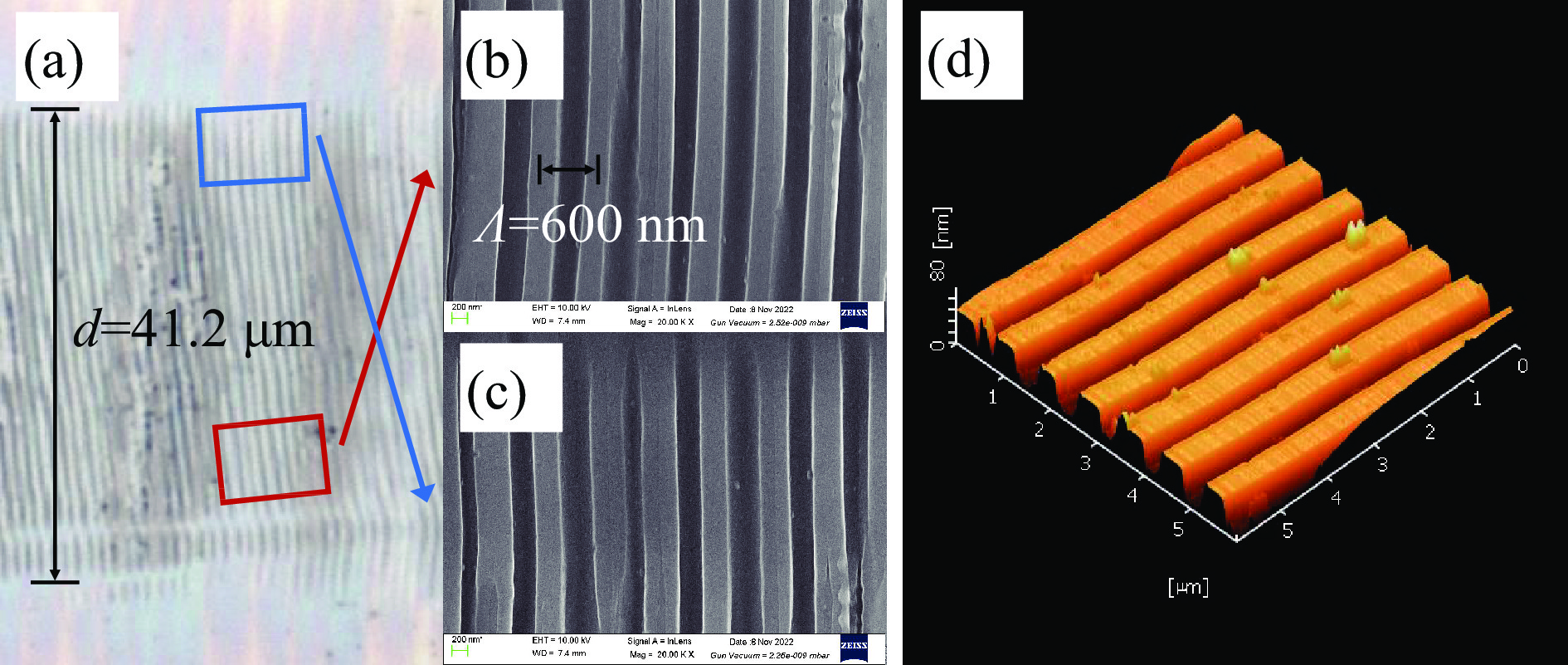 Aiming at the difficulty of fabricating large-area nanograting structures with femtosecond laser in one step, the direct writing method of femtosecond laser pulse using slit-spatial shaping is proposed in this paper. By conducting a study on the parameter dependence of nanograting structures on the single-crystal silicon surface with the processing system, the optimized conditions of incident shaping femtosecond laser—energy density of 8.00 μJ/cm2, scanning speed of 9 mm/s, and slit width of 0.40 mm—are obtained. By using SEM, AFM and other microscopic characterization methods, it is indicated that the fabricated nanograting structure has an extremely high width (41.20 μm), greatly improving the fabrication efficiency of large-area nanograting structures in one step. This study provides a certain reference for the current research on efficiency optimizing and performance enhancing of femtosecond laser direct writing systems.