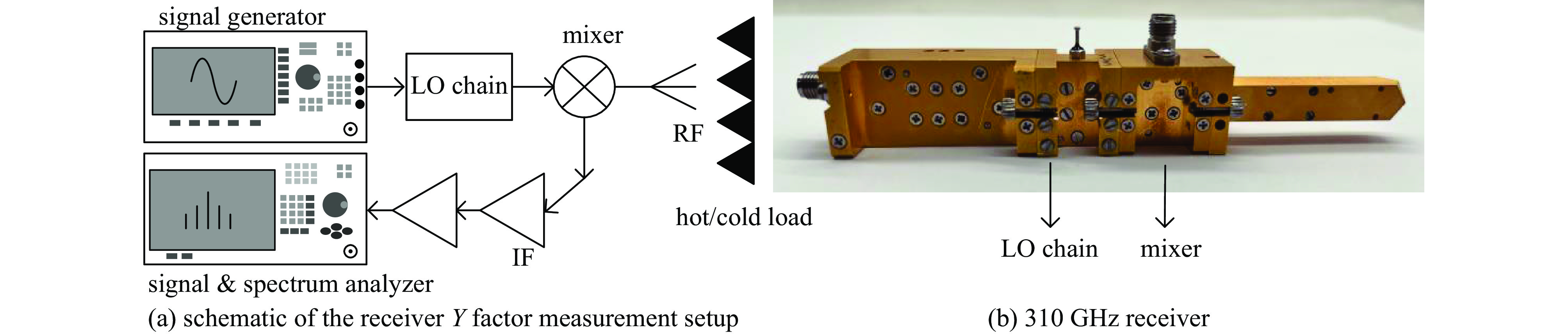 Schottky mixer is the key component of terahertz receiving system. Compared with the receiver based on SIS (superconductor-insulator-superconductor) mixer and HEB (hot-electron bolometer) mixer, the terahertz receiver system constructed on the basis of Schottky diode mixer does not rely on low-temperature accessory equipment, and it has the advantages of low cost, light weight, small volume and low power consumption. At present, the structure of terahertz receiver front-end based on Schottky diode mixer is relatively complex. To solve the problems of complex structure, low integration and high loss of terahertz receiver front-end, a 288−318 GHz sub-harmonic mixer based on Schottky diode and its local oscillation channel is proposed. Accordingly, a terahertz receiver system based on this mixer is constructed. The terahertz receiver’s local oscillation channel consists of a 75 GHz sextupler, a power amplifier integrated module and a 150 GHz frequency doubler. The integrated design of the local oscillator channel makes the receiver integration greatly improved. The overall size of the integrated module is 20 mm×20 mm×43 mm. The final test of the receiver shows that: in the bandwidth of 288−318 GHz, the double sideband conversion loss of the receiver is 5.8−9.4 dB, and the noise temperature is 1 055−1 722 K, which has good RF performance.