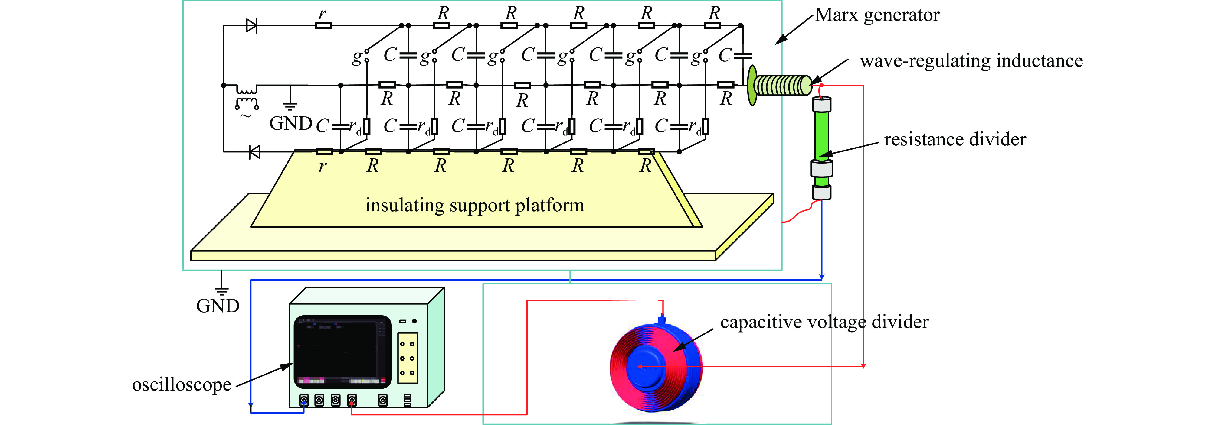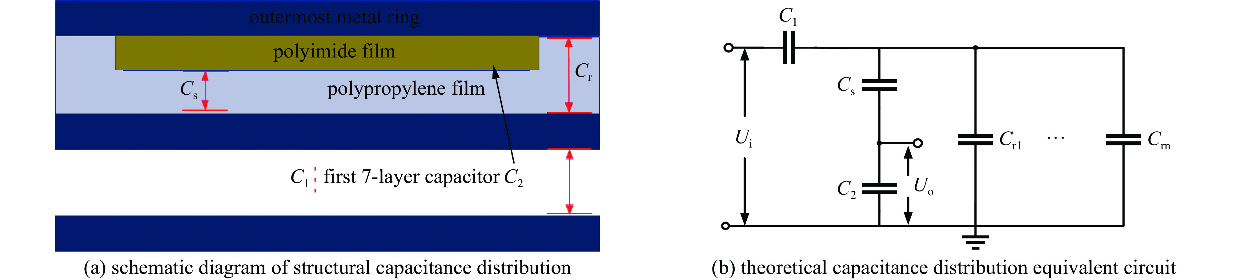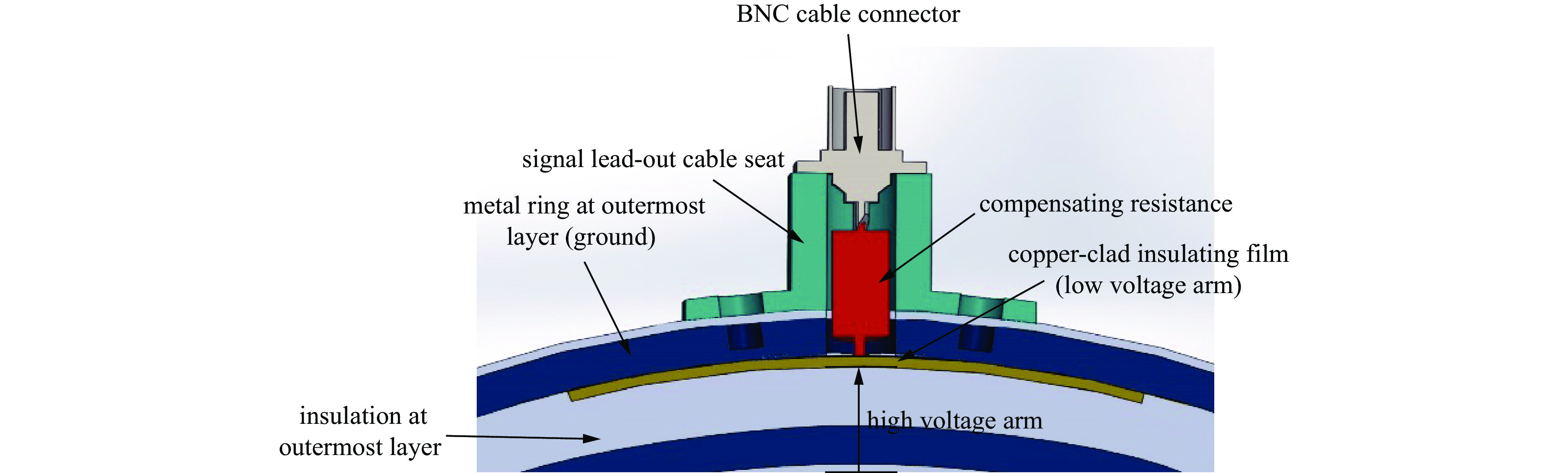 Peaking capacitors, due to their compact structure, generally use indirect measurement of the voltage they bear, and direct measurement of their voltage has always been a difficult problem to solve. To solve this problem, we developed a new type of resistance compensation type self-integrating peak capacitor integrated capacitor voltage divider based on peaking capacitors. Secondly, based on the new structure of the voltage divider, the theoretical voltage ratio of the peak capacitance integrated capacitor voltage divider was analyzed. The calculation formula for the theoretical voltage ratio and the analysis of factors affecting low-frequency response were provided, and circuit simulation verification was carried out. At the same time, square wave calibration experiments were conducted, and the partial pressure ratio and response time of the two probes were obtained, and the response time of the probes was less than 6.2 ns. In addition, to obtain a more accurate voltage ratio and verify the stability of the voltage ratio of the integrated capacitor voltage divider under normal working conditions, high-voltage online calibration experiments were conducted, and the voltage ratio of probe 1 was