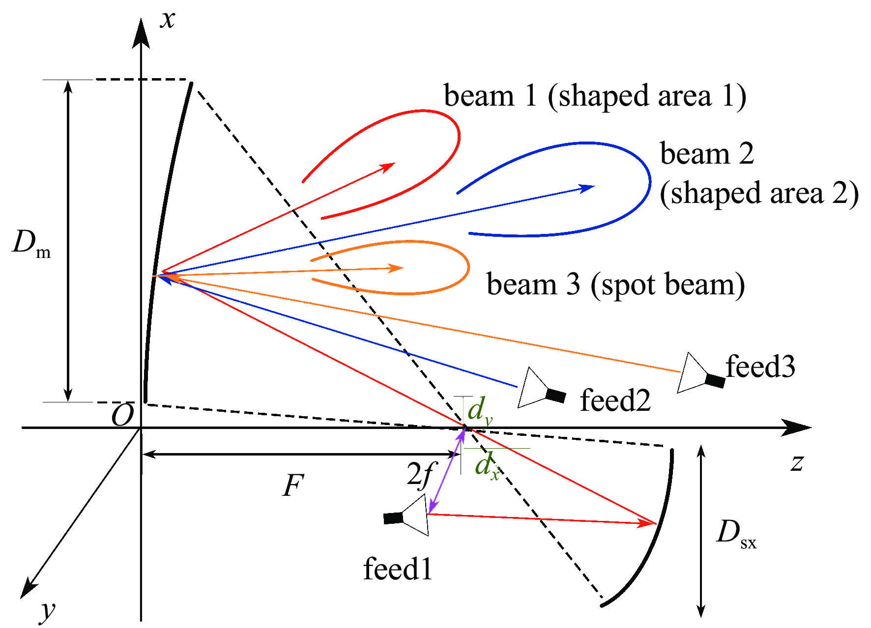 To meet the requirement of multiple tasks in parallel in spaceborne communication, this paper proposes a common aperture multi-beam reflector antenna composed of a Gregorian reflector and three feed-horn antennas, which can generate two contoured beams and one spot beam. The antenna is designed using ray tracing method to determine the optimal spot beam feed position for establishing the antenna infrastructure, and employing Zernike polynomials and cubic B-splines function to optimize the shape of both the main and secondary reflectors. To validate the efficacy of the method, simulation experiments were conducted on 1.1 m diameter antenna. The results demonstrate that the edge of coverage gain for both shaped contour beams in Ku receiving and transmitting bands are 27.7 dBi, 28.0 dBi, 28.0 dBi and 28.2 dBi, respectively. The spot beam exhibits a minimum service EOC gain of not less than 34 dBi, while the scanning beam gain within the range of 0 to 6.5° is not less than 35 dBi.