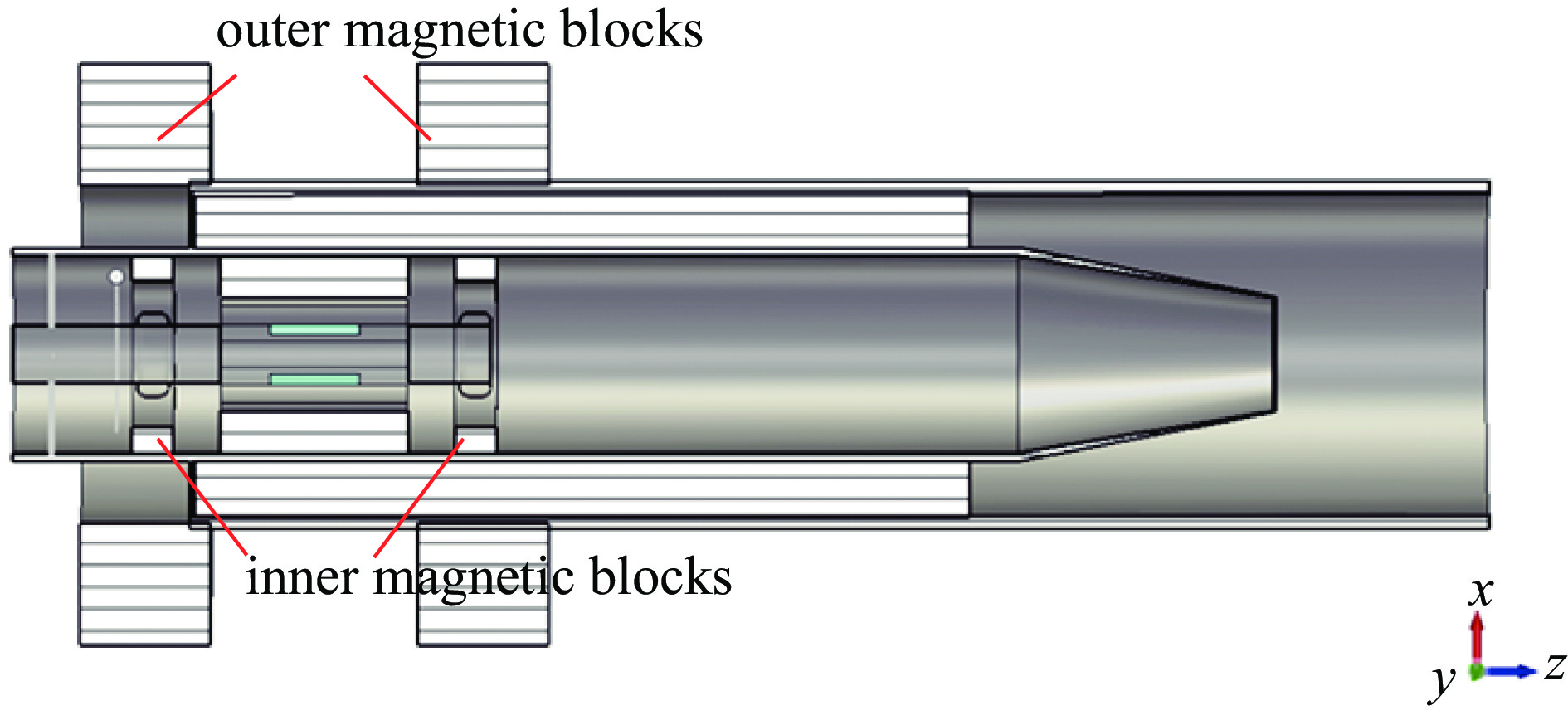 The design of permanent magnet packaging for a compact S-band 8-cavity all-cavity axial extraction relativistic magnetron (R8 ACAE-RM) with an output mode of TE11 is preliminarily explored. The inner magnetic block is placed at both ends of the anode block in the anode cylinder, and the outer magnetic block is placed outside the RM, which generates a magnetic field of about 0.34 T and a length of 72 mm on the axial uniform zone in the interaction zone, and the weight of the permanent magnet is only 21 kg. Compared with the traditional external magnet system, this design can reduce the weight of the magnet, the magnetic field strength in the interaction zone is more uniform, and the system structure is more compact, which can meet the lightweight and miniaturization requirements of high-power microwave source systems. The device applies π mode as its operating mode, four 90° sector TE11 modes are extracted through all-cavity axial extraction structure, and a coaxial-plate-inserted mode converter is designed for mode conversion, thus to obtain TE11 mode in circular waveguide. In particle-in-cell (PIC) simulation, the proposed R8 ACAE-RM can generate a microwave power of 1.06 GW with a pure TE11 mode at the frequency of 2.44 GHz under the conditions of a guiding magnetic generated by the inner and outer magnetic blocks, a diode voltage of 320 kV, and power conversion efficiency of 47%.