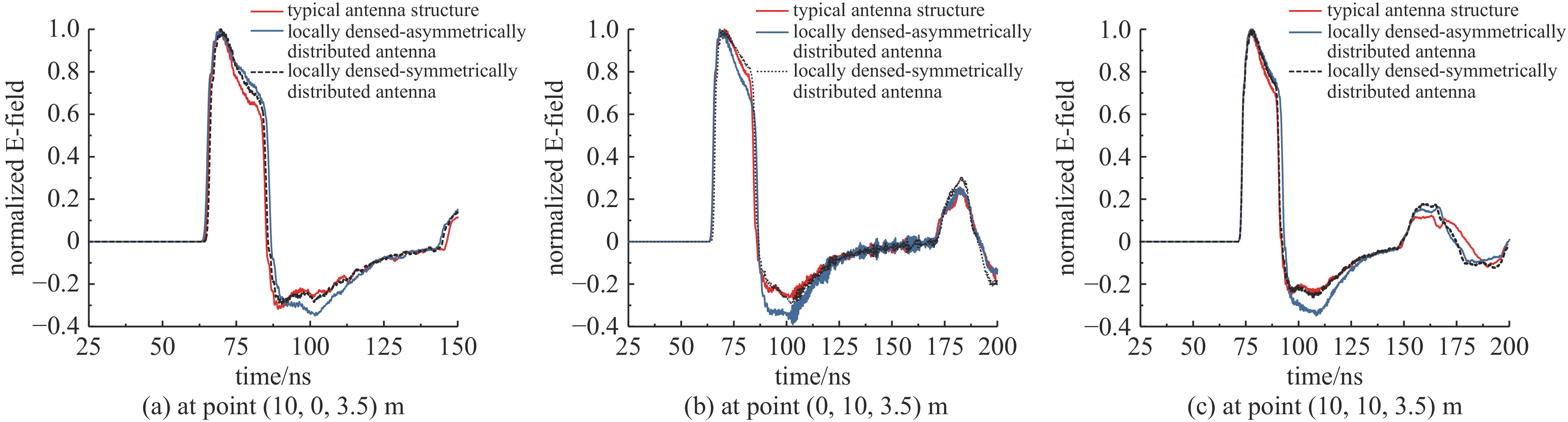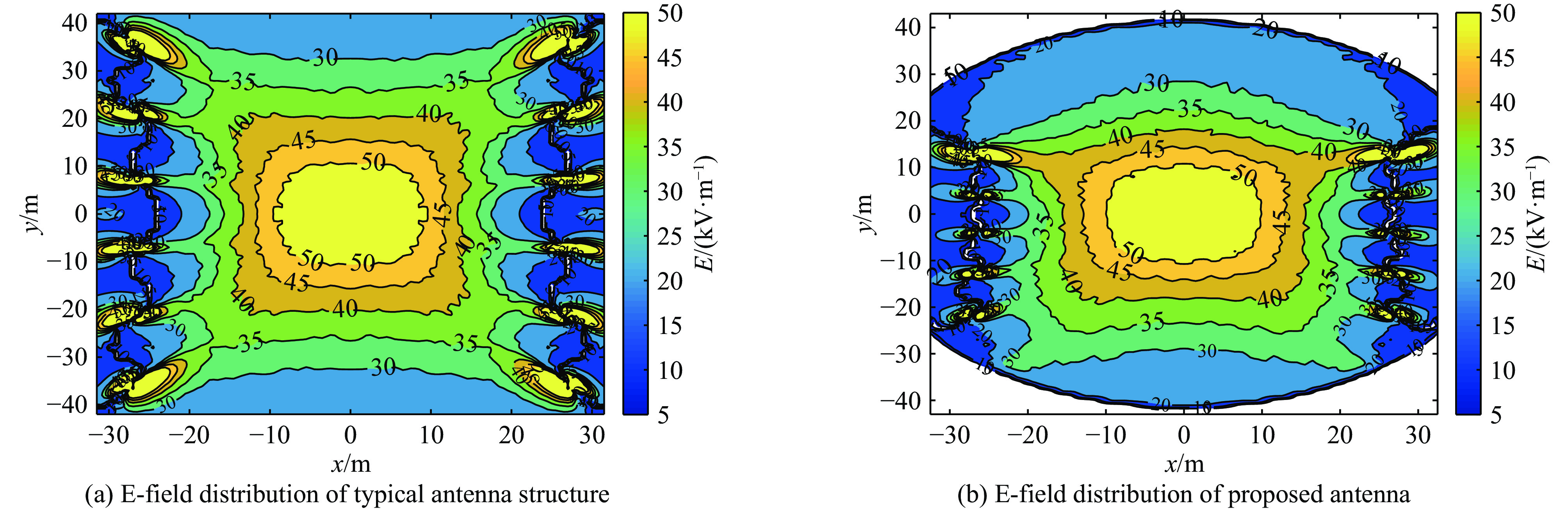 Results show that the energy fed to the antenna can be redistributed by adjusting the layout of the wire grating antenna. Compared with the typical biconical-wire grating antenna, the polarized E-field component of the proposed antenna on x axis at (20, 0, 3.2) m is increased about 20% when the antenna is set up to 20 m high, and a working range about 20 m×20 m is provided. Meanwhile, the polarized E-field components in +y and 45° directions are reduced relatively rapidly. The E-field contour lines in +y direction of the new antenna are gradually compressed and converged to the antenna’s convergence points, looking like a rugby.