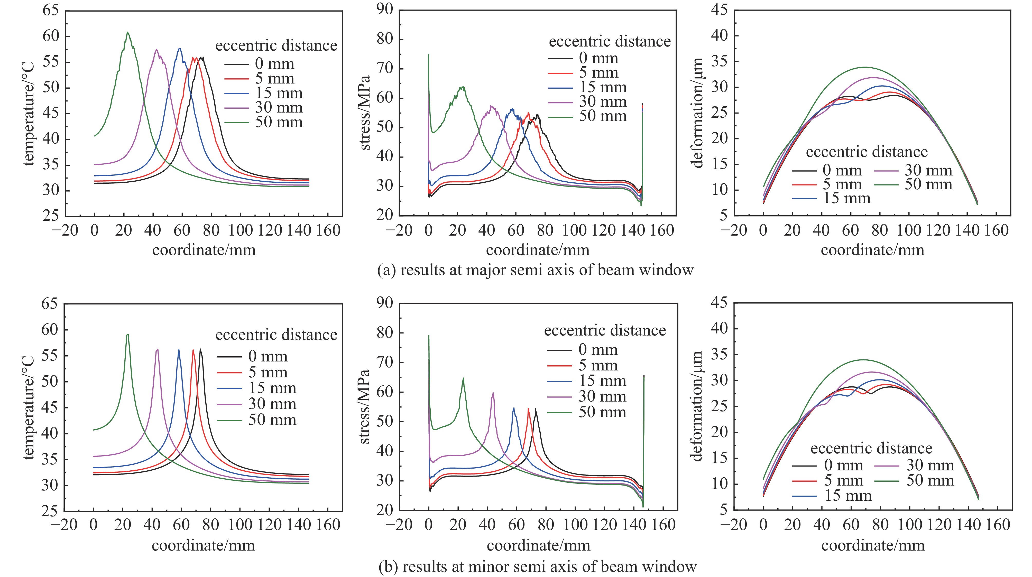 The results show that the radiation dose at 30 cm outside the side walls and ceiling complies with Chinese national standards, verifying the radiation safety of the scheme. Besides, the results indicate that beam eccentricity has negligible effects on the temperature, stress, and deformation of the beam window. Both beam shrinkage and reduced cooling water flow rate lead to increased temperature, stress, and deformation.