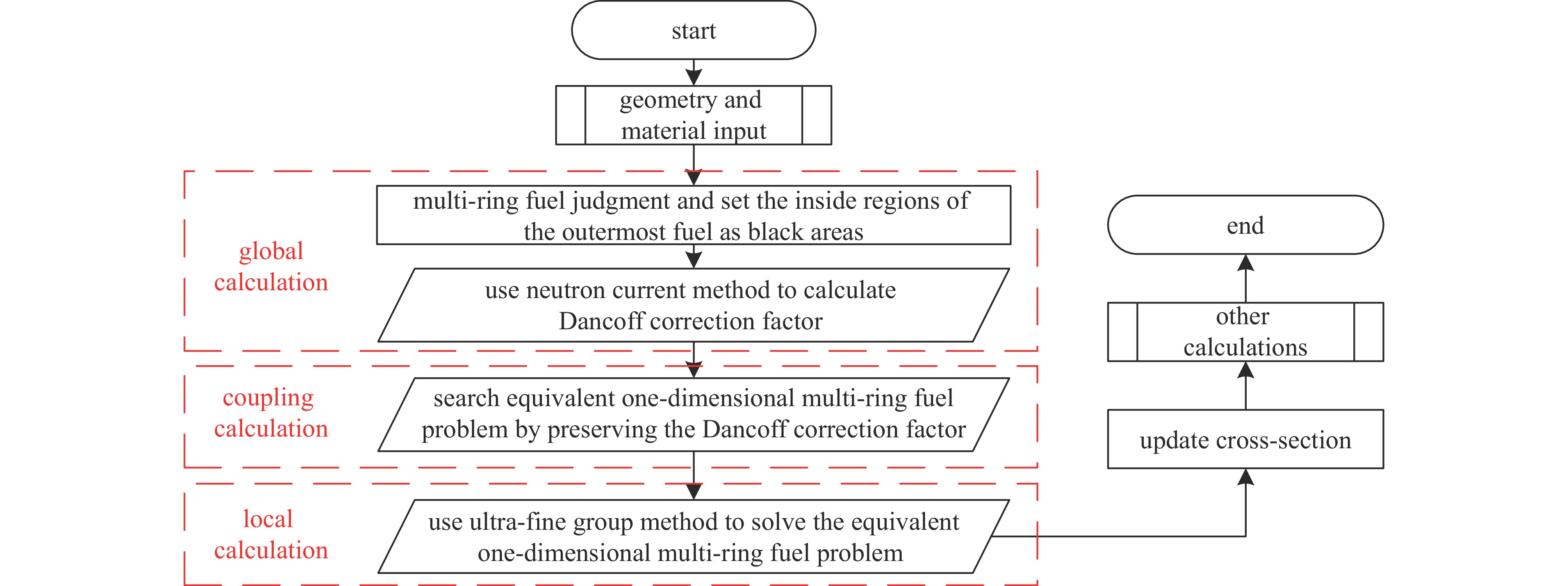This study aims to address the limitations of existing resonance calculation methods for multi-ring fuel systems by developing a novel global-local coupling framework. The primary objectives are to enhance the accuracy of effective self-shielding cross-section computation for resonant nuclides, improve computational efficiency, and validate the method’s applicability for both assembly-level and full-core simulations.