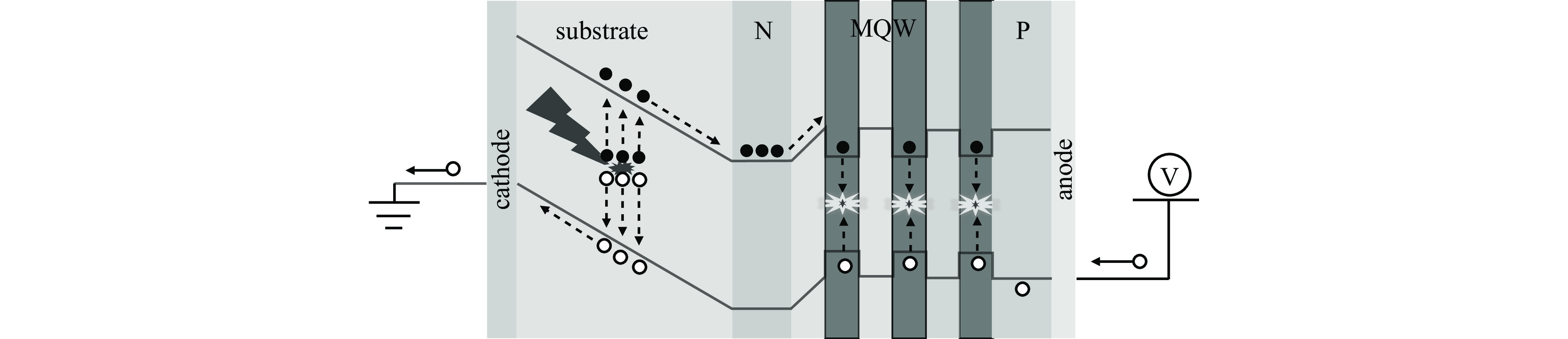 To leverage the advantageous properties of GaN comprehensively and achieve higher overall performance in detection, this study proposes a radiation-to-light conversion detection mode that combines GaN semiconductor devices for simultaneous radiation energy deposition and carrier recombination luminescence. By constructing a PN junction structure incorporating MQWs on a high-resistivity, high-mobility GaN substrate, a radiation detection device capable of both radiation-to-carrier conversion and carrier recombination luminescence is realized.