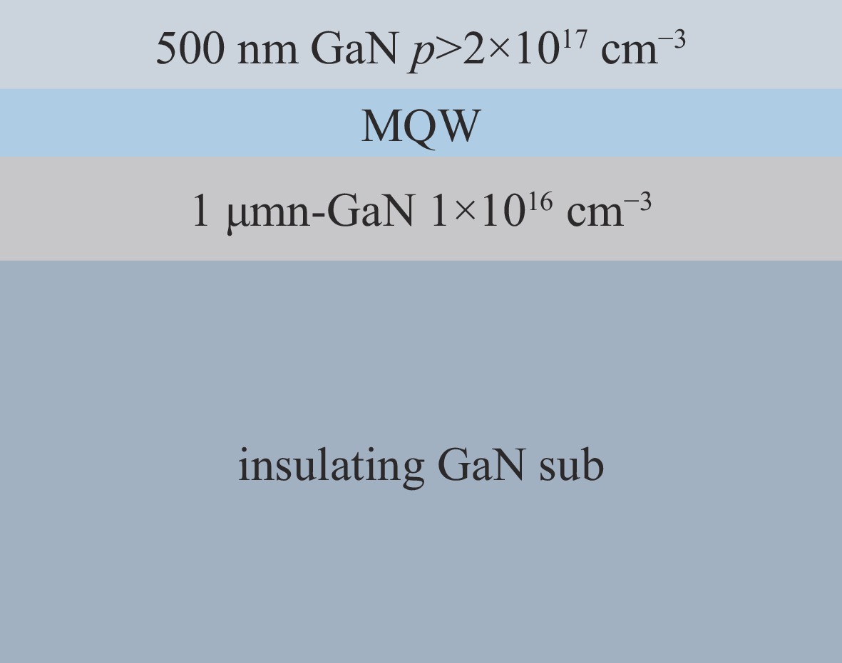 A 400 μm-thick unintentionally doped high-resistivity GaN single crystal was used as the radiation energy deposition layer. A PN junction structure with MQWs was epitaxially grown on the high-resistivity GaN substrate via metal-organic chemical vapor deposition (MOCVD). The epitaxial layer was segmented into independent regions using inductively coupled plasma (ICP) etching. Transparent indium tin oxide (ITO) electrodes were subsequently fabricated via magnetron sputtering, followed by the deposition of metal electrodes on both the top and bottom surfaces of the device.