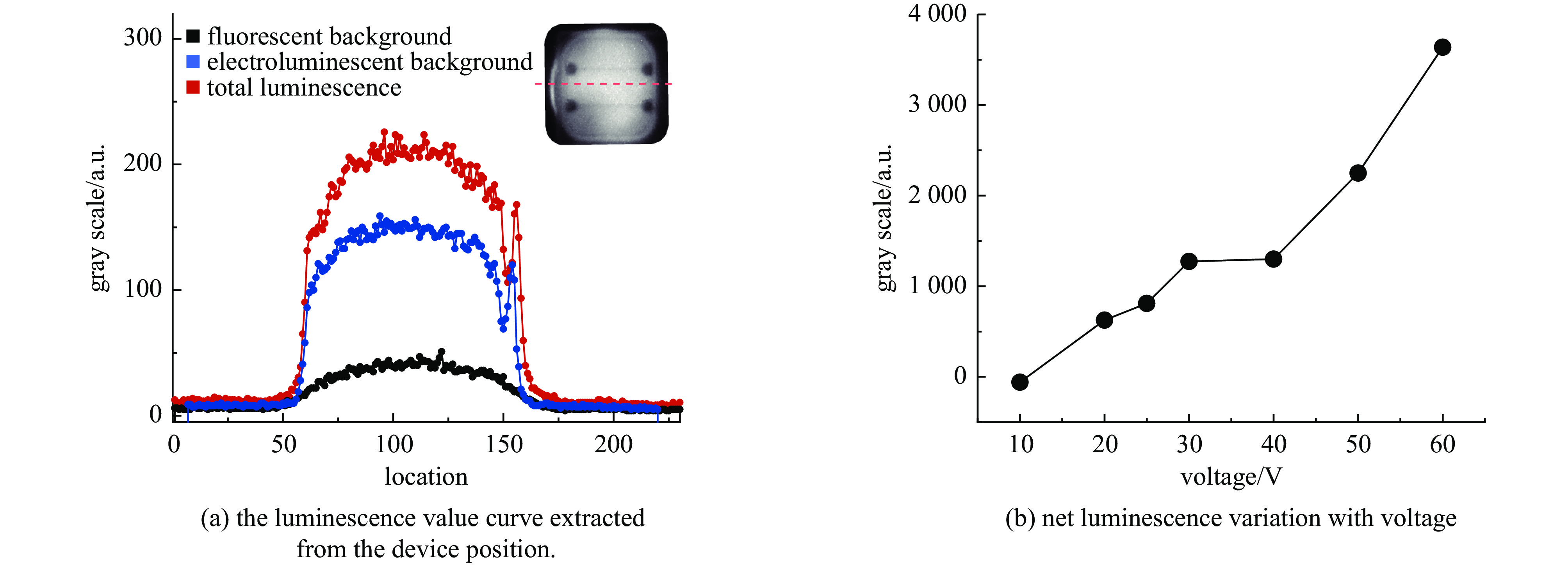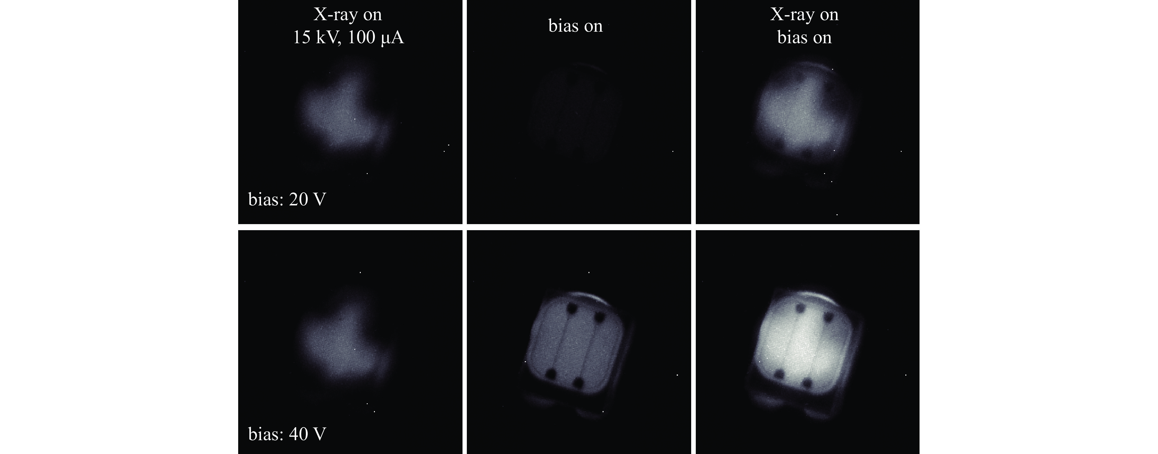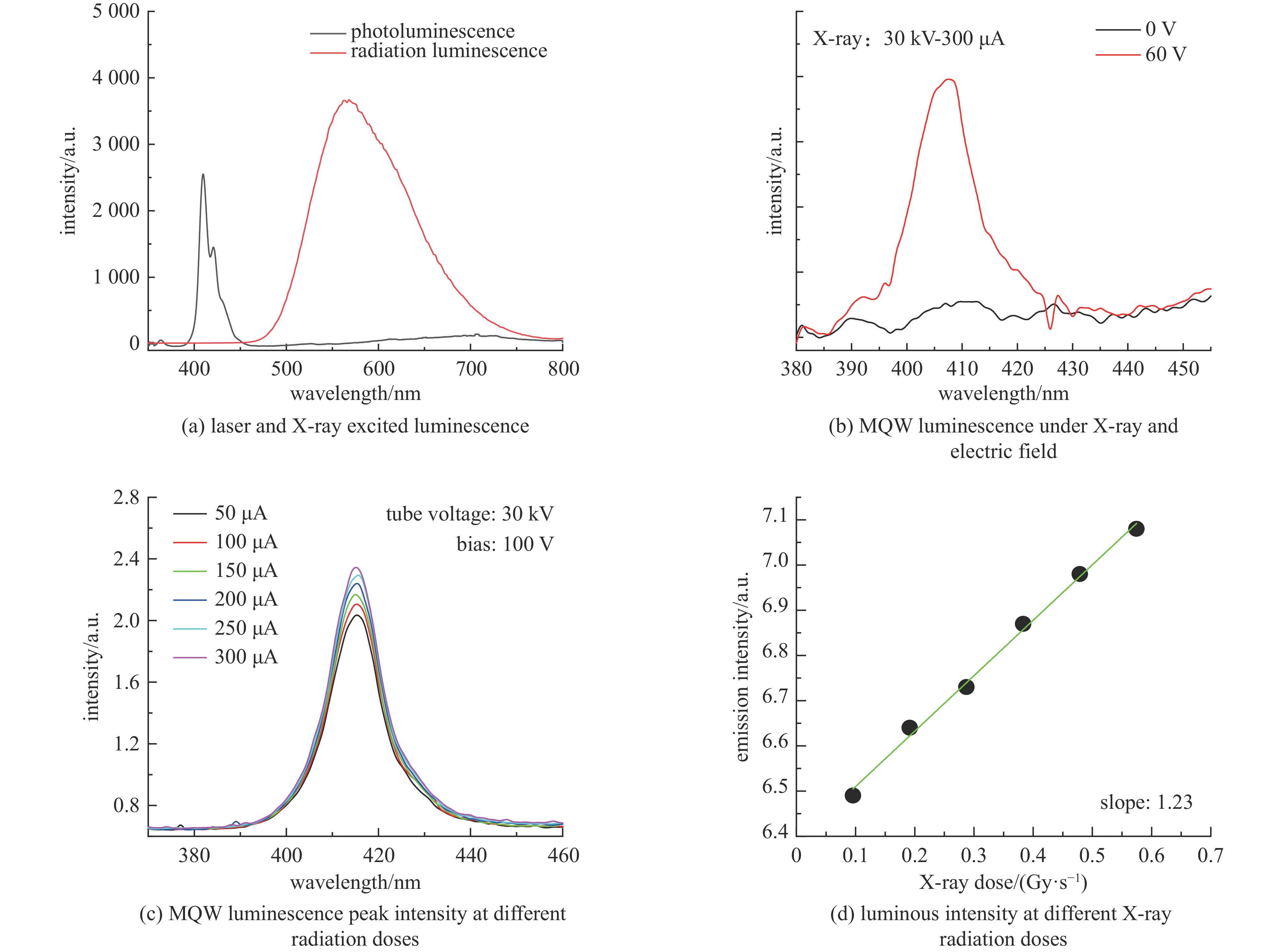 The device exhibited low dark current and sensitive X-ray response characteristics. A multi-quantum well recombination structure with a luminescence peak at 410 nm was incorporated into the device. Luminescence spectrum tests and imaging analyses confirmed the device’s response to varying radiation doses and changes in luminescence efficiency under different applied voltages.