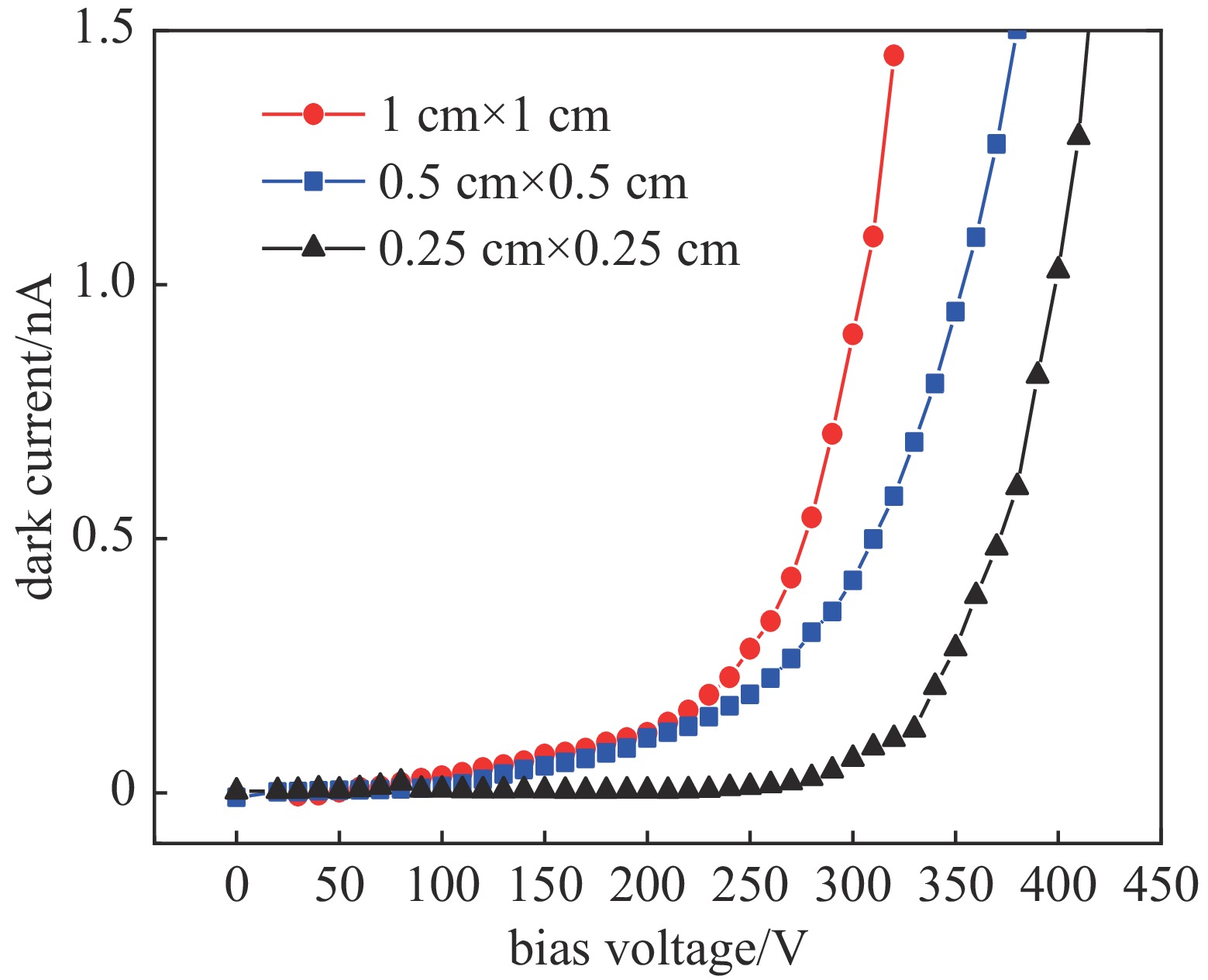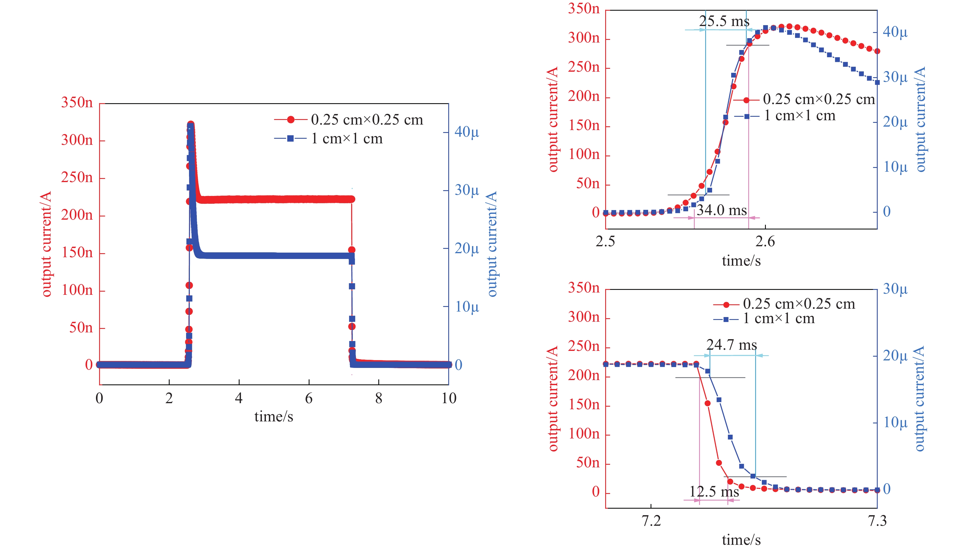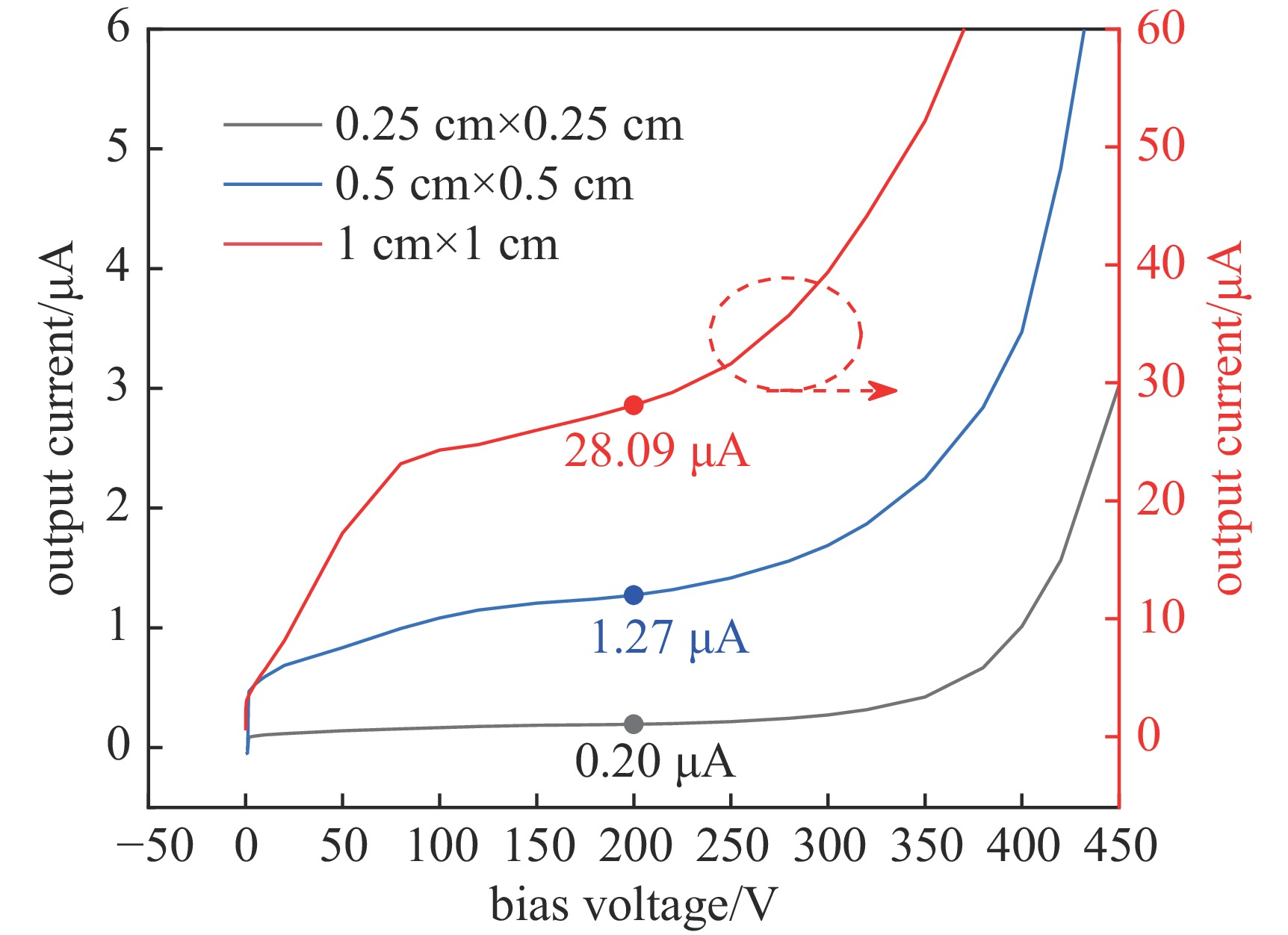 The results demonstrate that these detectors operate under the combined effects of externally-biased voltage and photovoltaic voltage, exhibiting four distinct knee points that divide the I-V characteristic curve into five stages. Under identical DC X-ray irradiation conditions, larger area detectors absorb more X-ray energy, leading to stronger output signals. Smaller area detectors show higher knee points on the I-V characteristic curve, indicating a greater ability to withstand the voltage. Additionally, the response time of the detectors is closely related to their size, with larger areas resulting in longer switch-off times.The 90%-10% fall time of the 1 cm×1 cm detector is approximately 12.2 ms longer than that of the 0.25 cm ×0.25 cm detector.