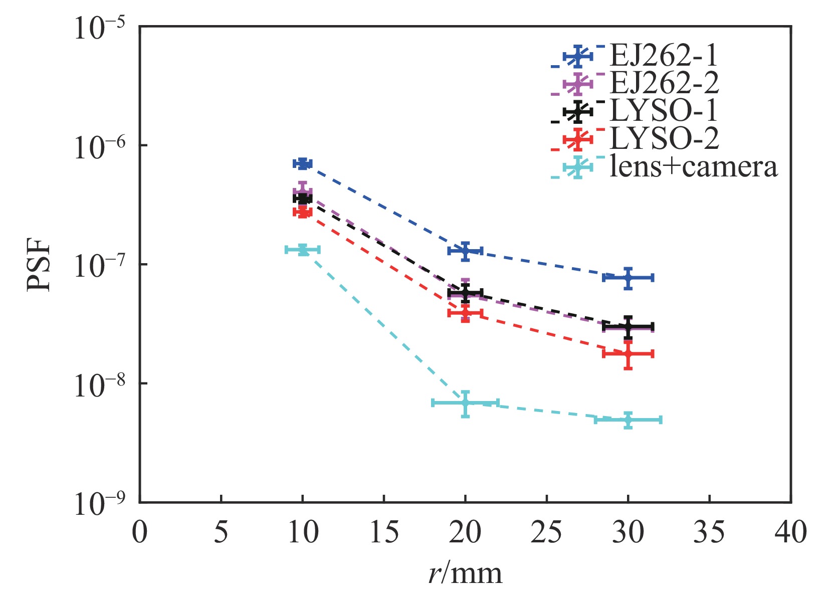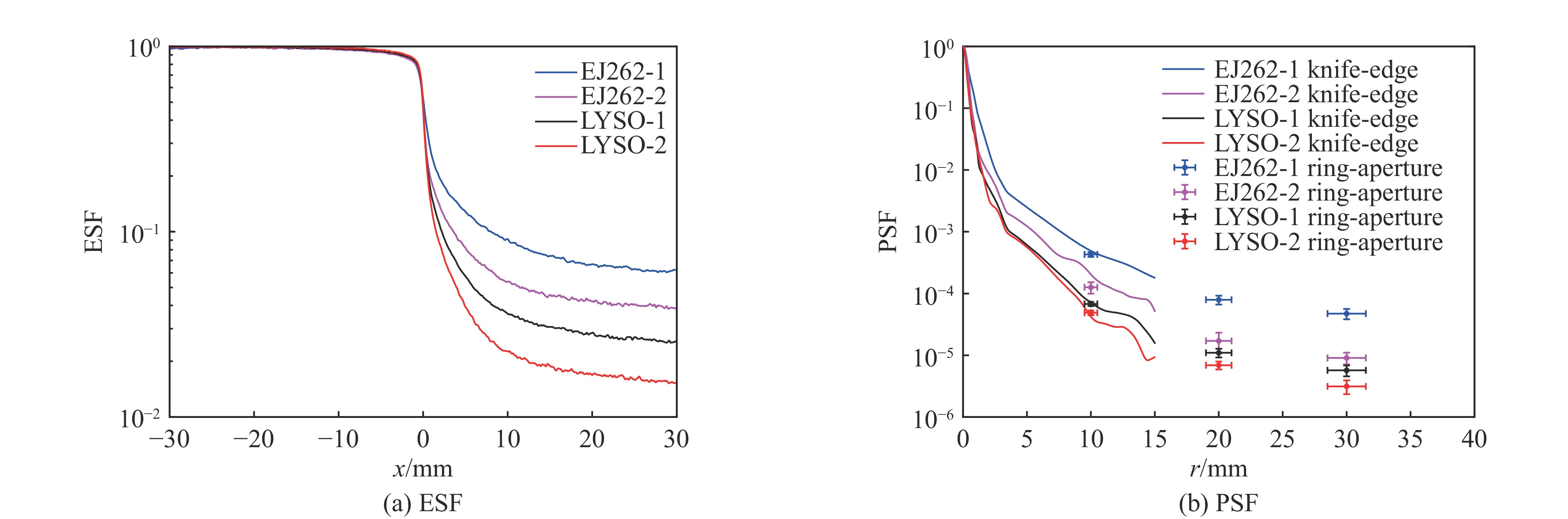 A direct measurement result of the low-frequency components was obtained for the first time, and the measurement lower limit was extended to 10−6 orders below the peak of PSF. Experiments showed that the surface state of scintillators can have a significant impact on low-frequency components. By blackening the non-light-emitting surface, the low-frequency components caused by scintillator can be reduced by 22% to 62%.
