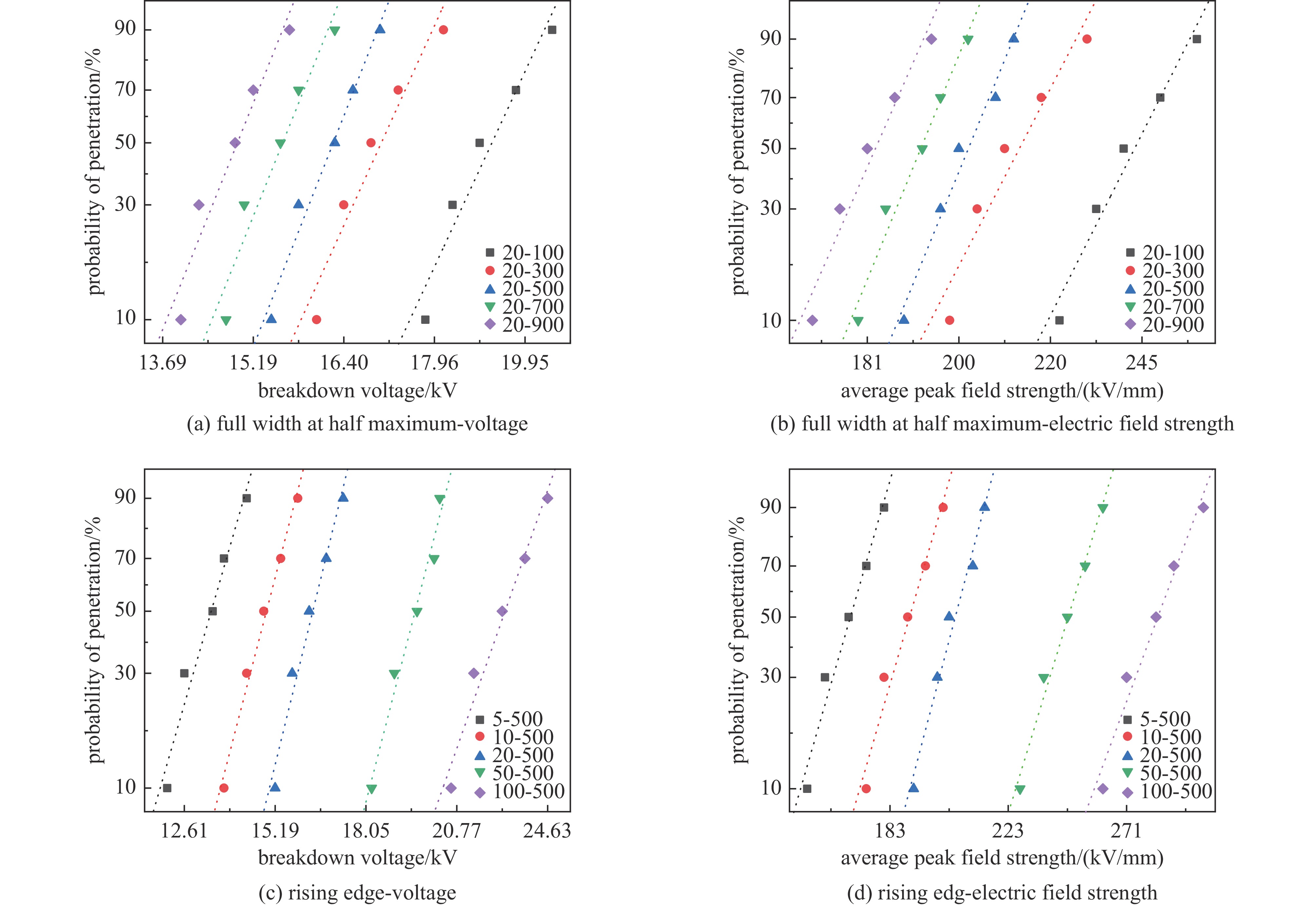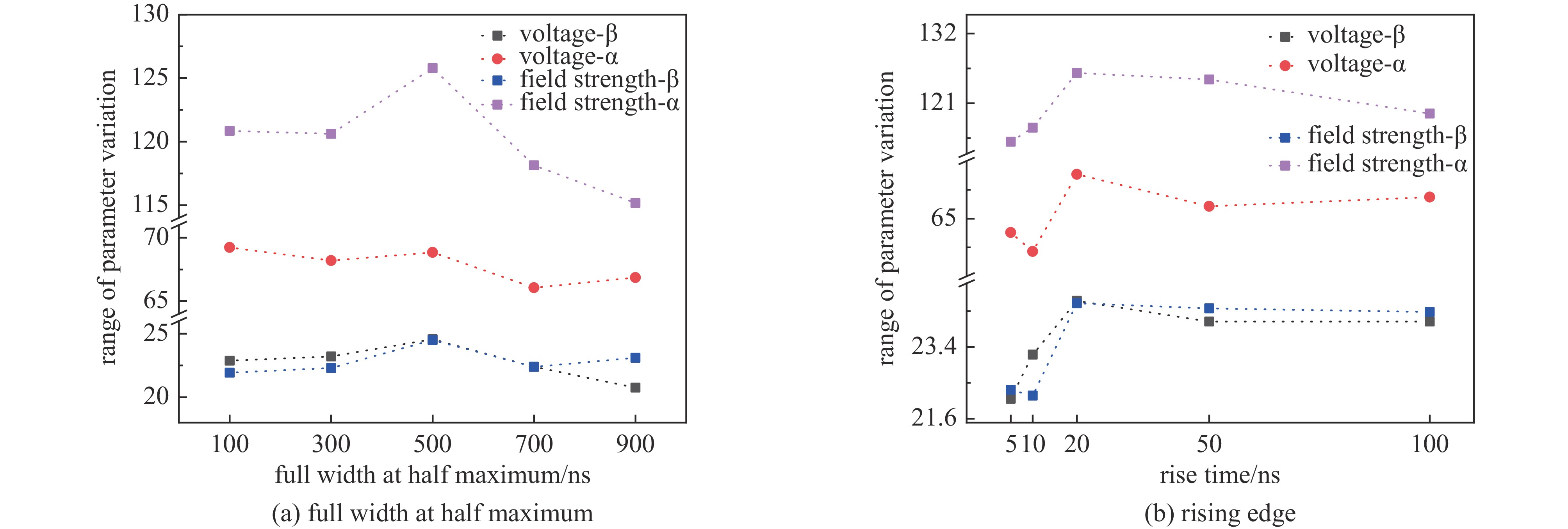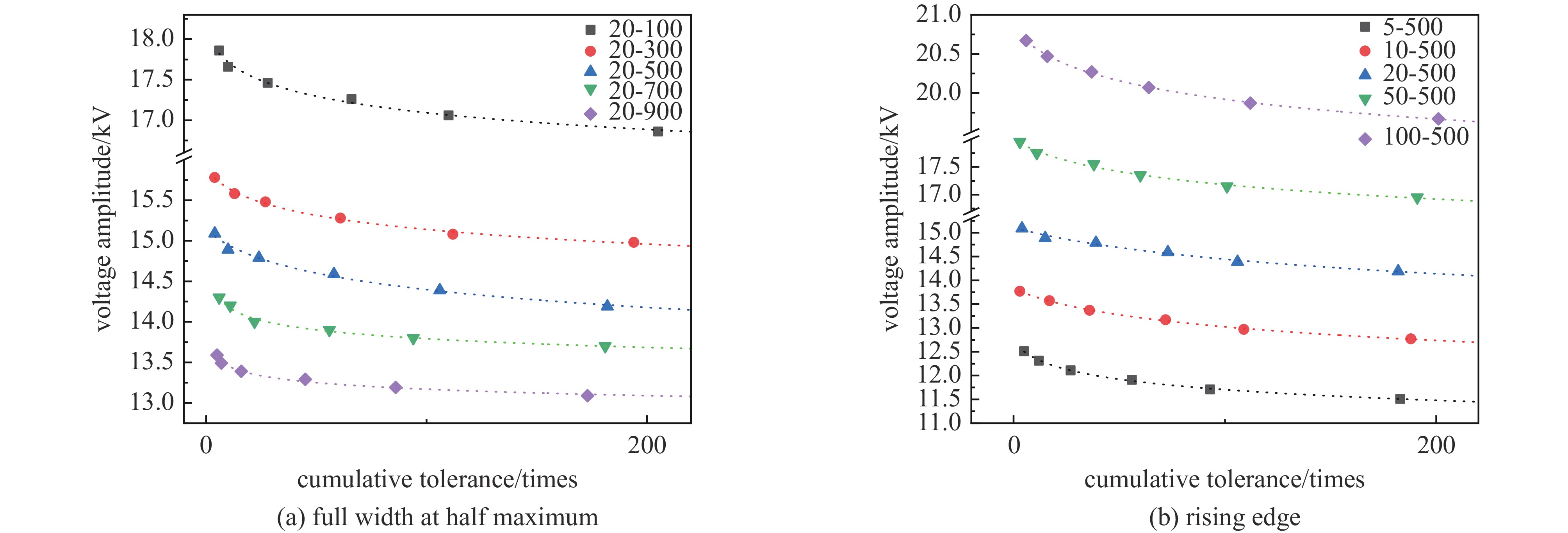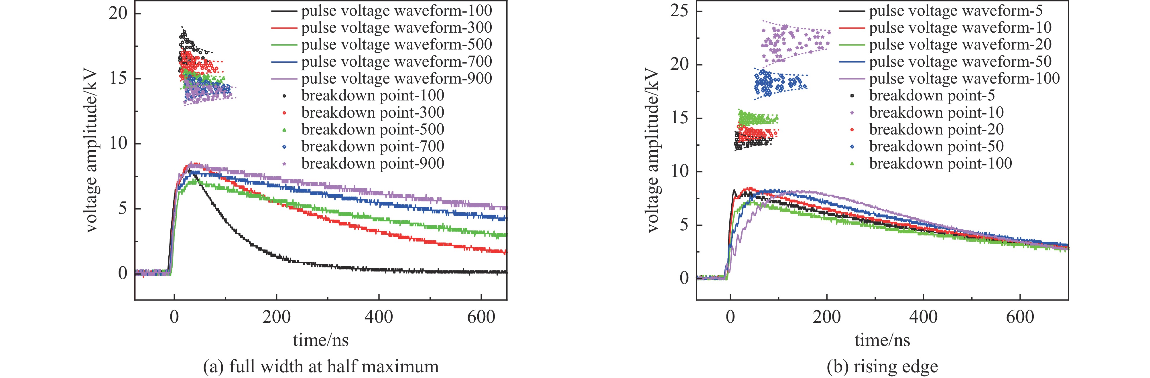 When the fixed rising edge is 20 ns, the breakdown voltage decreases as the half-height width increases; when the fixed half-height width is 500 ns, the breakdown voltage increases as the rising edge increases.