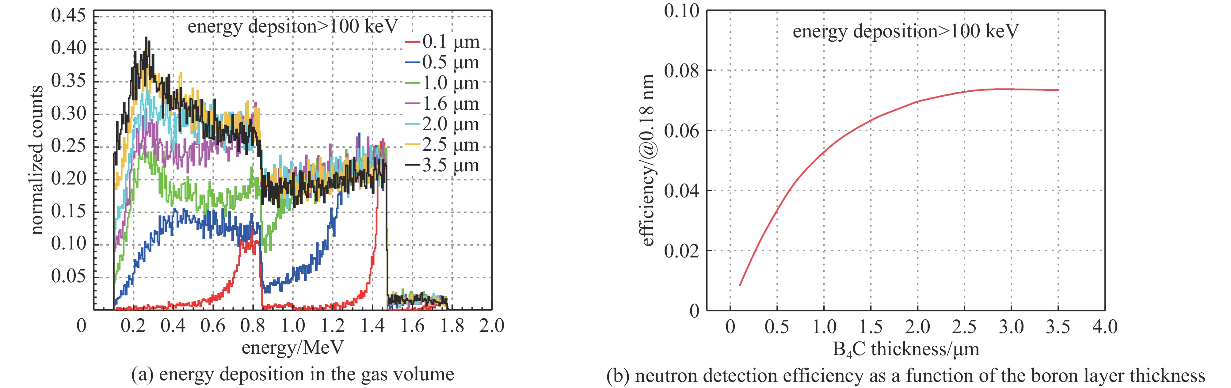 Simulation showed that thermal neutron detection efficiency was 1%-7% when boron coating thickness was 0.1-2.5 μm, and γ-ray sensitivity was < 5×10−6 at a 100 keV energy threshold. Experimental results indicated the detector's pulse height spectrum matched the simulated energy deposition. After background subtraction, its detection efficiencies for 1.8 Å, 2.9 Å, and 4.8 Å neutrons were 4.2%, 6.0%, and 9.4%, respectively, consistent with the 10B neutron absorption cross-section law.