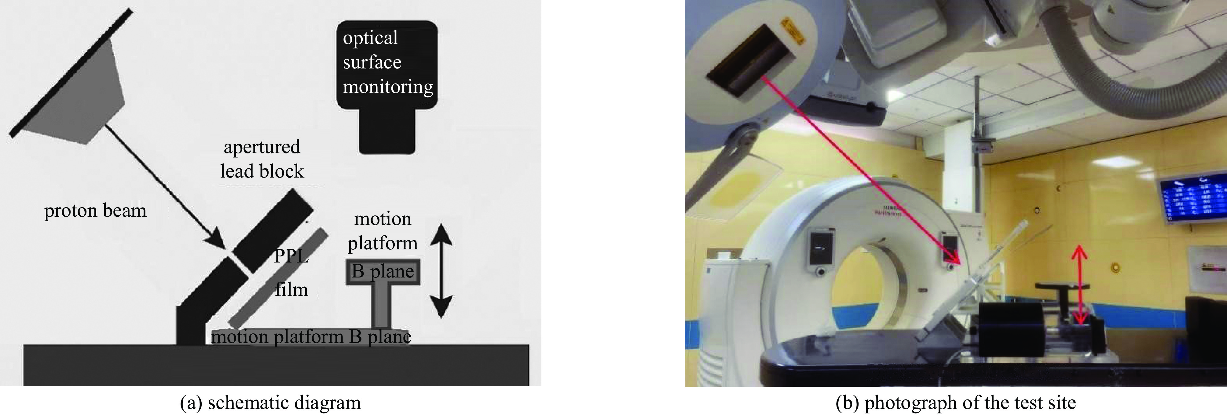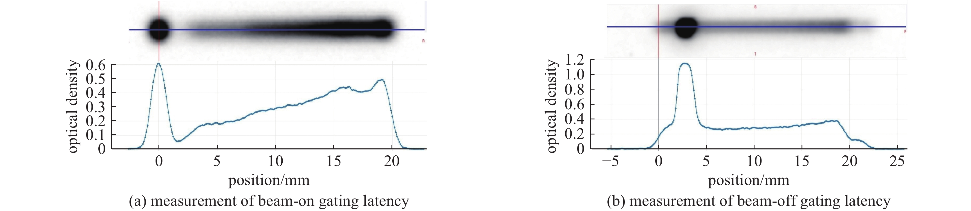 Two measurements were conducted using a PPL film method and a high-speed camera-detector method. In the film method, a proton beam traversed a 1.5-mm-diameter aperture in a lead collimator, producing on the film a striped pattern that encodes latency; the films were digitized at 0.10 mm resolution for analysis. In the camera-detector method, a 240 frames/s high-speed camera recorded the instant the gating condition was met, and gate-on and gate-off delays were computed from the time difference to the detector-registered radiation signal. End-to-end latency was measured with both methods, and results were cross-validated using combined uncertainty.