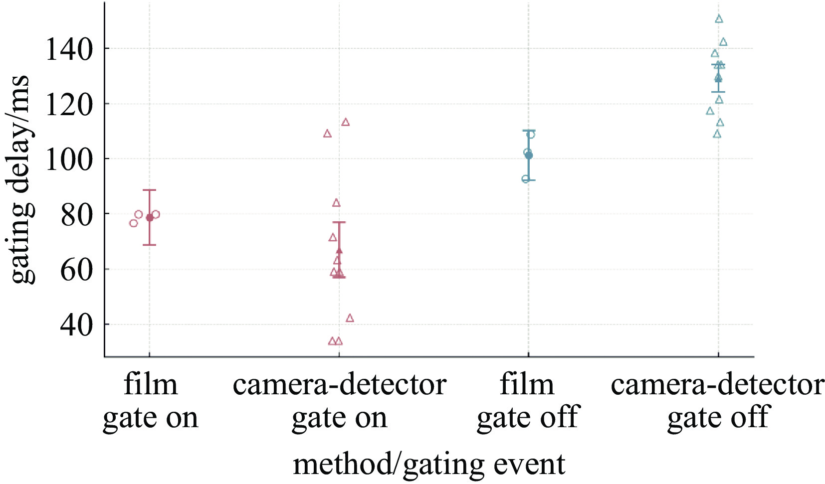 The gate-on latency measured by the film method and the camera–detector method was 79 ms±10 ms and 67 ms±10 ms, respectively; the corresponding gate-off latency was 101 ms±9 ms and 129 ms±5 ms. Across two measurement methods, gate-on latencies were concordant within the combined standard uncertainty, whereas gate-off latency showed a significant method-dependent discrepancy, indicating systematic bias.