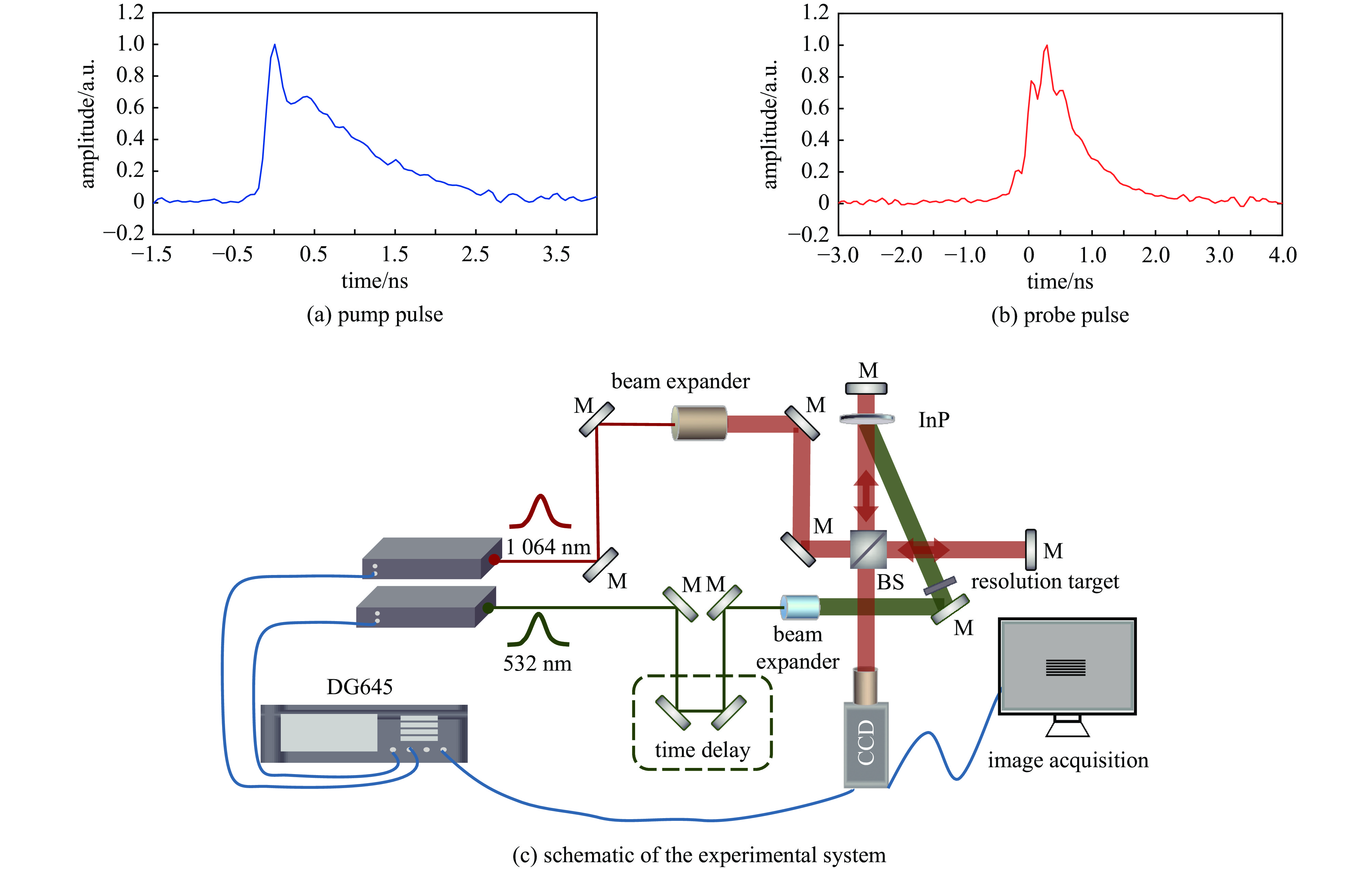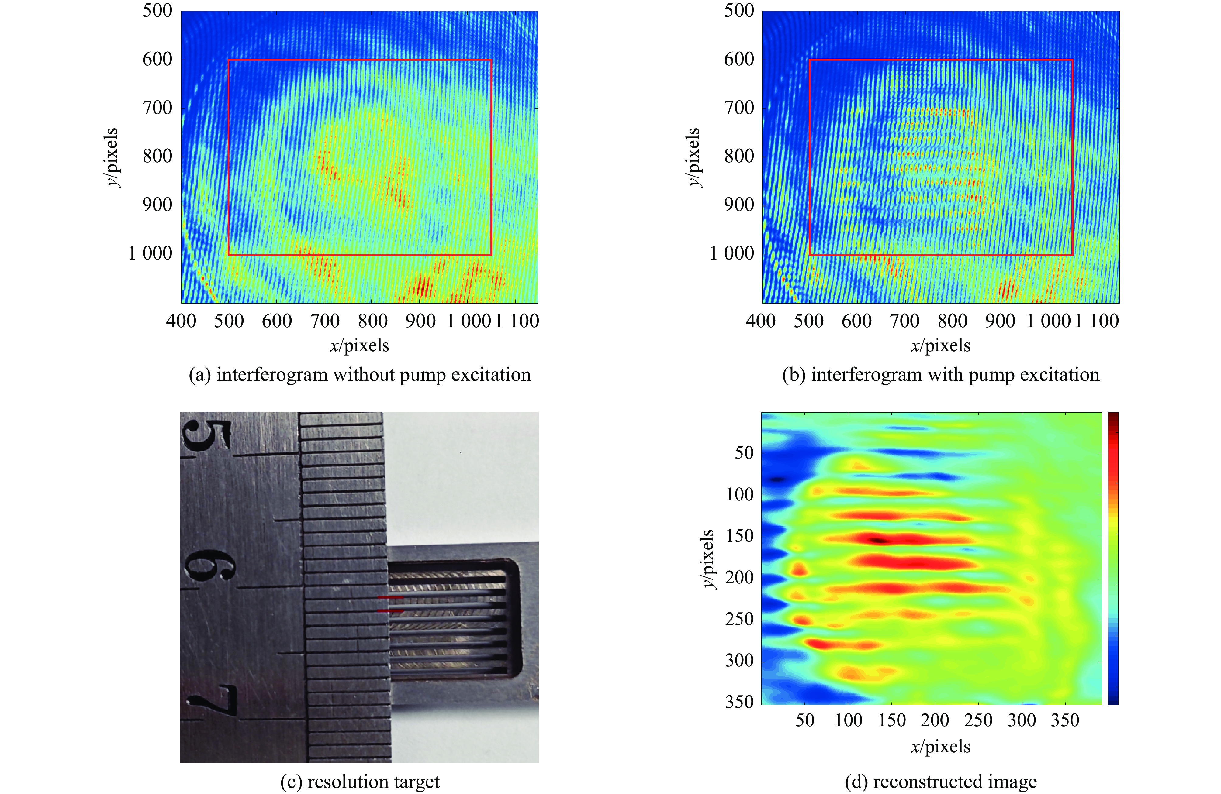 Using this setup, refractive index change images within the crystal induced by laser pulse excitation with wavelength of 532 nm were successfully captured. Pump-probe measurements revealed that the iron-doped InP crystal exhibited a time response of 1.5 ns under pump laser irradiation. Spatial resolution was characterized by placing a resolution target in the pump beam path; image reconstruction achieved a system spatial resolution of 1 lp/mm.