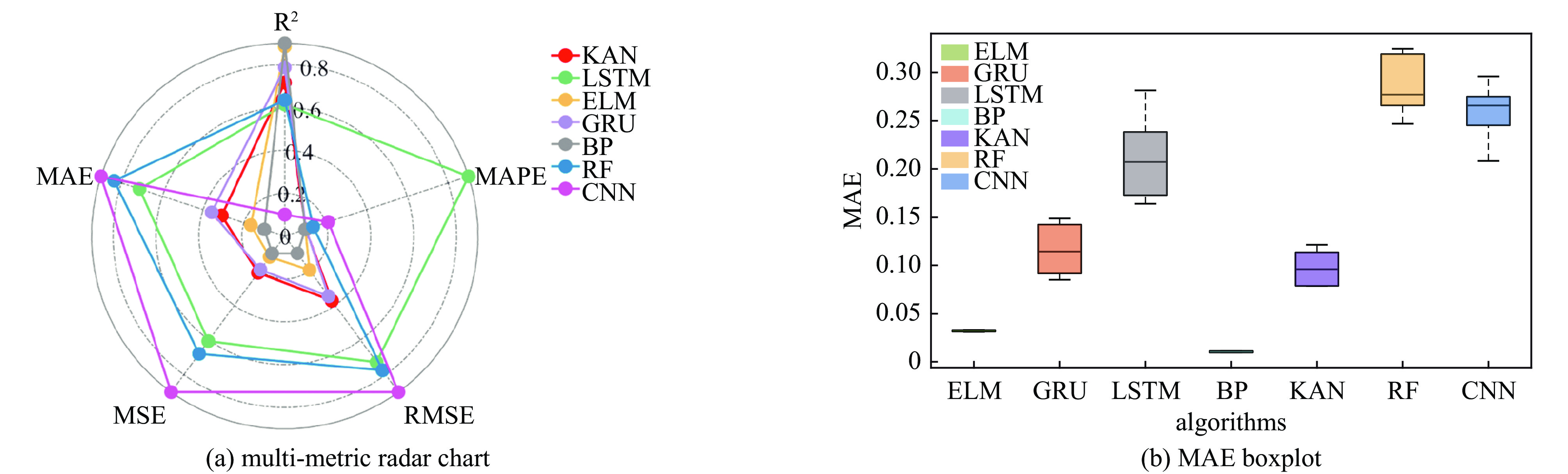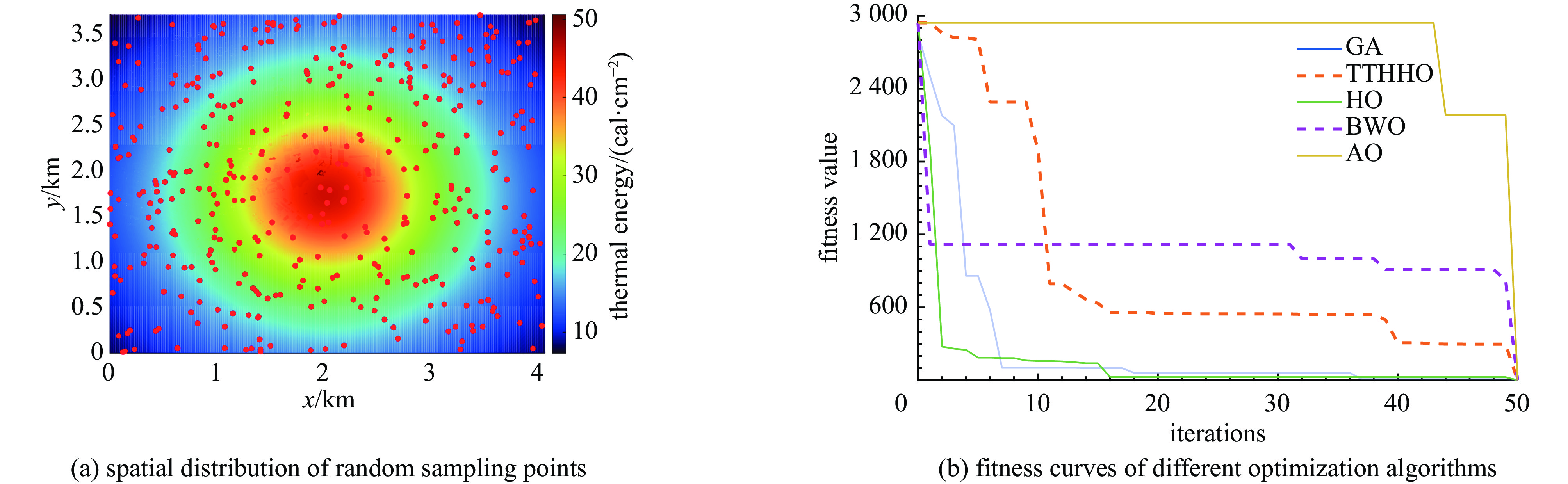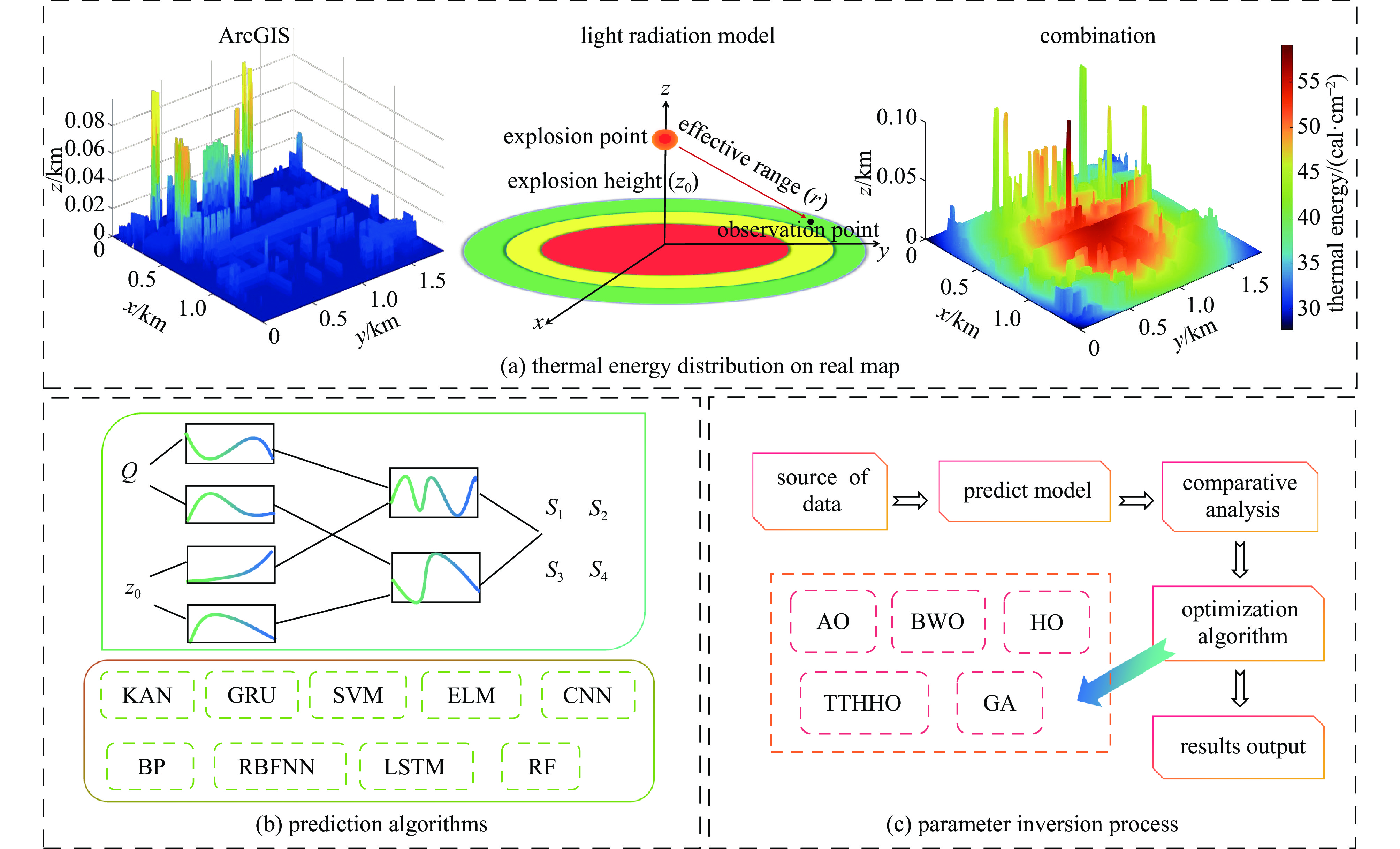 Based on the theory of nuclear explosion fireballs, a light radiation model was developed and integrated with ArcGIS Pro software to visualize thermal energy distribution on real-world maps. A dataset correlating explosion yield and height with damage area was then generated, quantified according to established standards for biological burn injuries. The KAN was trained on this dataset, leveraging its unique advantage of providing explicit, interpretable formulas for prediction. To validate its efficacy, the KAN's performance was benchmarked against eight other algorithms, including Gated Recurrent Unit (GRU), Extreme Learning Machine (ELM), and Random Forest (RF). A loss function was constructed for the radiation model to facilitate the inversion of source term parameters via multiple optimization algorithms.