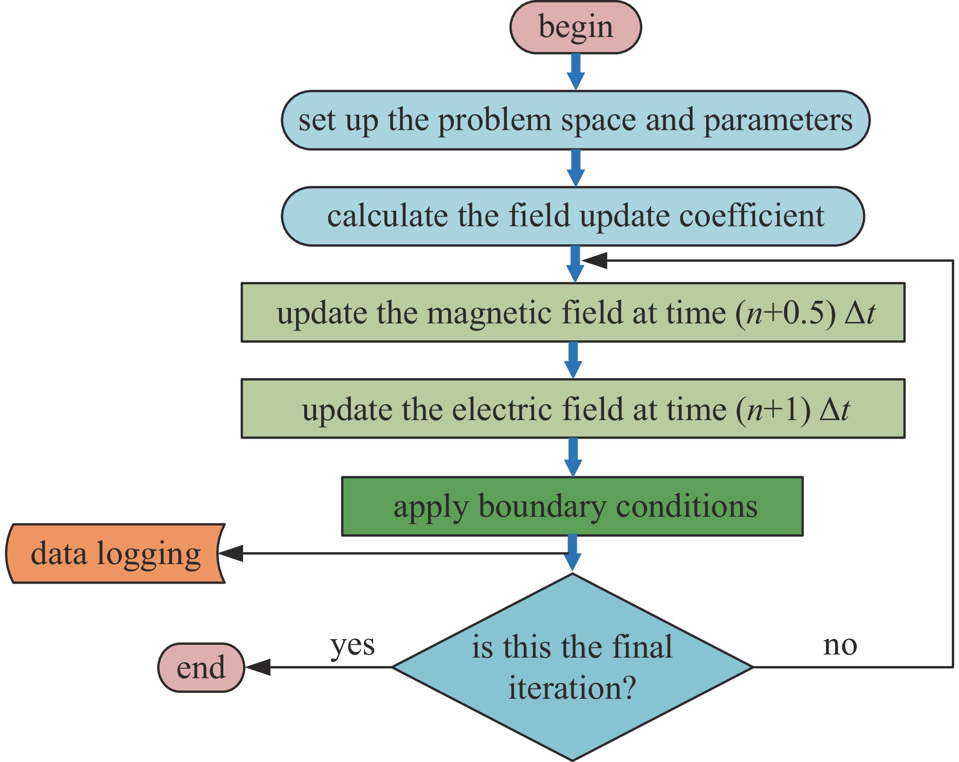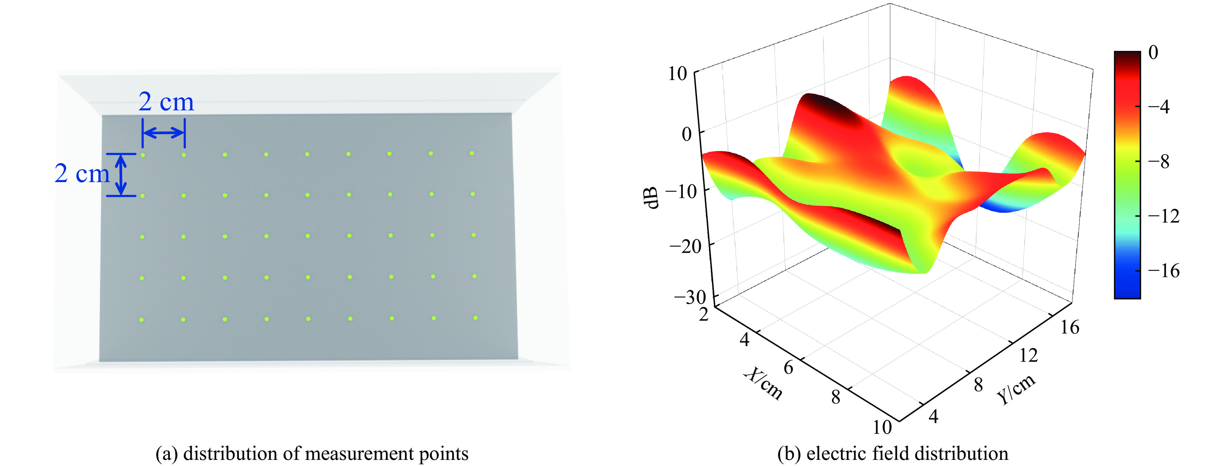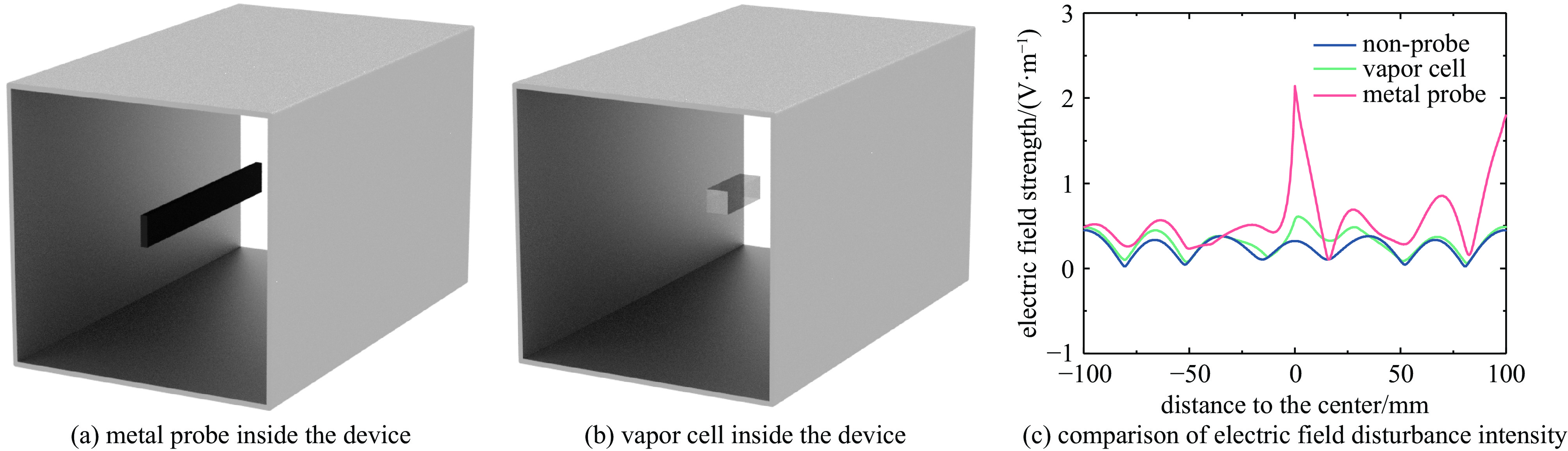 The FDTD algorithm was used to compare field disturbance differences between metal probes and Rydberg atomic vapor cells; an experimental system centered on a cesium atomic vapor cell was built, combining electromagnetically induced transparency (EIT) spectroscopy and atomic superheterodyne technology. 45 measurement points with 2cm intervals were set in a square metal shell-simulated device to complete electric field measurement and data processing.