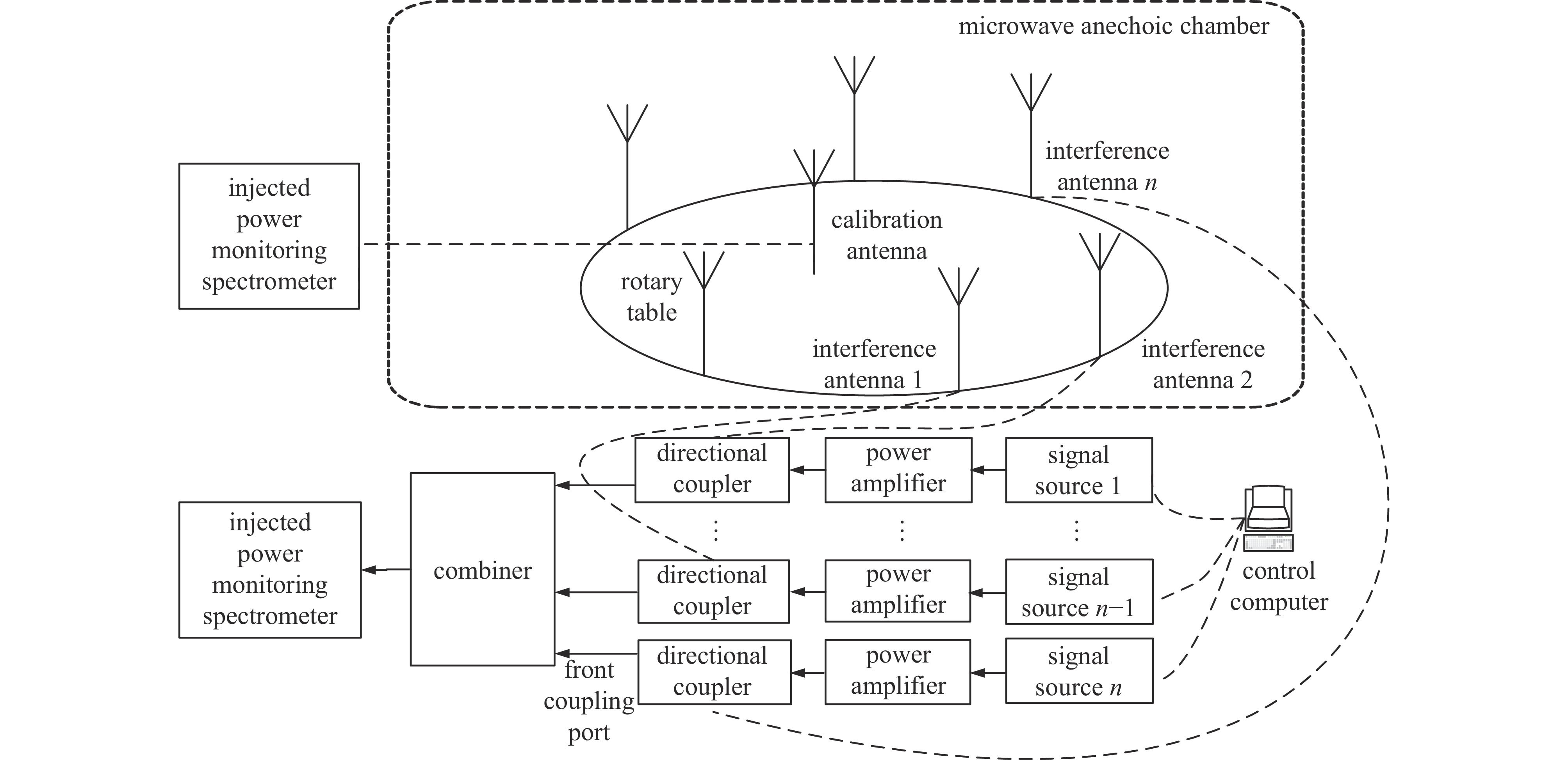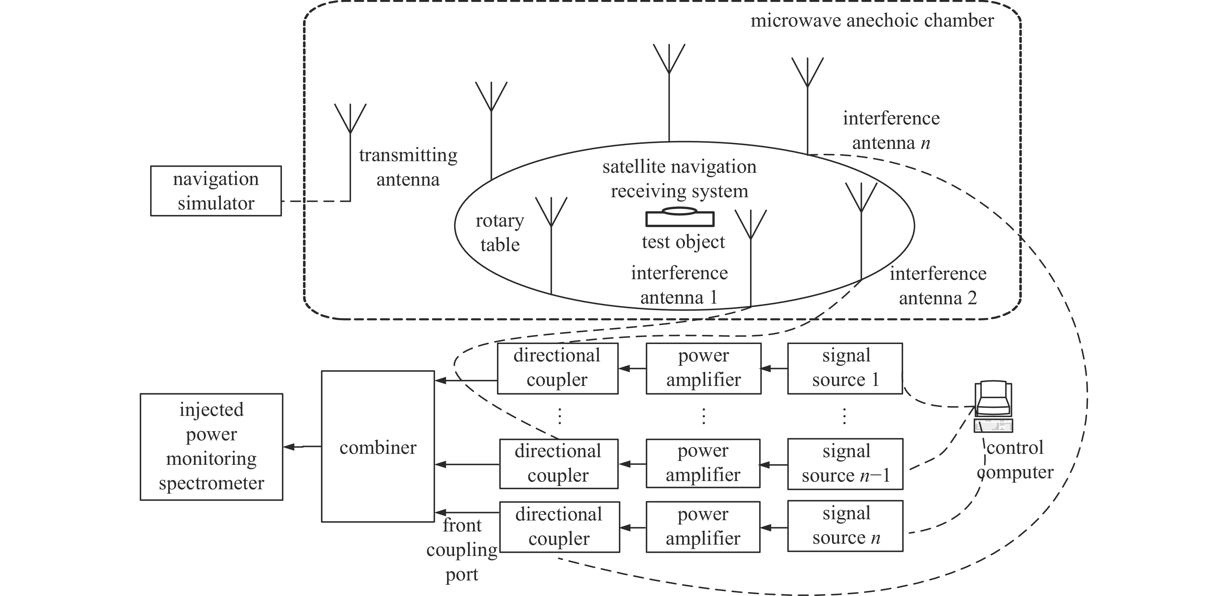 A hybrid test methodology integrating direct radio frequency injection and over-the-air (OTA) spatial irradiation was established within a microwave anechoic chamber. This “injection-irradiation” approach facilitates a full-link evaluation. Both static and dynamic tests were conducted on a seven-element GNSS adaptive array receiver. Static tests involved assessing performance against an increasing number of jammers (one to six) from fixed spatial locations. Dynamic tests simulated UAV maneuvers by placing the receiver on a turntable rotating at 2°/s, exposing it to a changing interference geometry. Performance was quantified by the jamming-to-signal (J/S) ratio threshold, carrier-to-noise ratio, and positioning success rate.