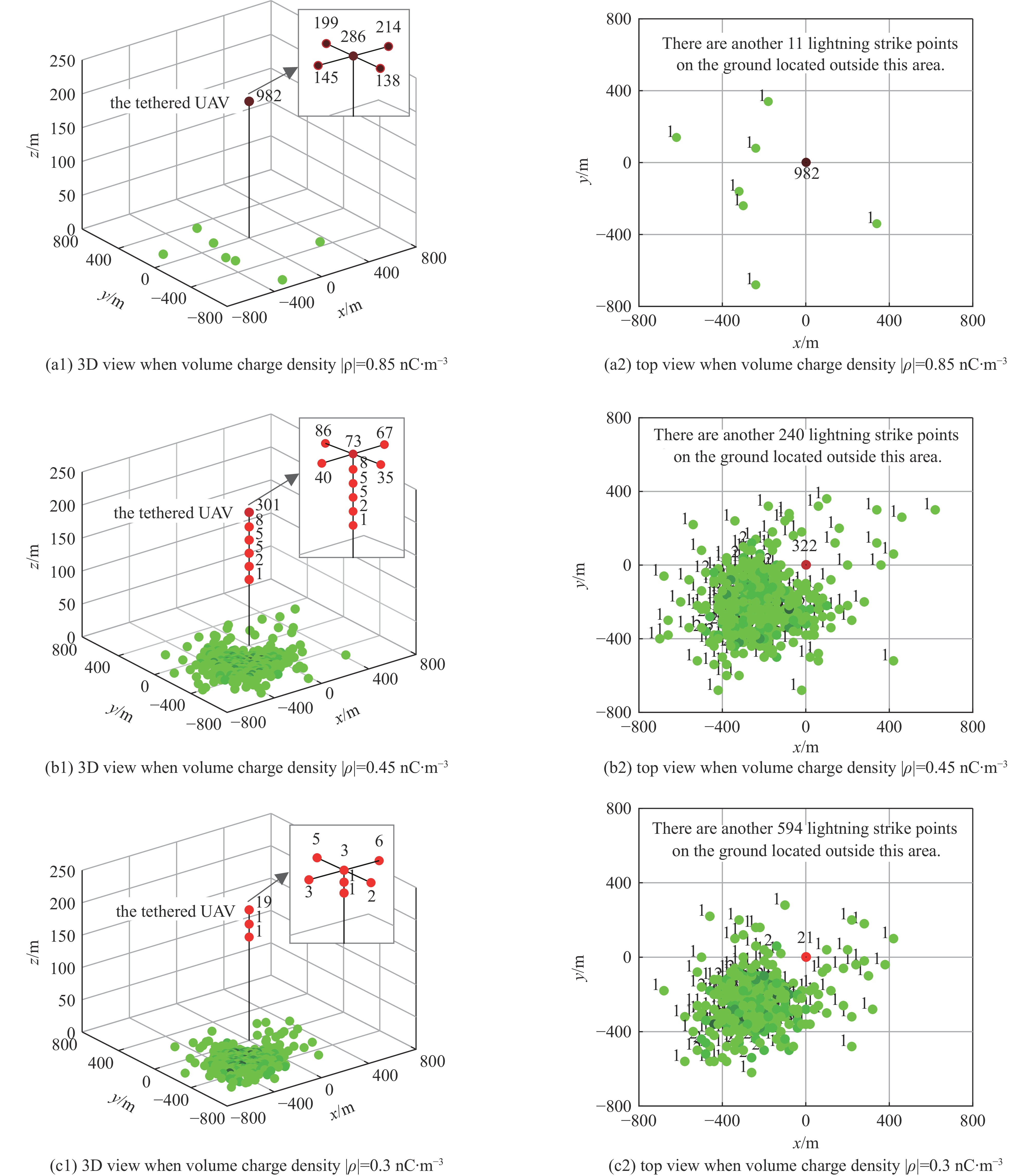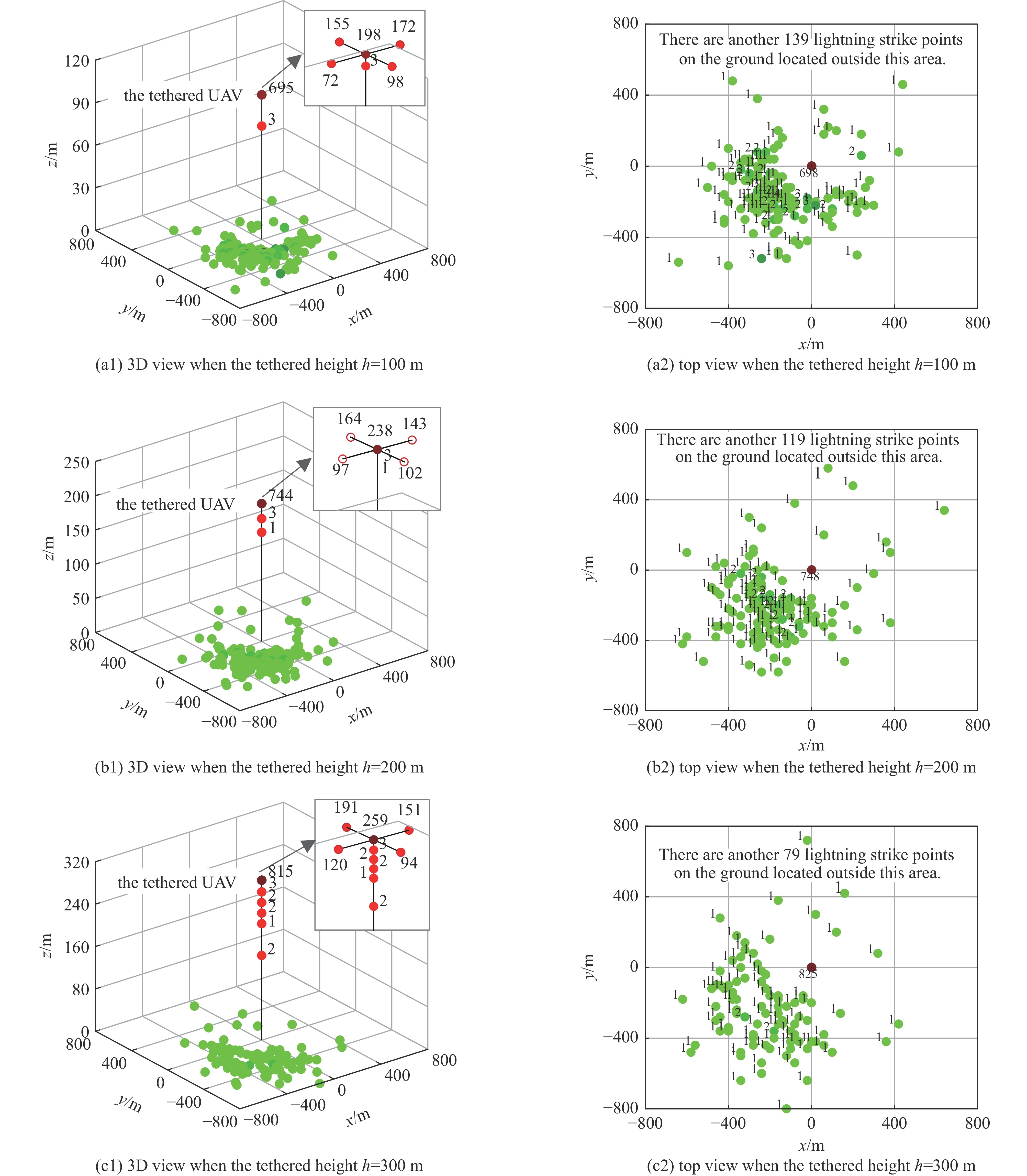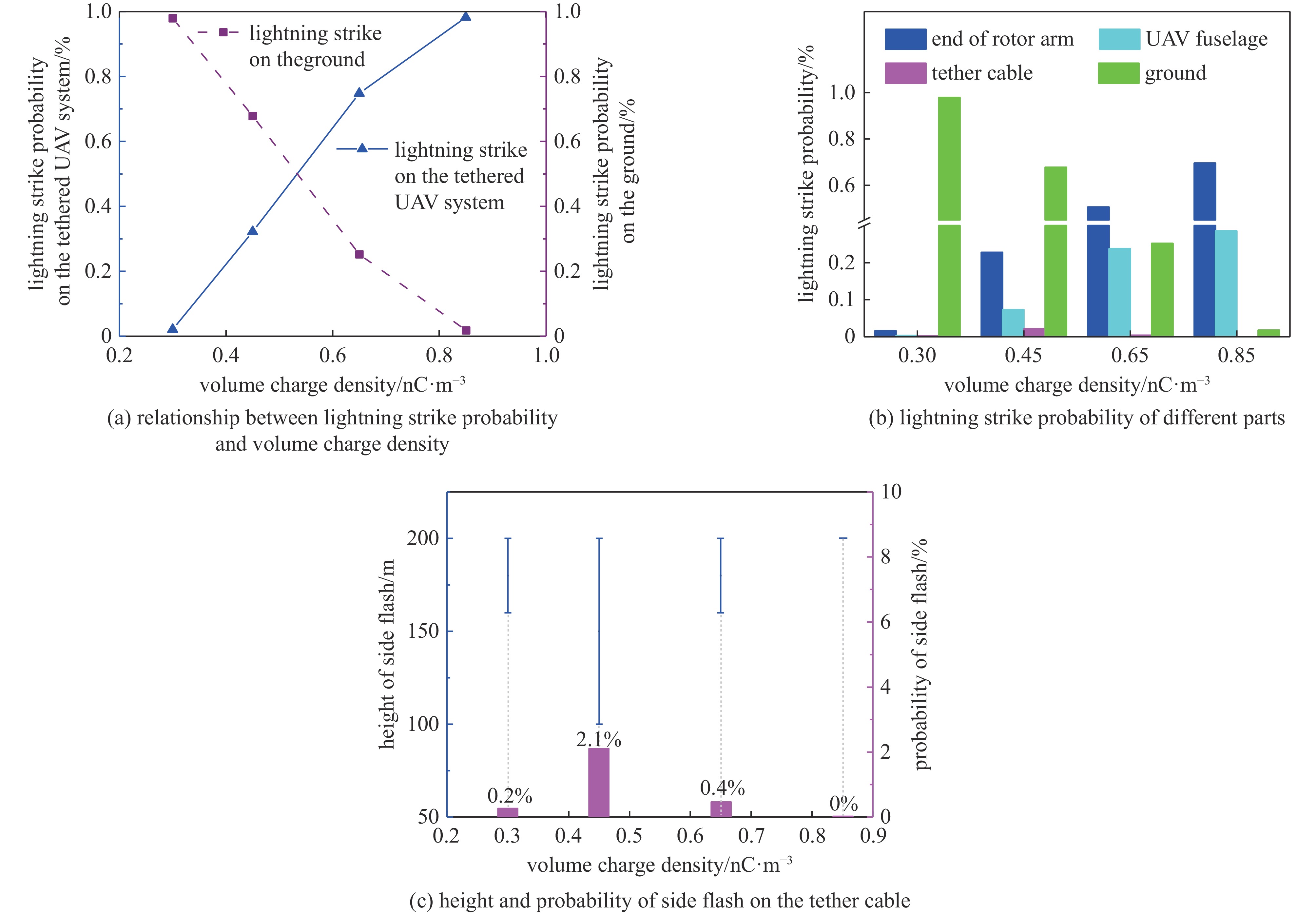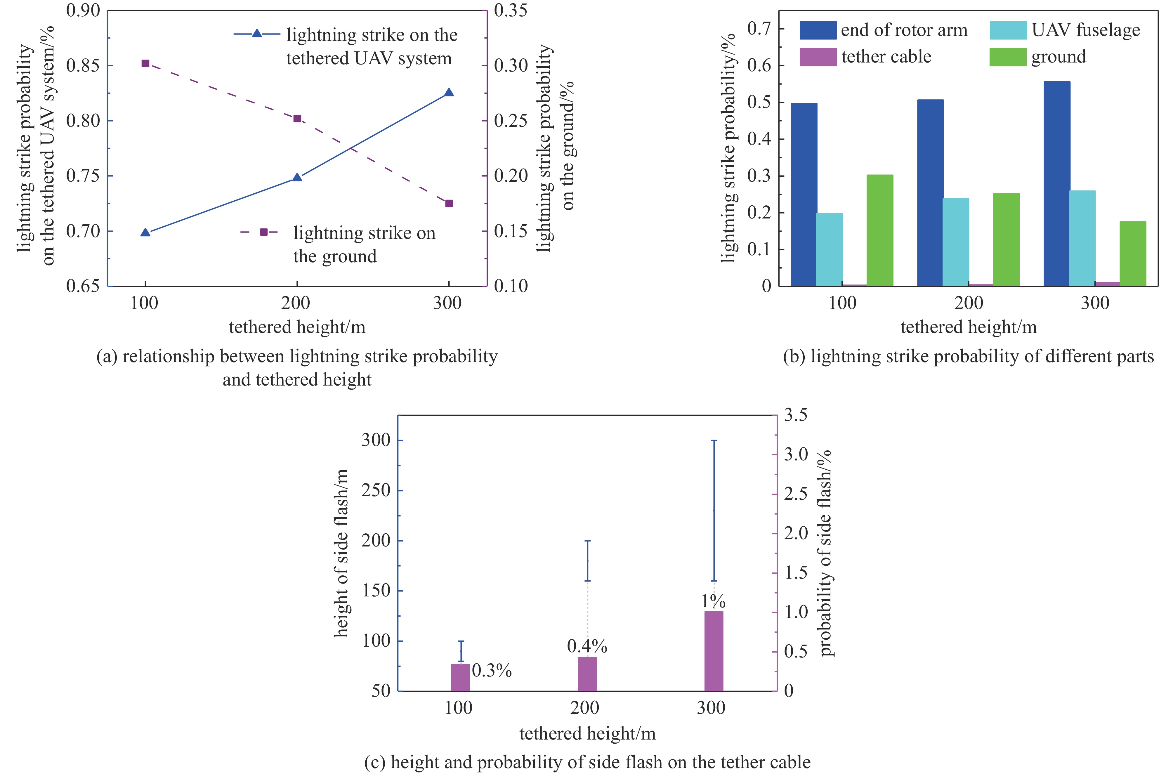 The results of the numerical simulation show that the lightning strike probability of the tethered UAV system increases approximately linearly with the increase of the tethered height and the volume charge density of thundercloud. When the tethered UAV system is struck by lightning, the lightning strike probability on the end of the rotor arm is the highest, followed by the UAV fuselage, and the lightning strike probability on the tether cable is relatively low.