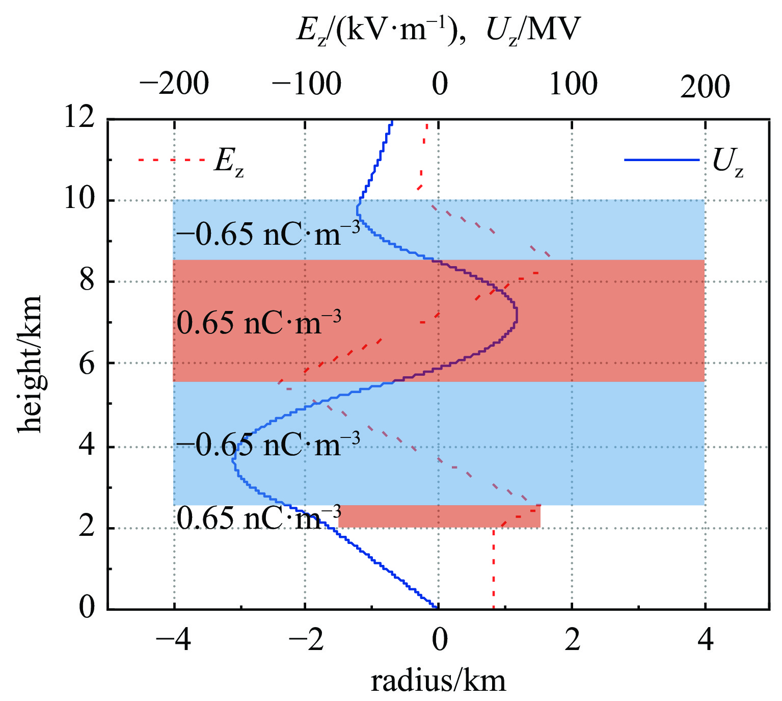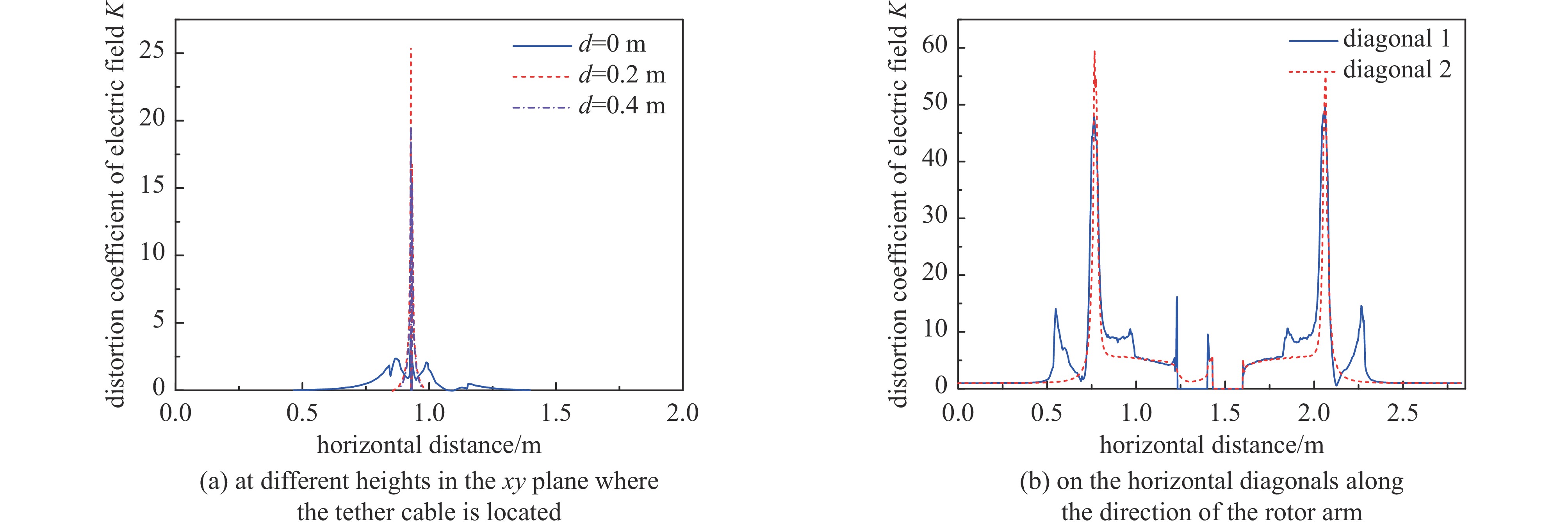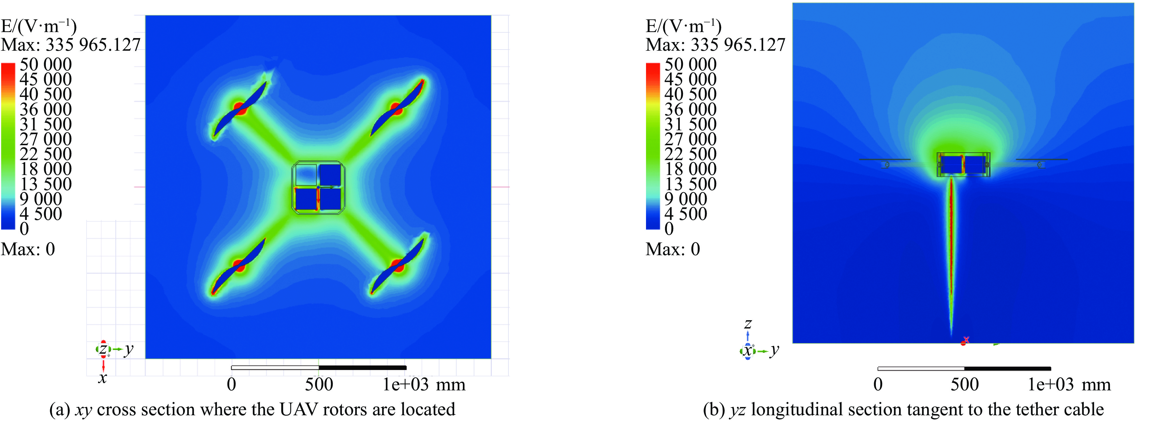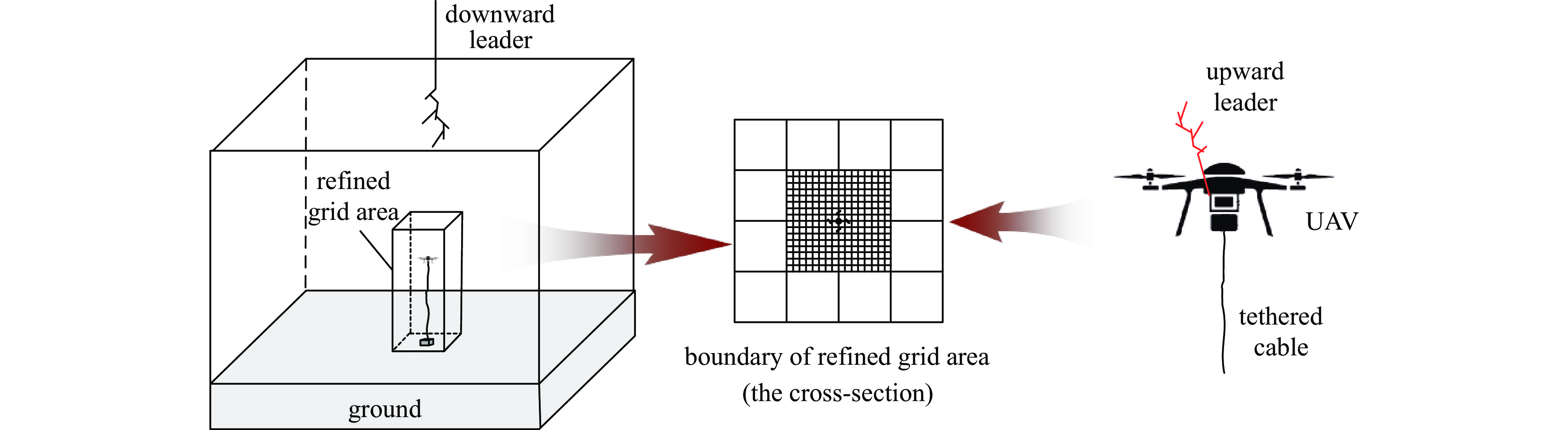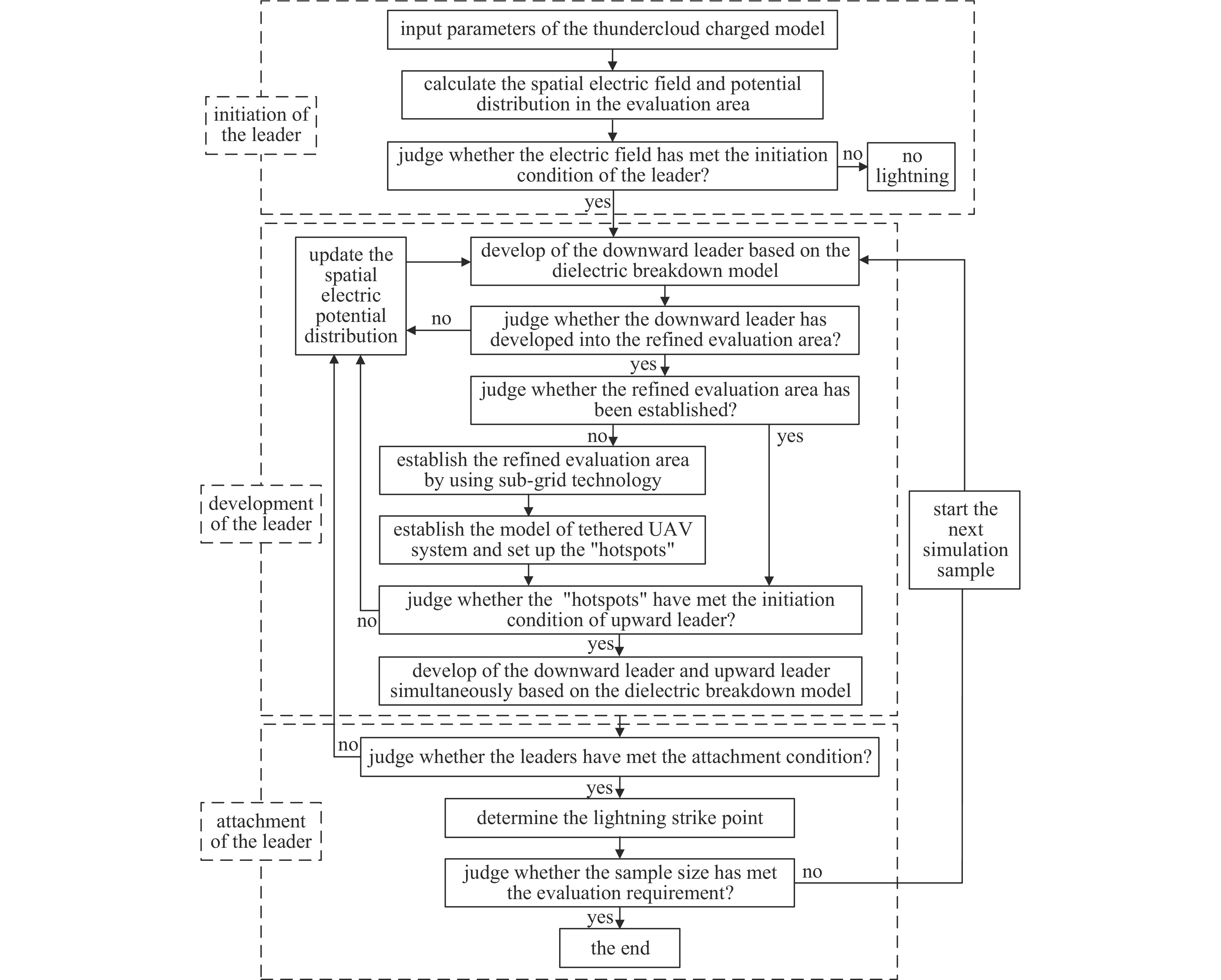 The results of the numerical simulation show that the lightning strike probability of the tethered UAV system increases approximately linearly with the increase of the tethered height and the volume charge density of thundercloud. When the tethered UAV system is struck by lightning, the lightning strike probability on the end of the rotor arm is the highest, followed by the UAV fuselage, and the lightning strike probability on the tether cable is relatively low.