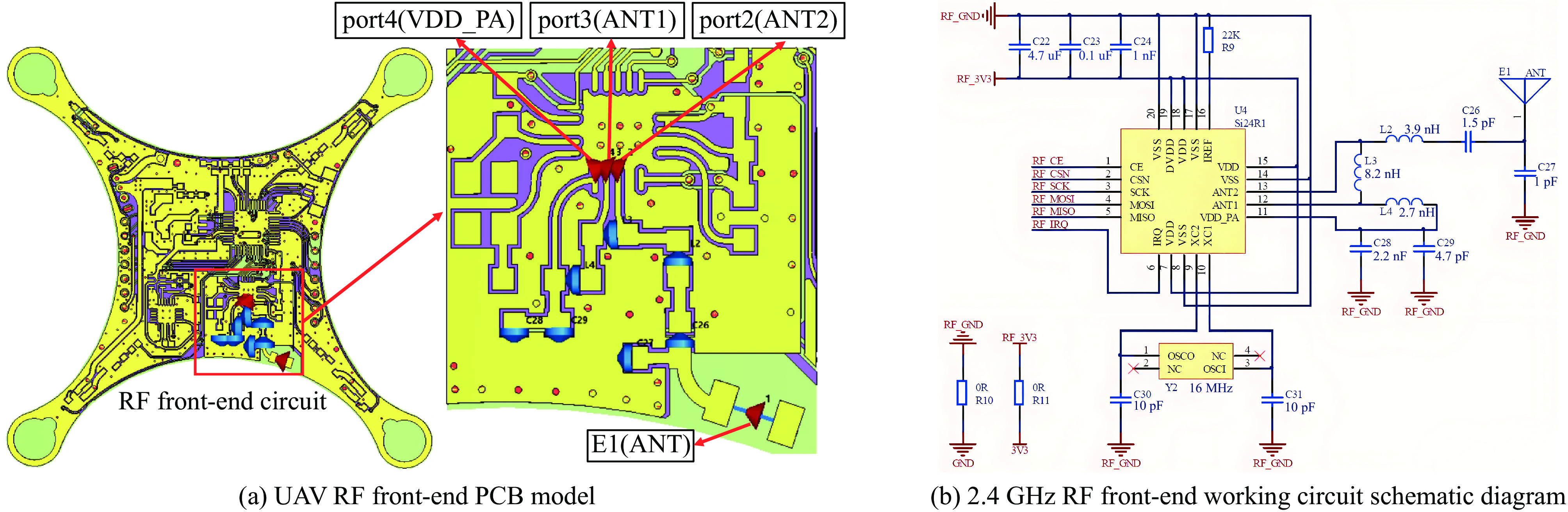 Models of the datalink antenna and RF front-end PCB were developed using Computer Simulation Technology (CST) software. The antenna was irradiated with HPM pulses with variations in carrier frequency, pulse width, polarization direction, and rise time. The coupled voltage waveforms at the antenna output ports were analyzed. These voltages were injected into the receiver circuit model to determine the coupled voltage at the pins of the RF chip (Si24R1), thus simulating the complete HPM field-to-circuit coupling process. A 2.45 GHz PIN limiter was implemented for electromagnetic protection.