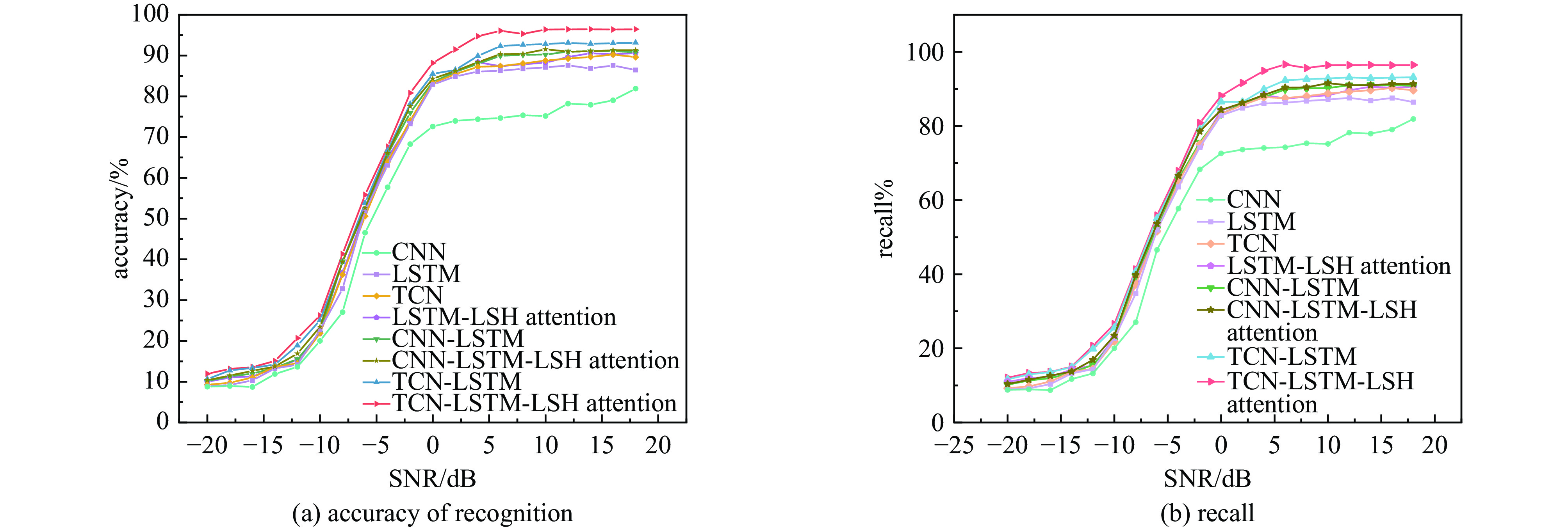 Experimental results on the RML2016.10a dataset show that compared with seven baseline algorithms, the TCN-LSTM-LSH attention algorithm has the best recognition performance, with an overall recognition accuracy of 64.71% for 11 types of signal modulations.