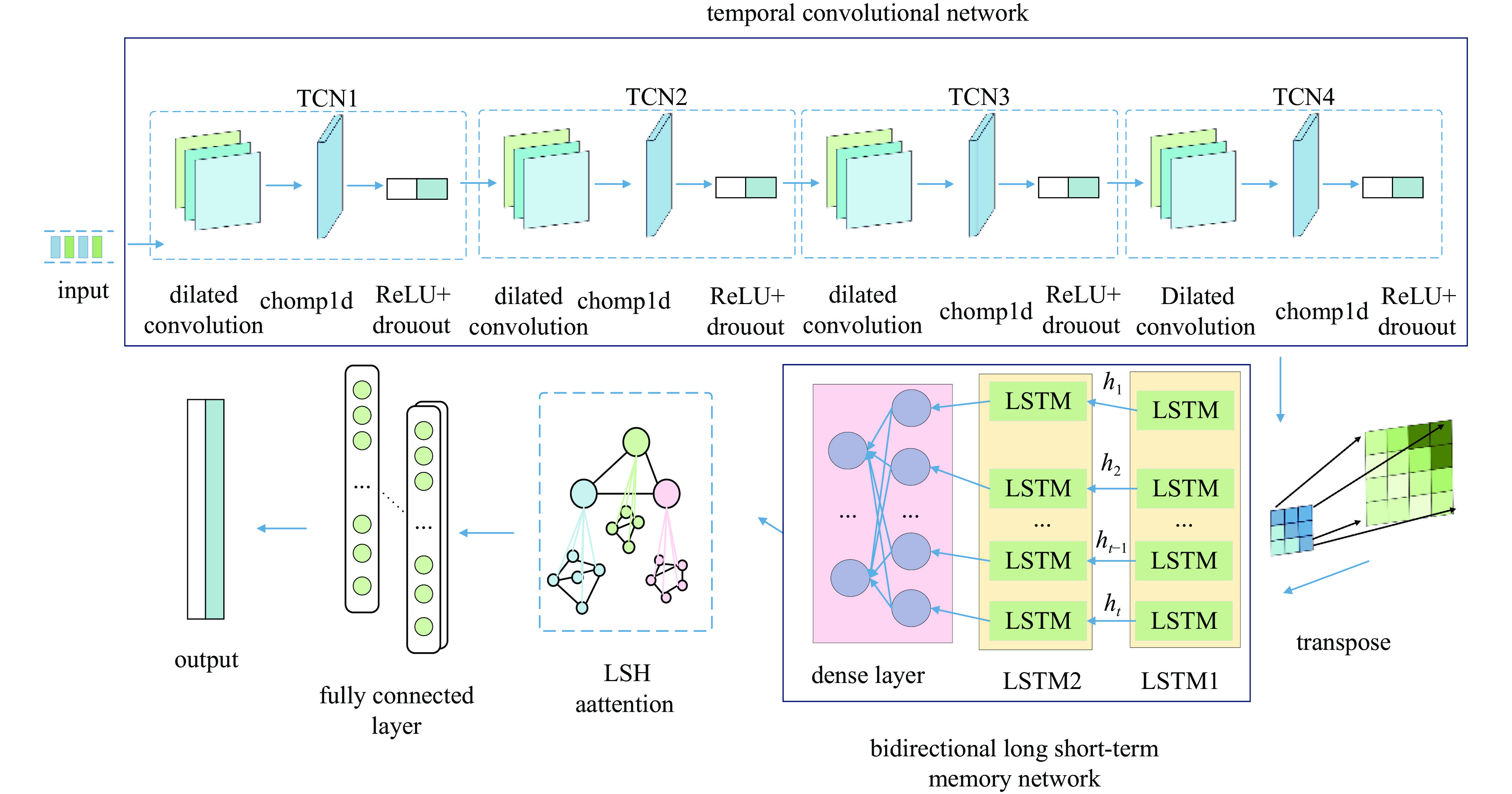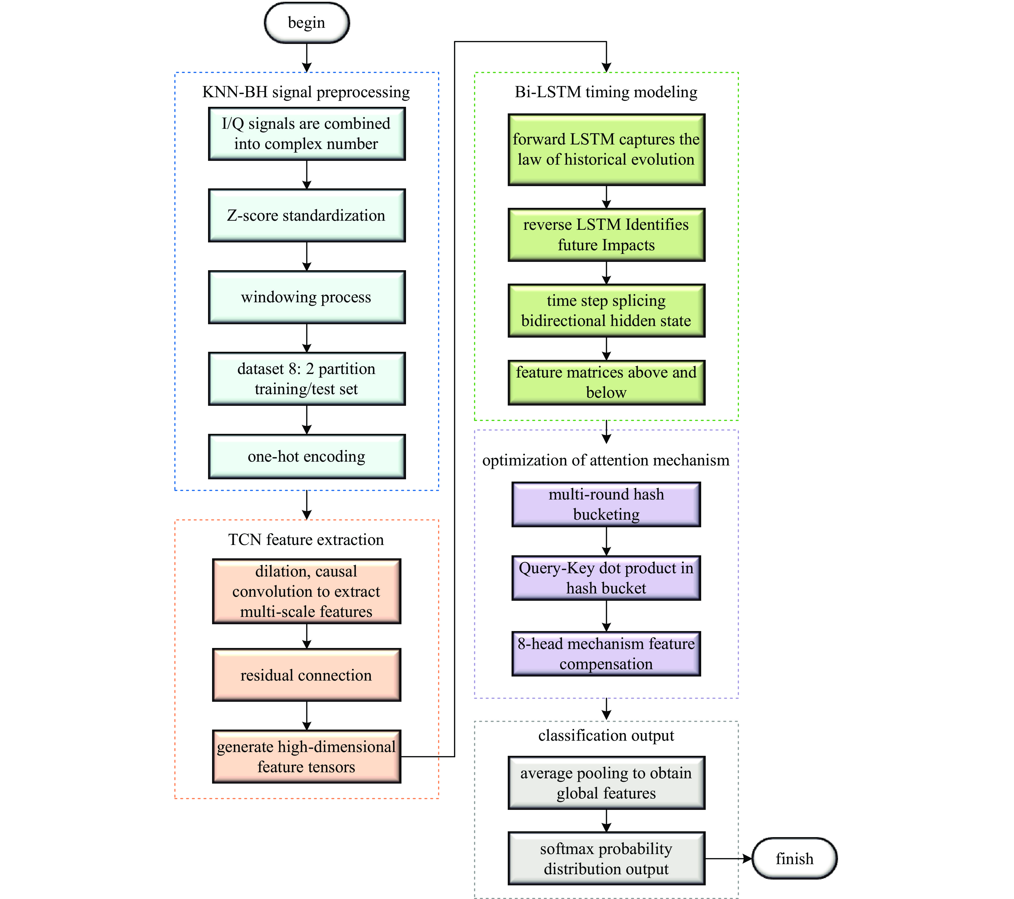 Firstly, Bi-LSTM is designed to capture the bidirectional dependency of time series data and enhance the discrimination ability for complex modulation modes. Secondly, TCN and Bi-LSTM are fused through a cascaded architecture to achieve hierarchical time series feature extraction and bidirectional dynamic modeling. Finally, LSH attention is added to reduce the complexity of the attention matrix while improving the recognition accuracy. In terms of data preprocessing, a KNN-BH processing method is proposed, which can improve the extraction accuracy of spectral features.