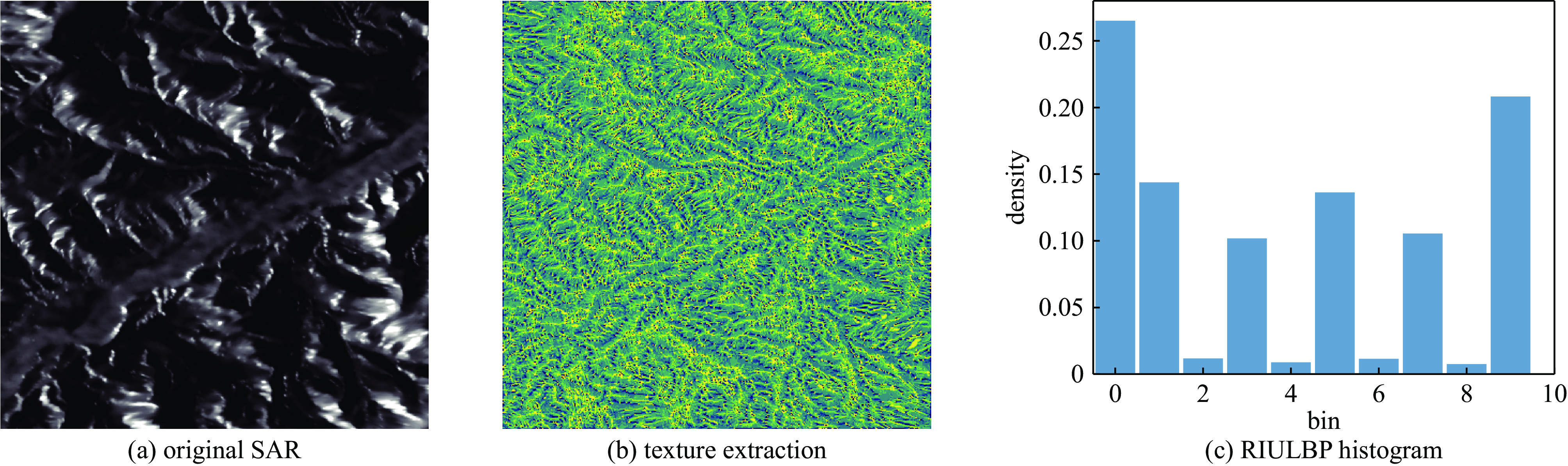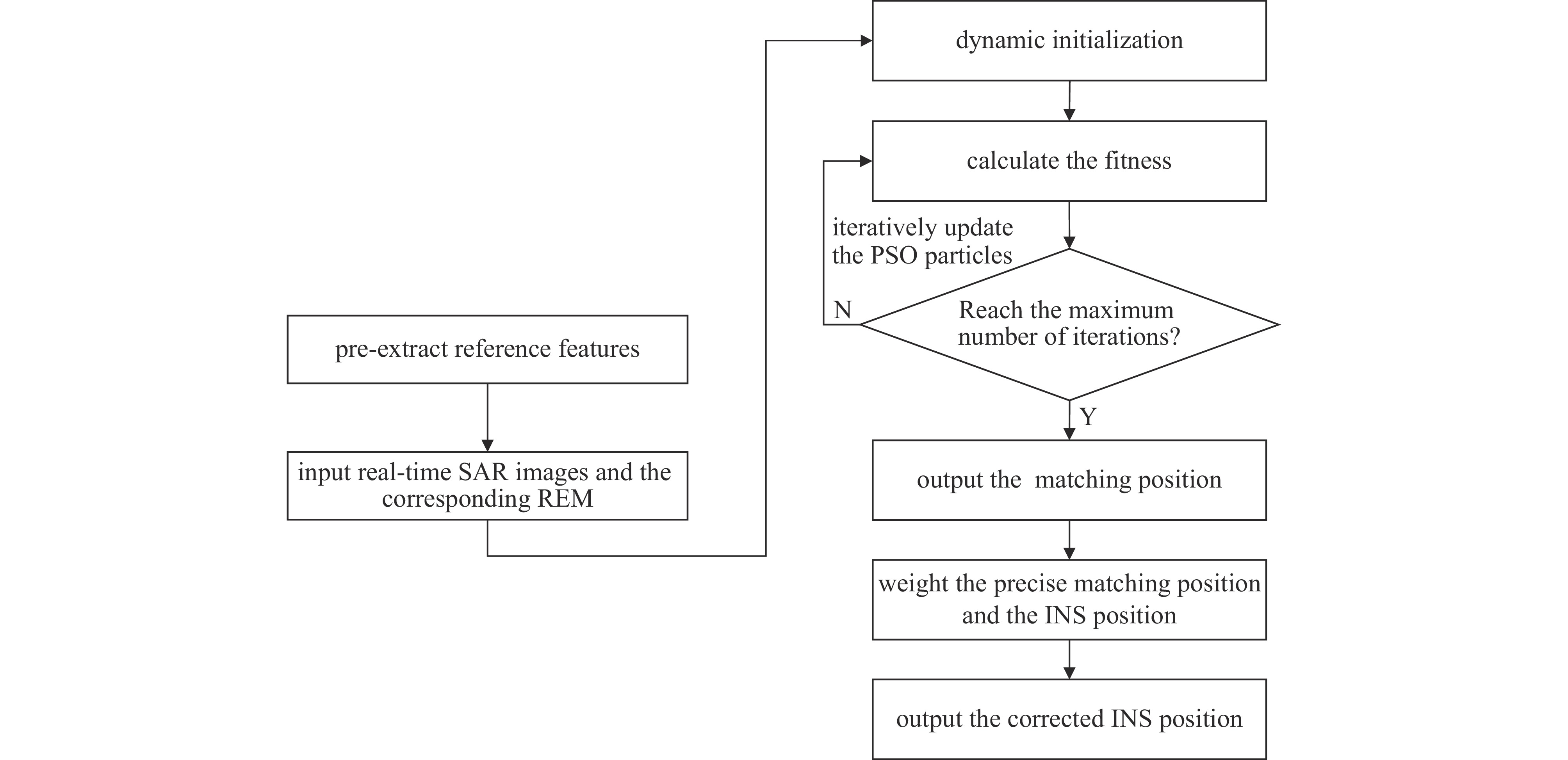 The proposed algorithm integrates a dual-modality feature fusion framework. Rotation Invariant Uniform Local Binary Pattern (RIULBP) features are extracted from Synthetic Aperture Radar (SAR) imagery to capture noise-resistant spatial textures, while Frequency Energy Distribution (FED) features are derived from Digital Elevation Models (DEM) to represent global terrain structure. A dynamic weighting method based on feature sensitivity is employed to fuse these heterogeneous features, with Z-score normalization used to standardize their scales. The fused Canberra distance serves as the similarity metric for terrain matching. Particle Swarm Optimization (PSO) replaces the conventional sliding-window search, enabling efficient identification of the optimal match within the search area.
