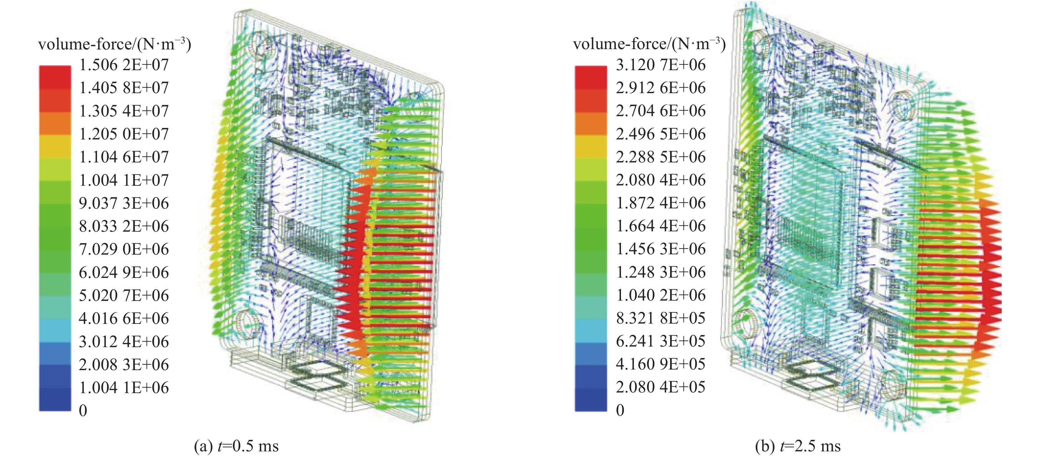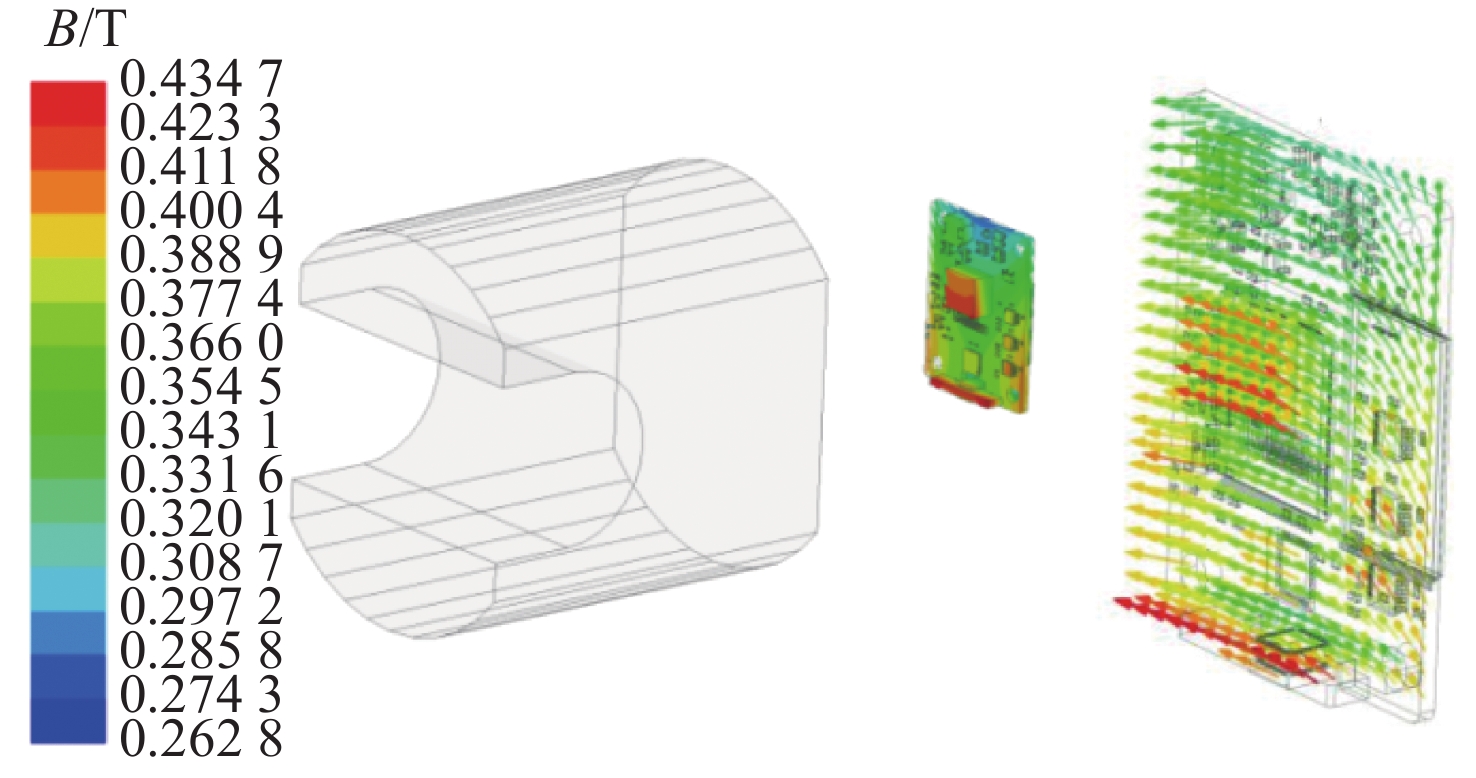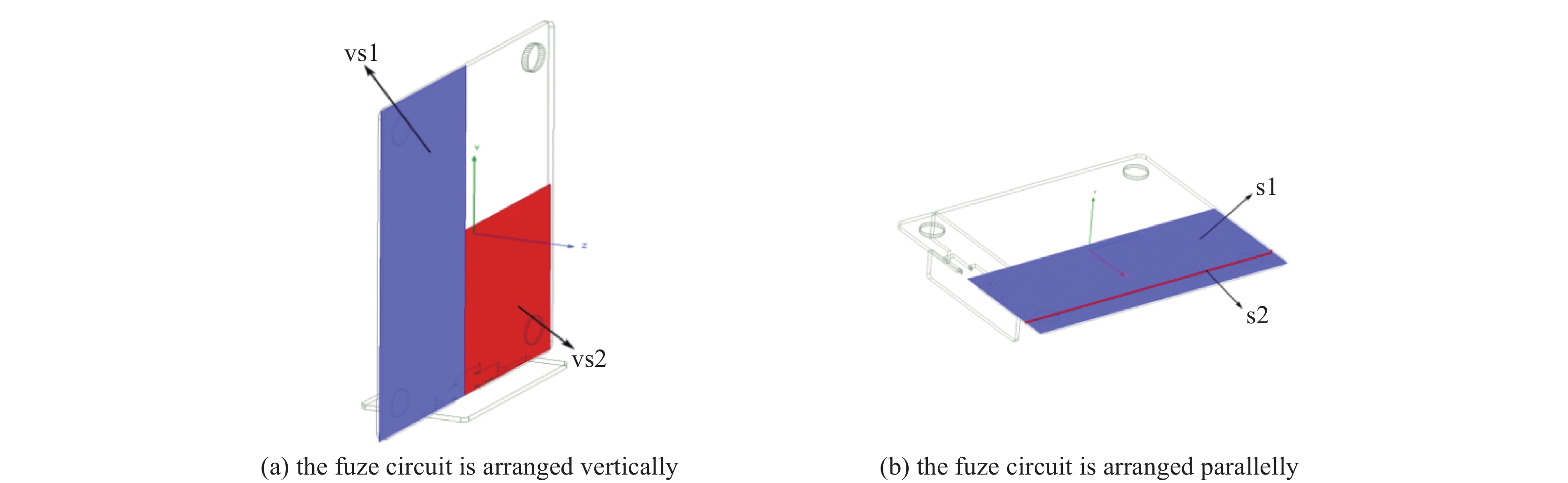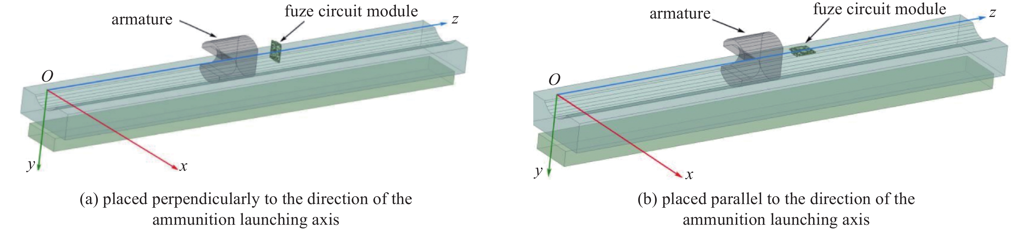 When the fuze circuit module is arranged parallel to the projectile axis, although the overall magnetic field strength is greater than when it is arranged perpendicular to the projectile axis, the peak magnetic field strength in the perpendicular arrangement covers an entire surface of the circuit board, whereas in the parallel arrangement, the peak magnetic field strength is only at the edge of the circuit module’s end. When the fuze circuit module is arranged parallel to the projectile axis, the induced eddy current, electromagnetic volume force density, and induced electromotive force are all significantly smaller than those in the perpendicular arrangement.
