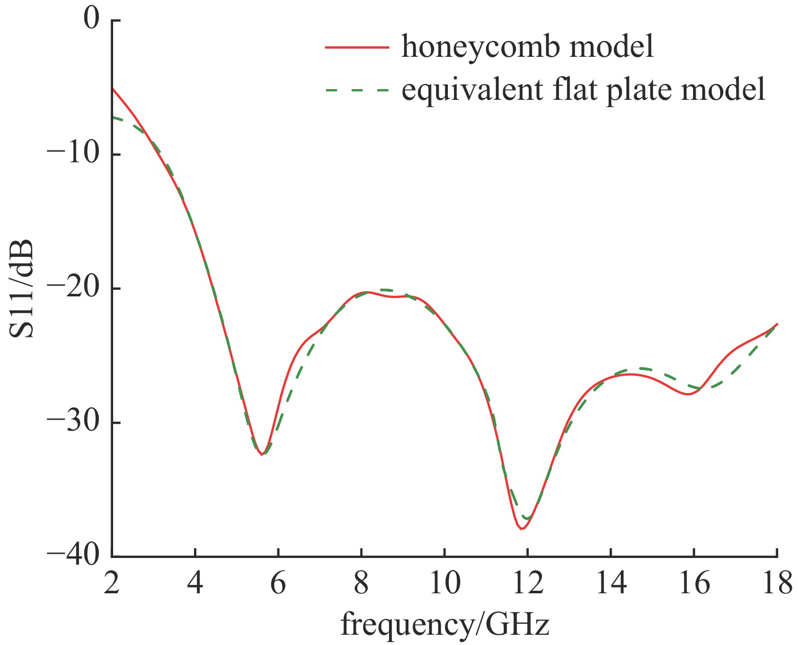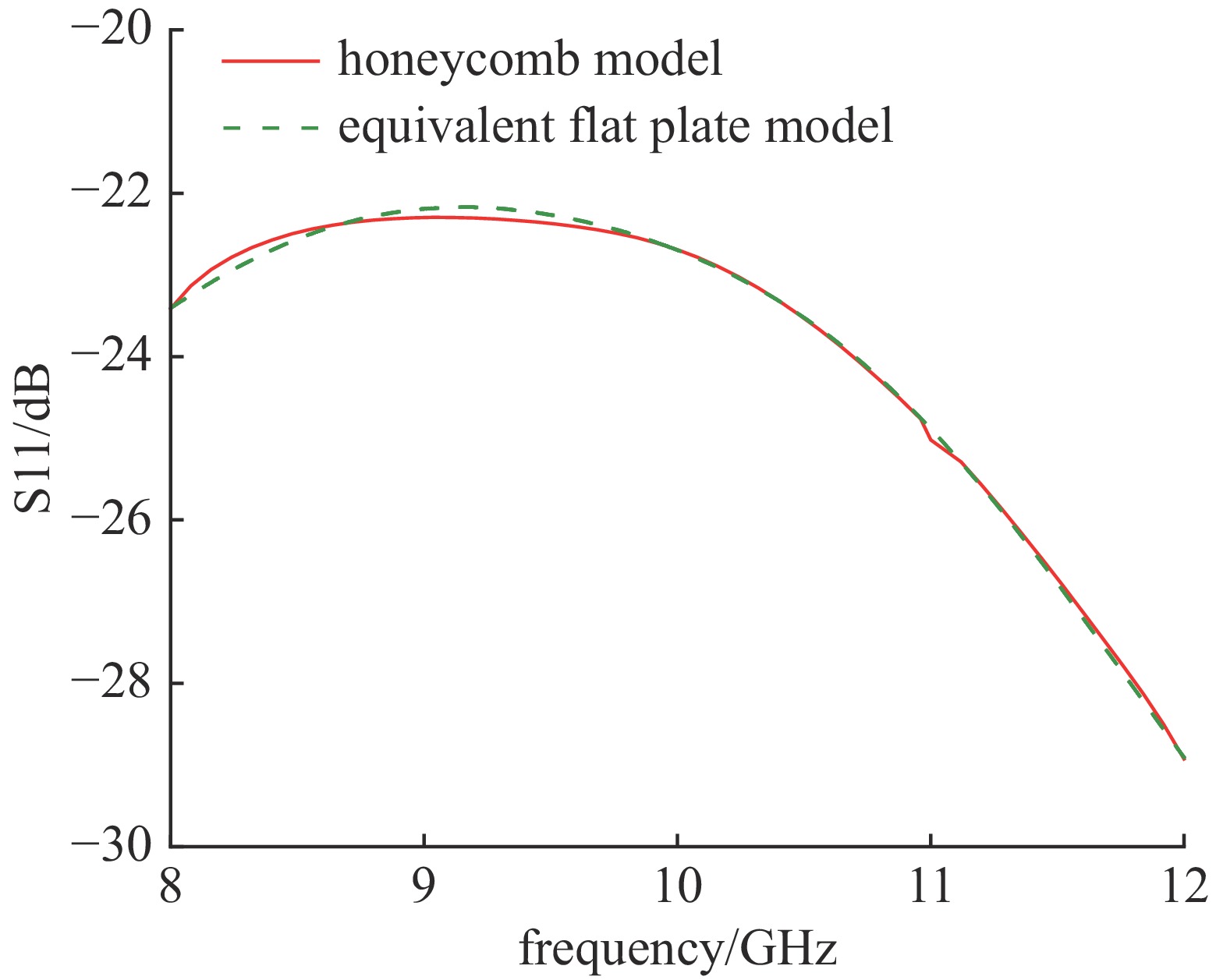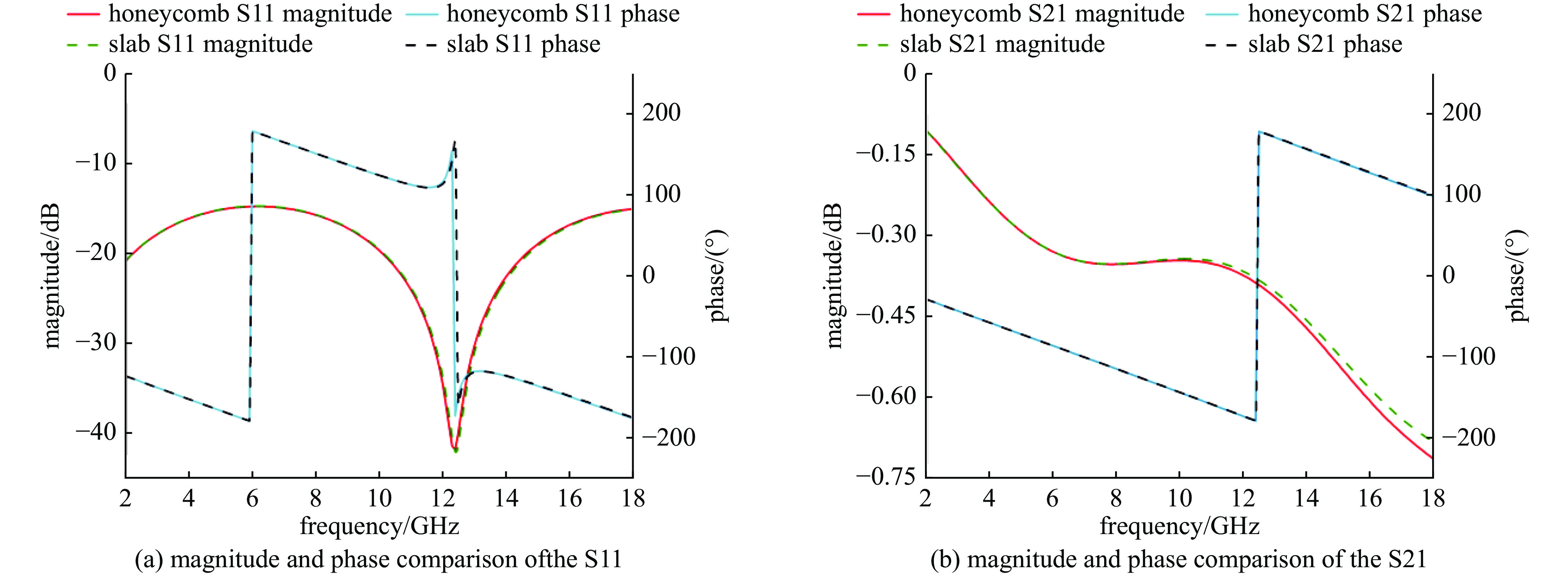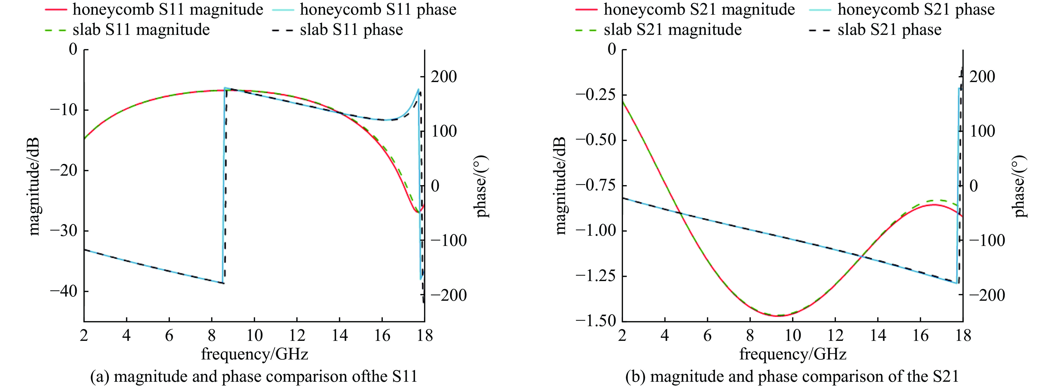 The simulated and measured scattering parameters of the honeycomb structure, both before and after equivalence, were compared and revealed a high degree of agreement. This result strongly validates the accuracy and feasibility of the proposed equivalent method.
