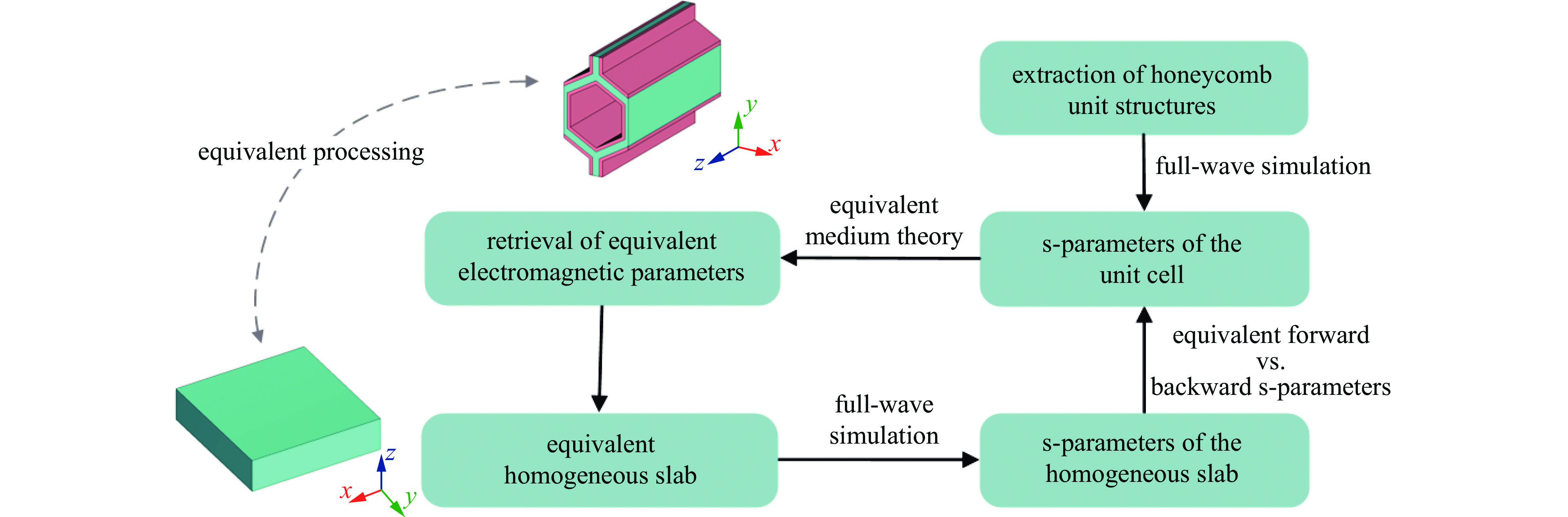 Using three-dimensional electromagnetic simulation software CST and a free-space measurement system, the modeling, simulation, and practical testing of the honeycomb structure and its equivalent flat plate were successfully accomplished. By varying the incident angle of the plane wave, the scattering parameters of the honeycomb model were obtained under both normal and oblique incidence conditions. Through an inversion procedure, the equivalent electromagnetic parameters corresponding to each incident condition were sequentially derived and subsequently applied to the equivalent homogeneous flat plate, thereby achieving the equivalency treatment of the honeycomb structure.