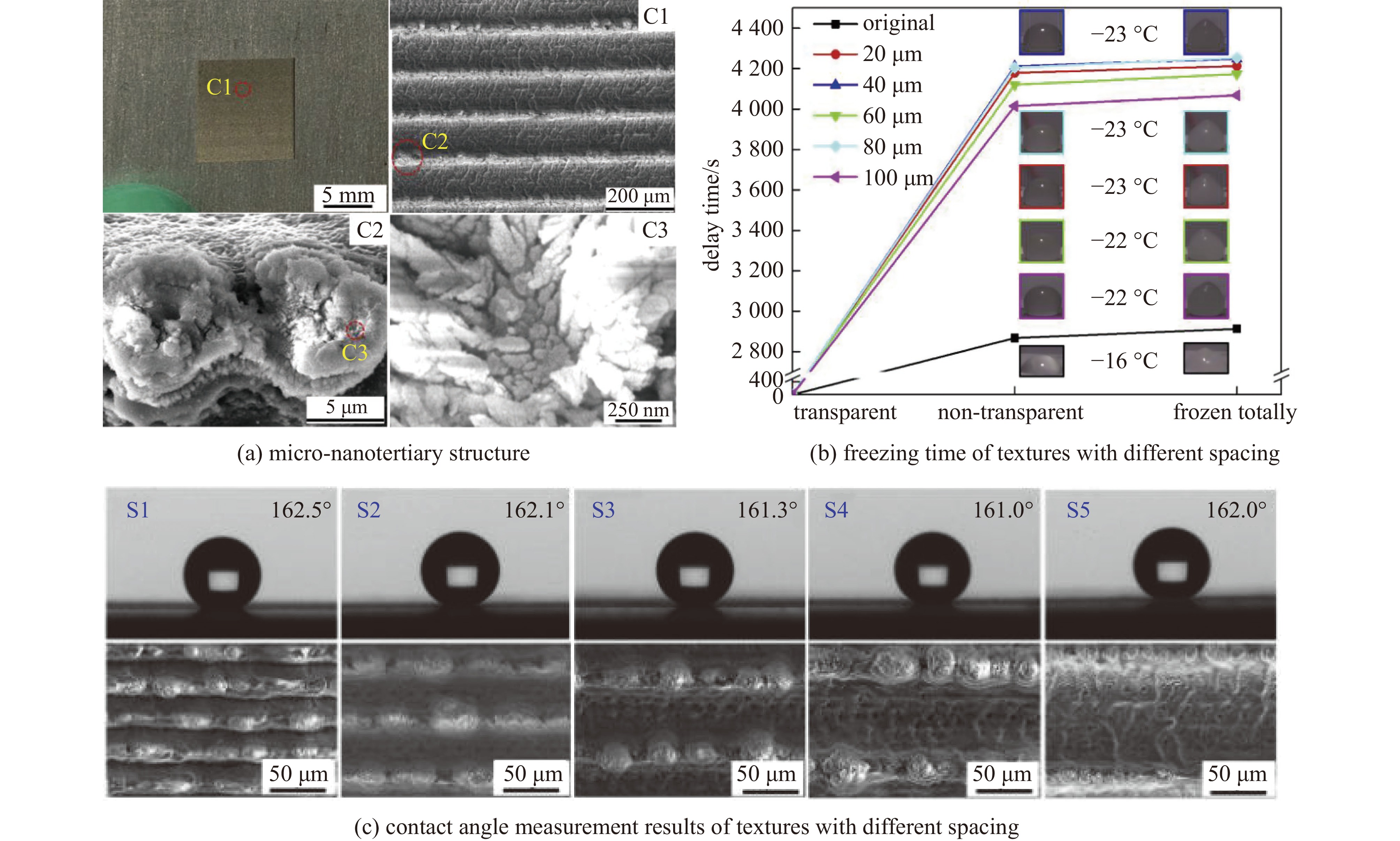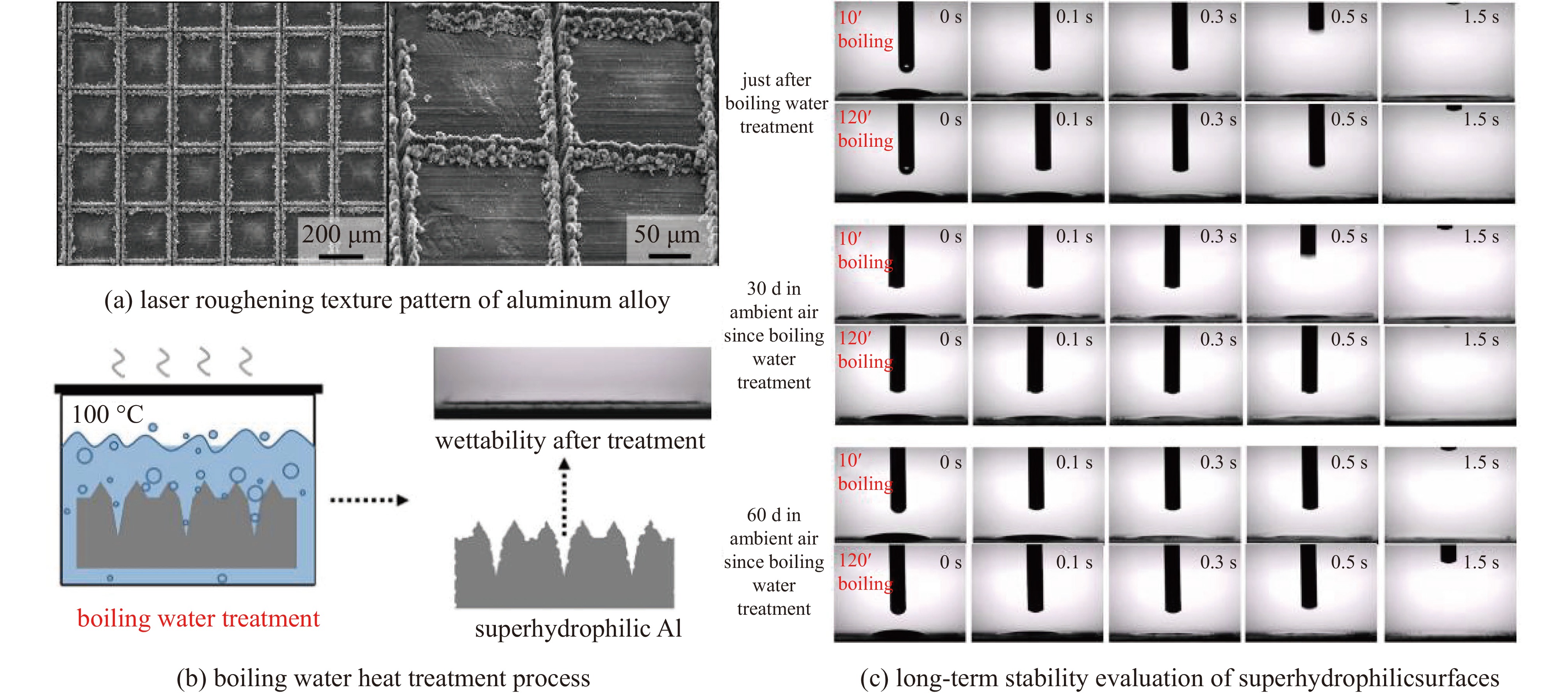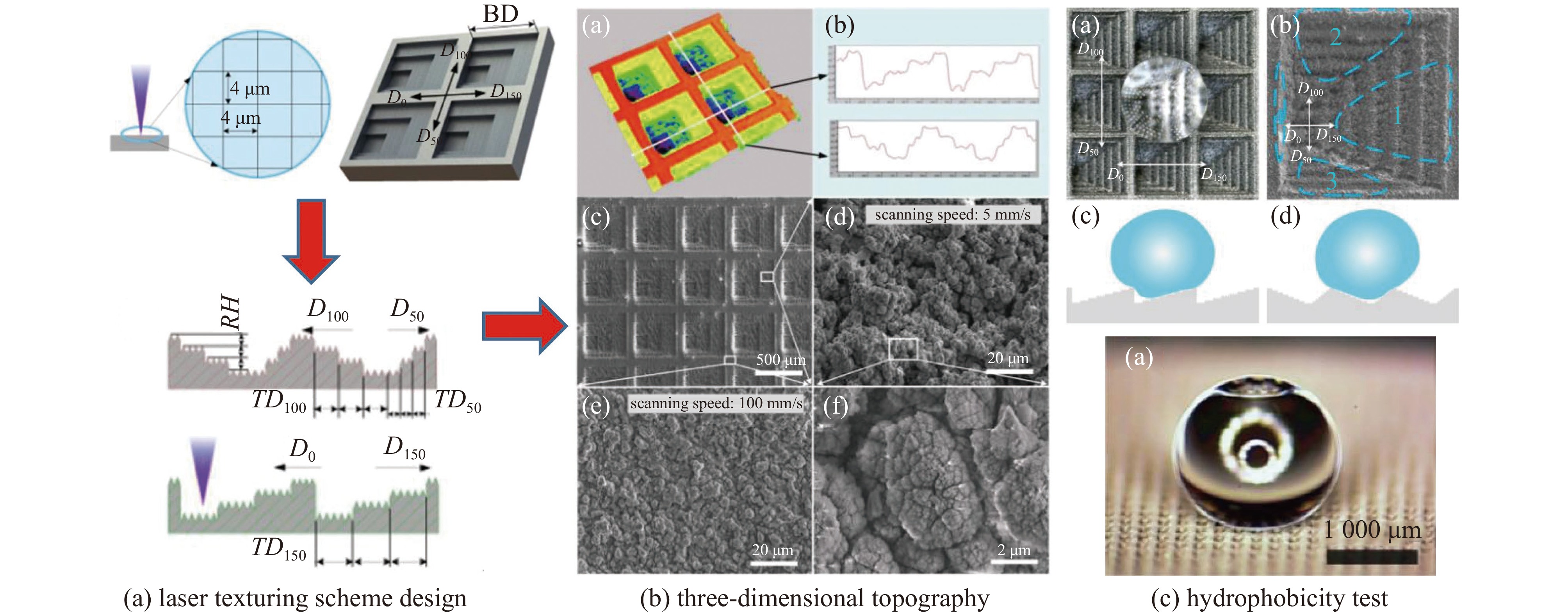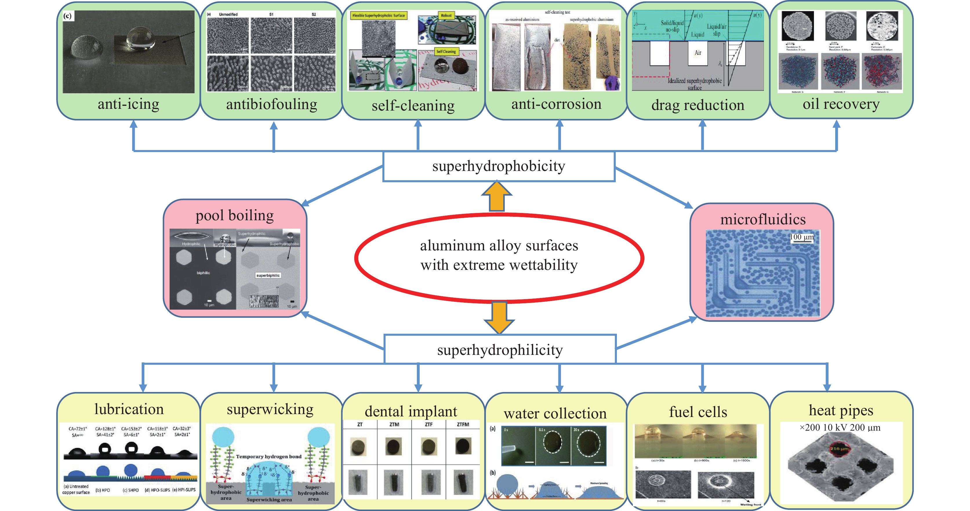 As a strategic material for lightweight design, aluminum alloys occupy an important position in the fields of marine equipment, aerospace, and transportation due to their low specific gravity, corrosion resistance, and good low-temperature properties. It is worth noting that surface wettability, as a key interface parameter for the functionalization of aluminum alloys, directly affects their engineering service performance. In recent years, surface wettability control technology based on laser texturing has broken through the limitations of traditional chemical modification and provided new ideas for the functionalization of aluminum alloy surfaces. This article systematically explains the basic theoretical system of wettability, including the Young model, the Wenzel model, and the Cassie-Baxter model, and analyzes the differences in the application of ultrashort pulse lasers and long pulse laser systems in the construction of biomimetic functionalization of aluminum alloy surfaces. Among them, ultrashort pulse lasers (femtosecond/picosecond) can achieve submicron-level precision texturing due to their extremely short pulse width and ultra-high peak power, while long pulse lasers have advantages in large-area processing efficiency. Research has shown that these functionalized surfaces exhibit significant advantages in areas such as surface self-cleaning, low-temperature anti-icing, Cl− corrosion resistance, efficient boiling heat transfer, bonding, and microfluidics. However, their practical application is still limited by key technical bottlenecks such as wetting stability degradation and insufficient environmental tolerance.